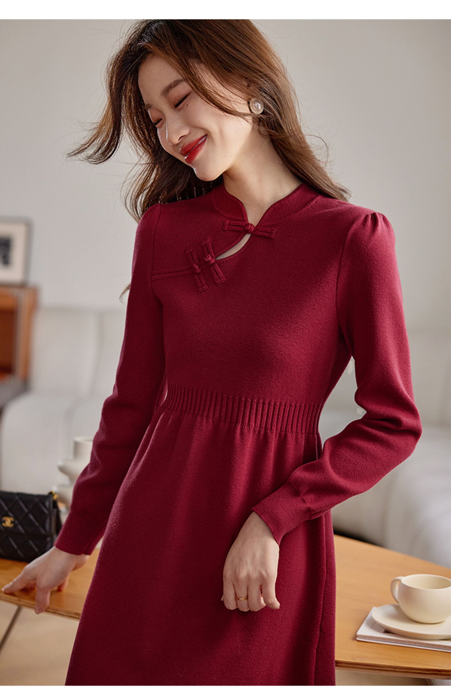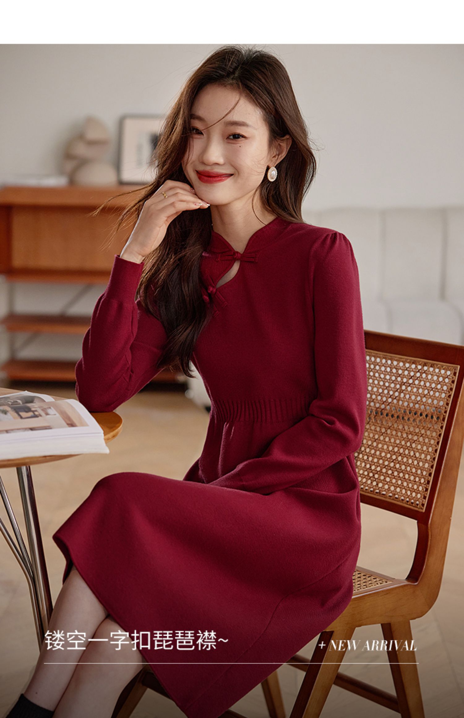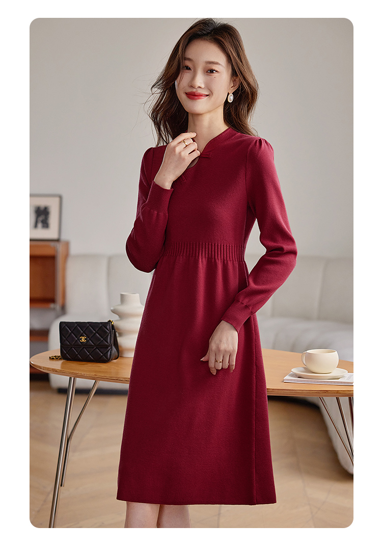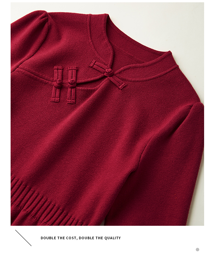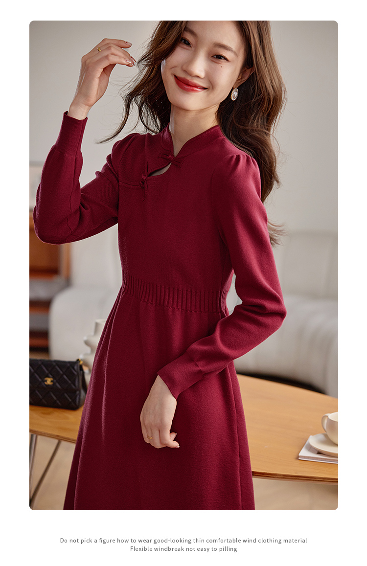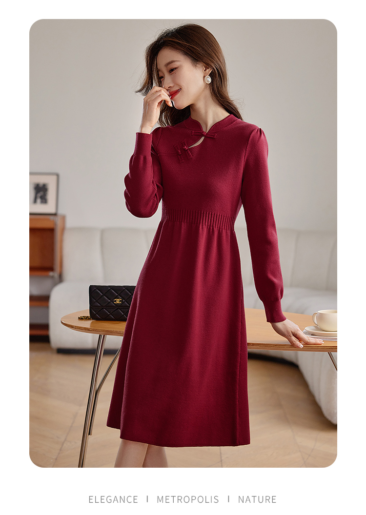 【年终特卖】熙世界红色旗袍式针织连衣裙秋冬新中式盘扣毛衣裙子