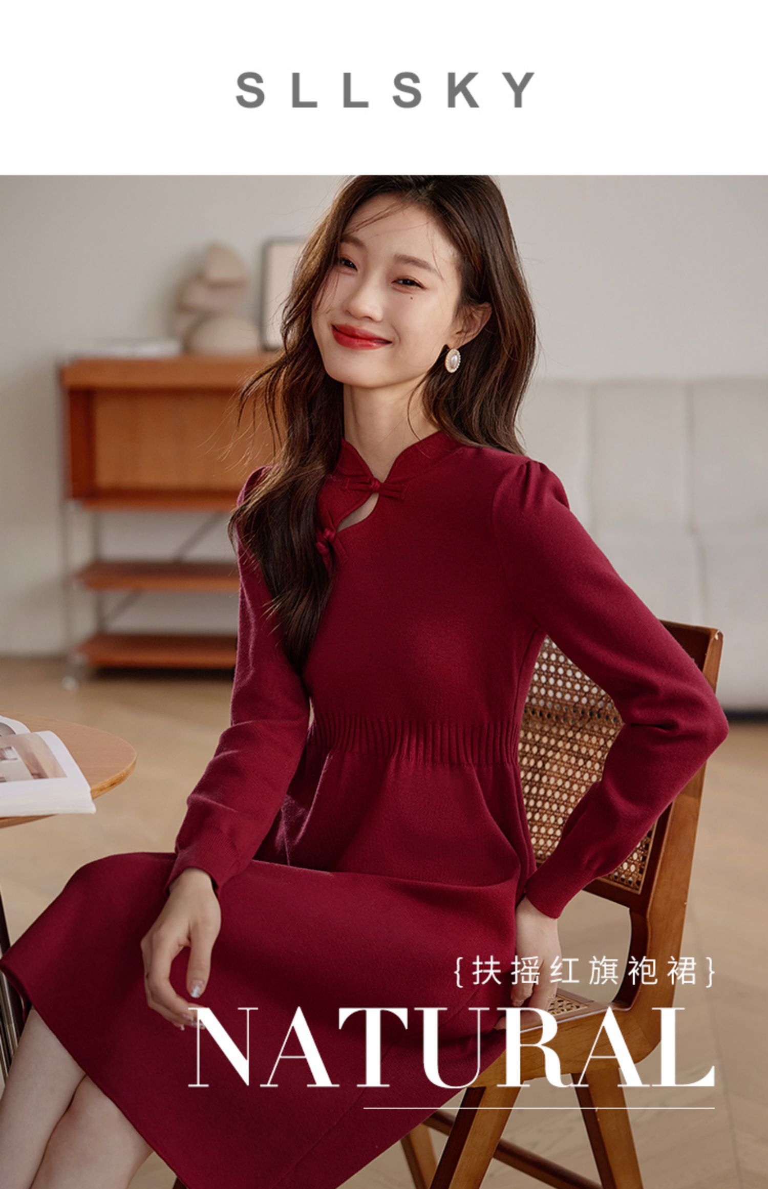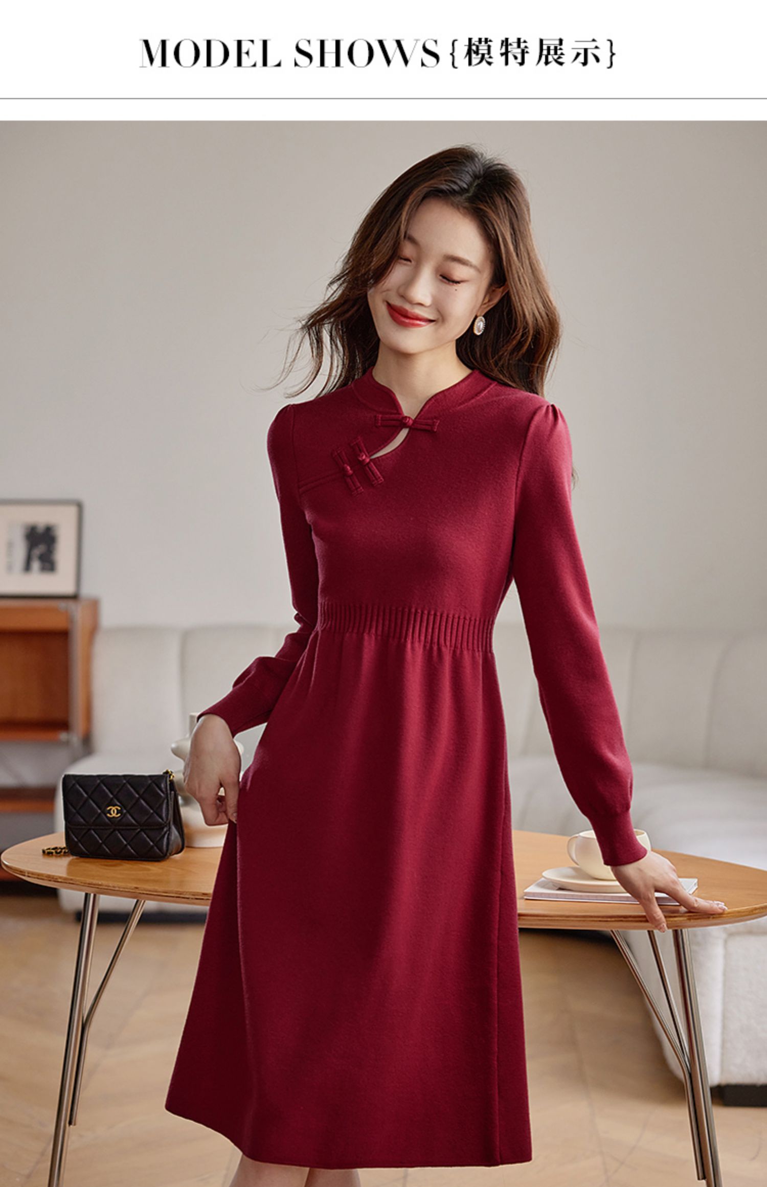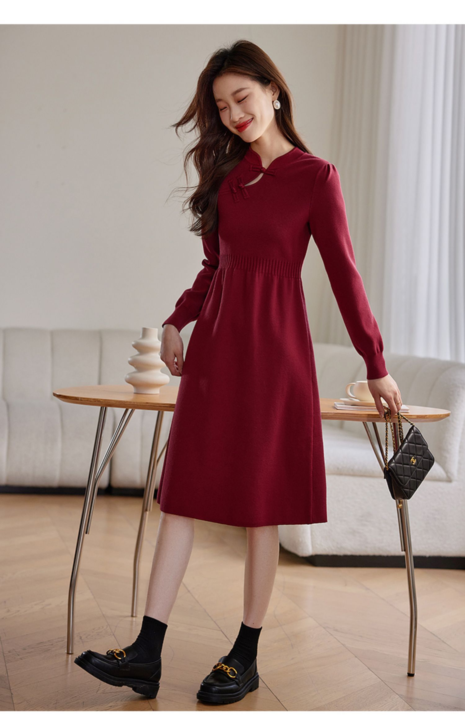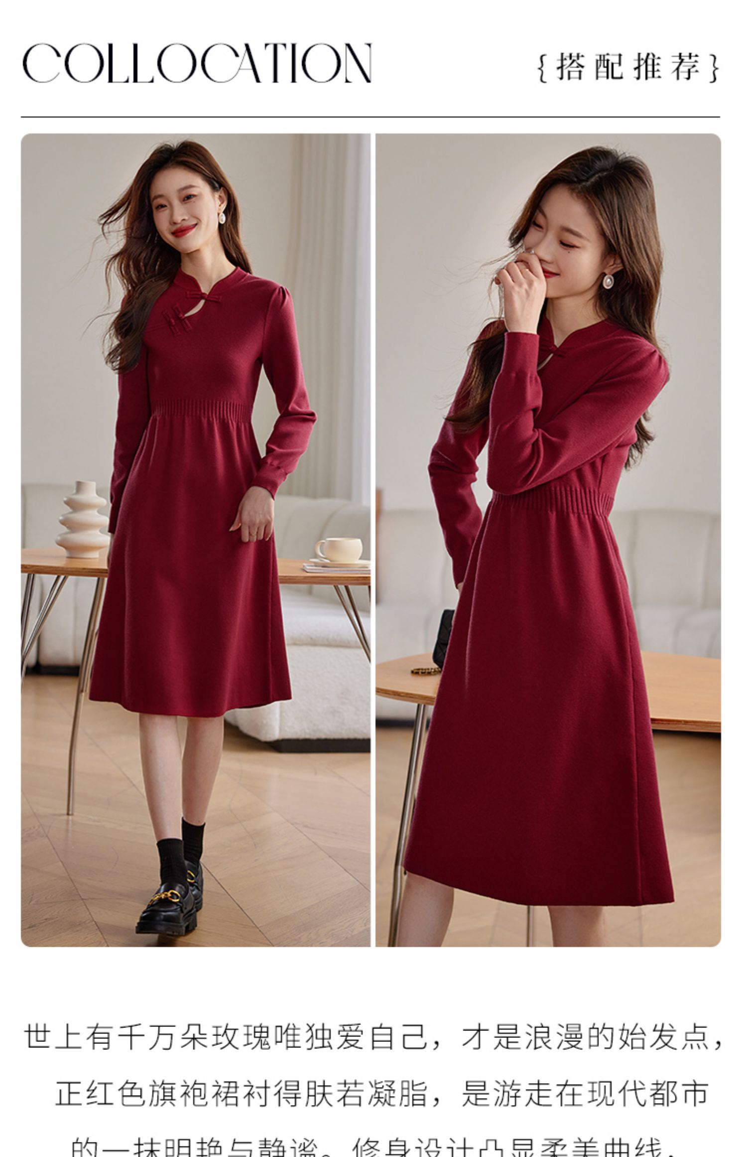 【年终特卖】熙世界红色旗袍式针织连衣裙秋冬新中式盘扣毛衣裙子