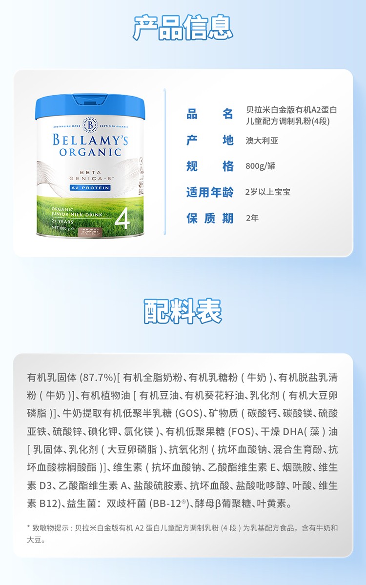 【跨境商品】金华仓发 |澳洲贝拉米Bellamy‘s Organic白金版有机A2奶粉4段800g,效期至2027年10月(新老包装随机发货) |(报关后不支持退换货,介意慎拍)
