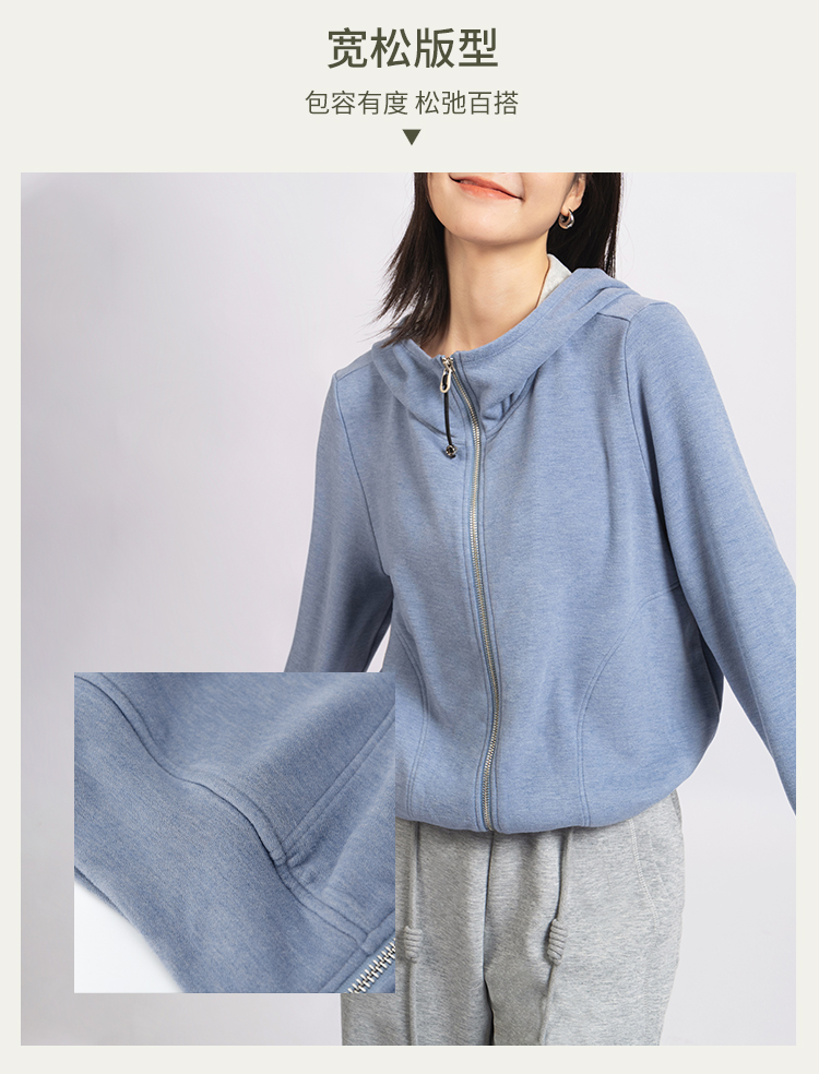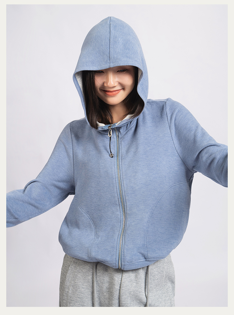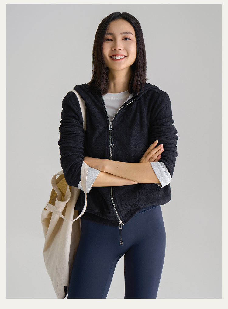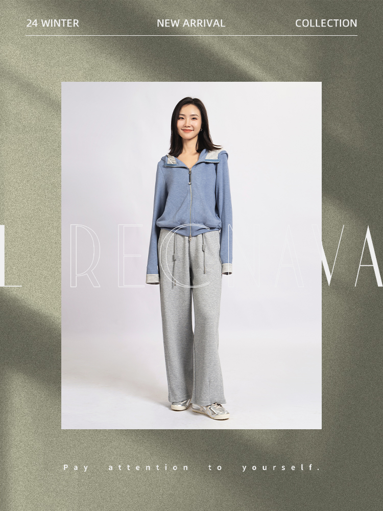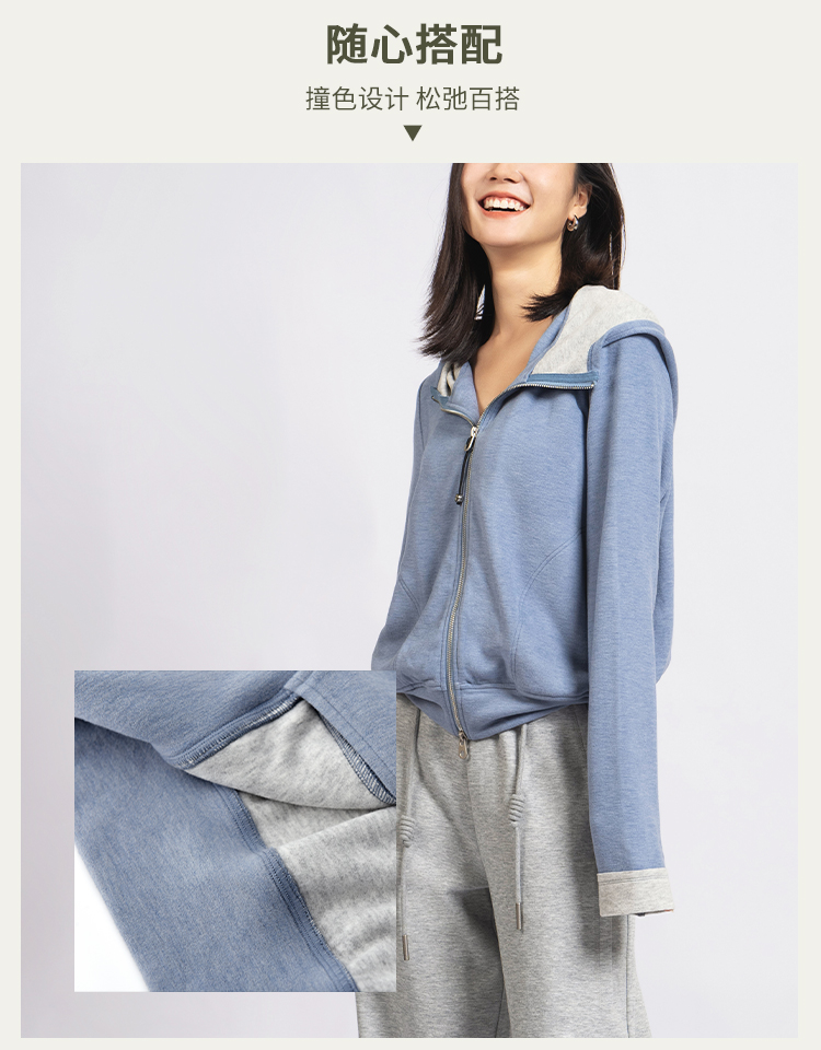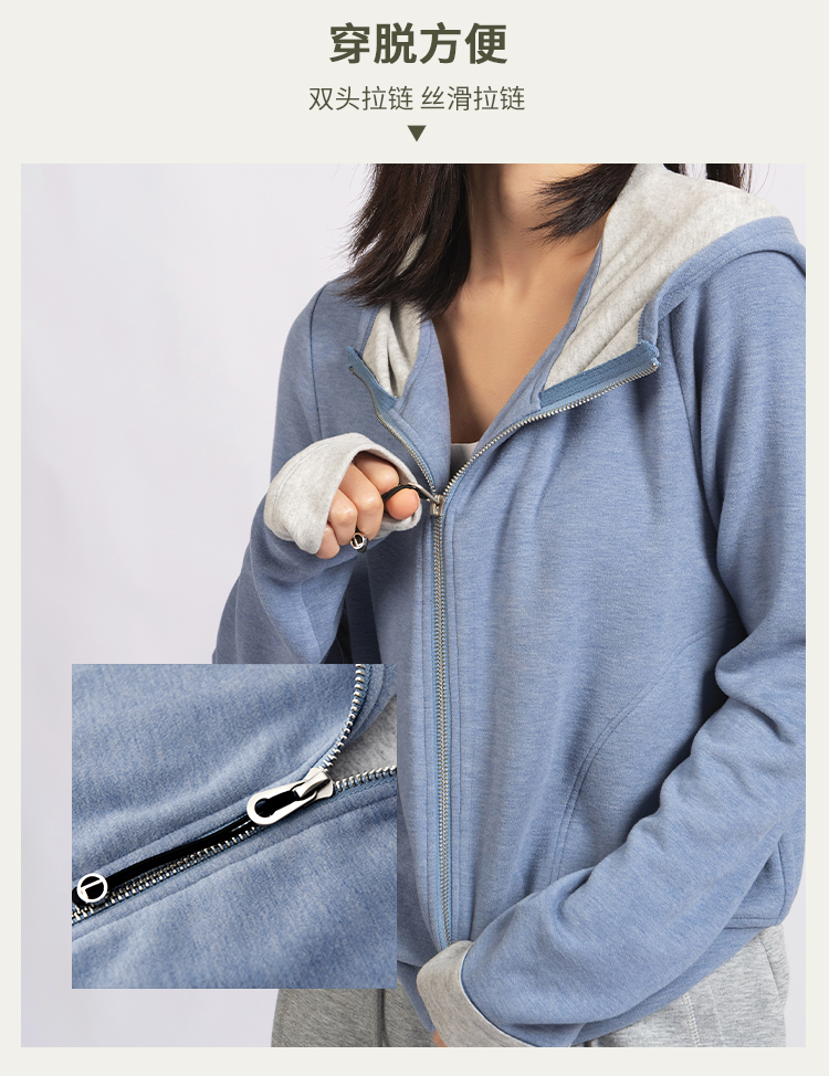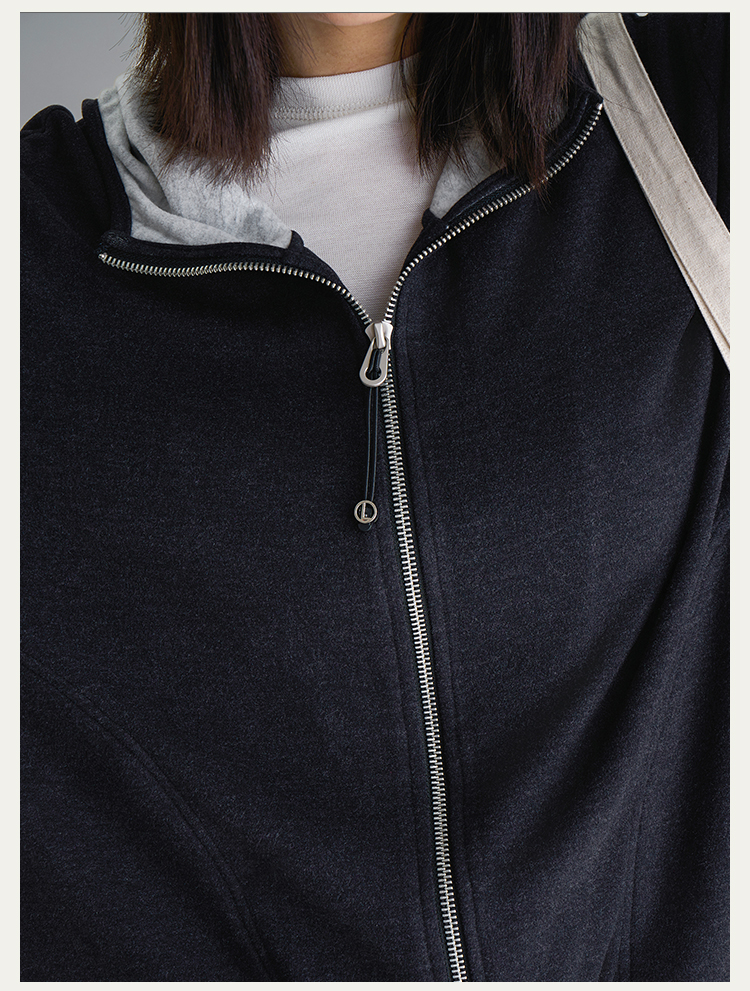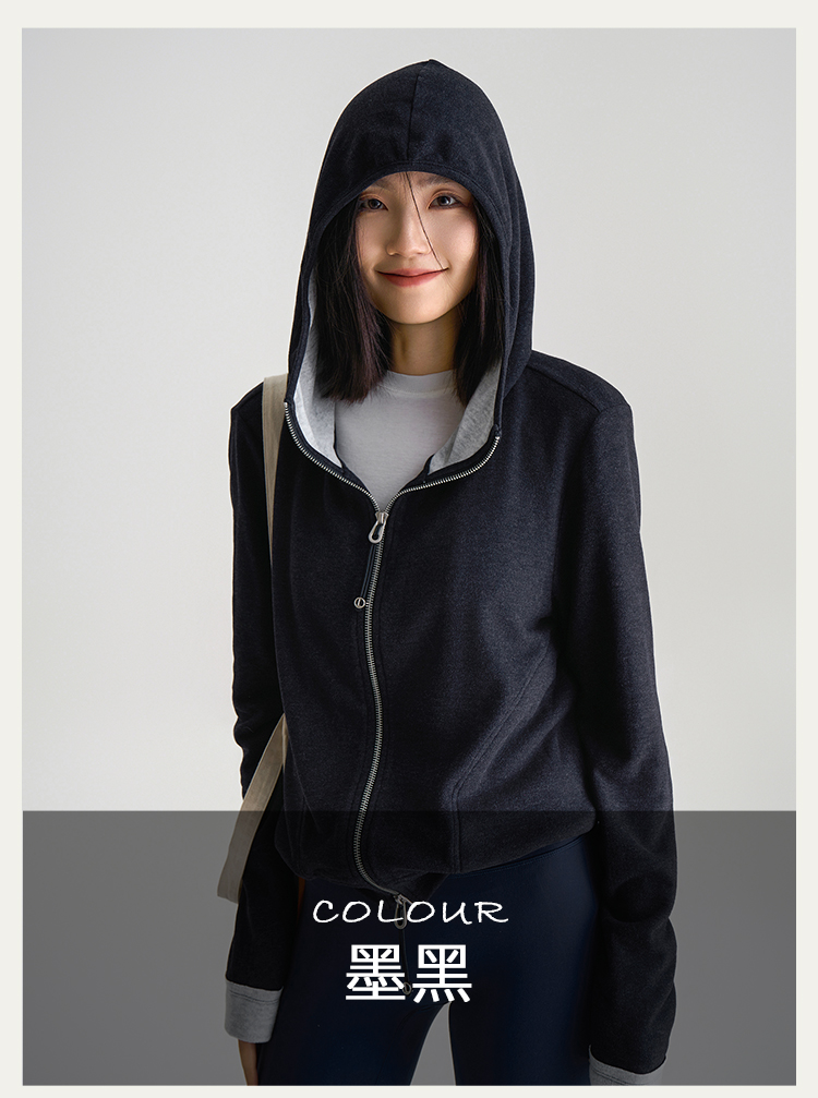 L RECNAVA [高弹柔软拉绒] 正肩连帽卫衣 袖口撞色拉链外套