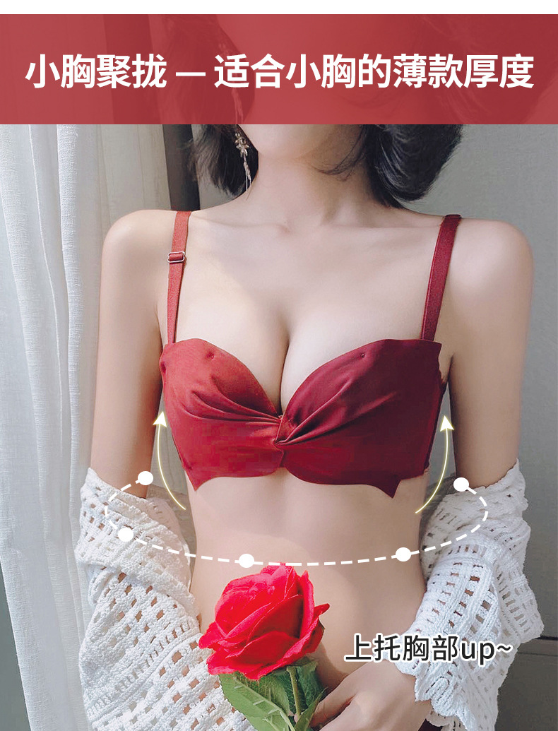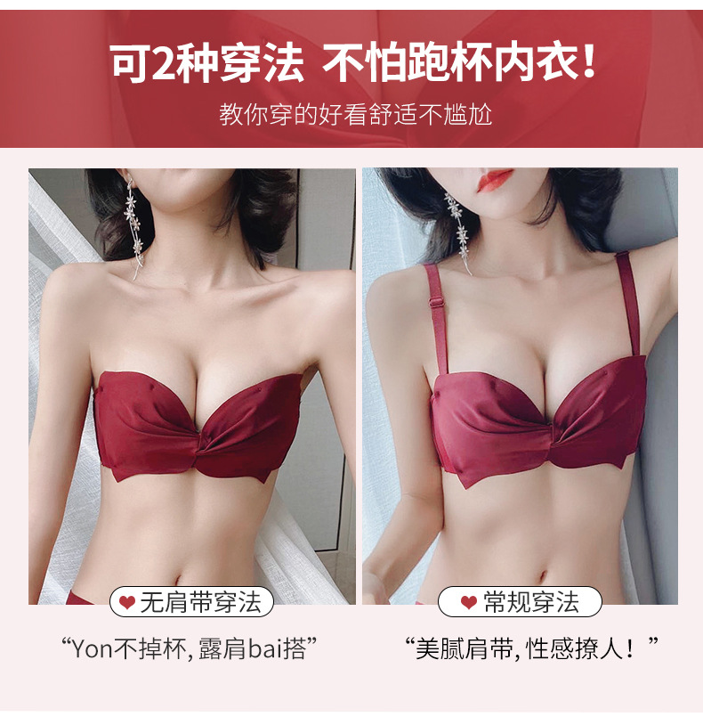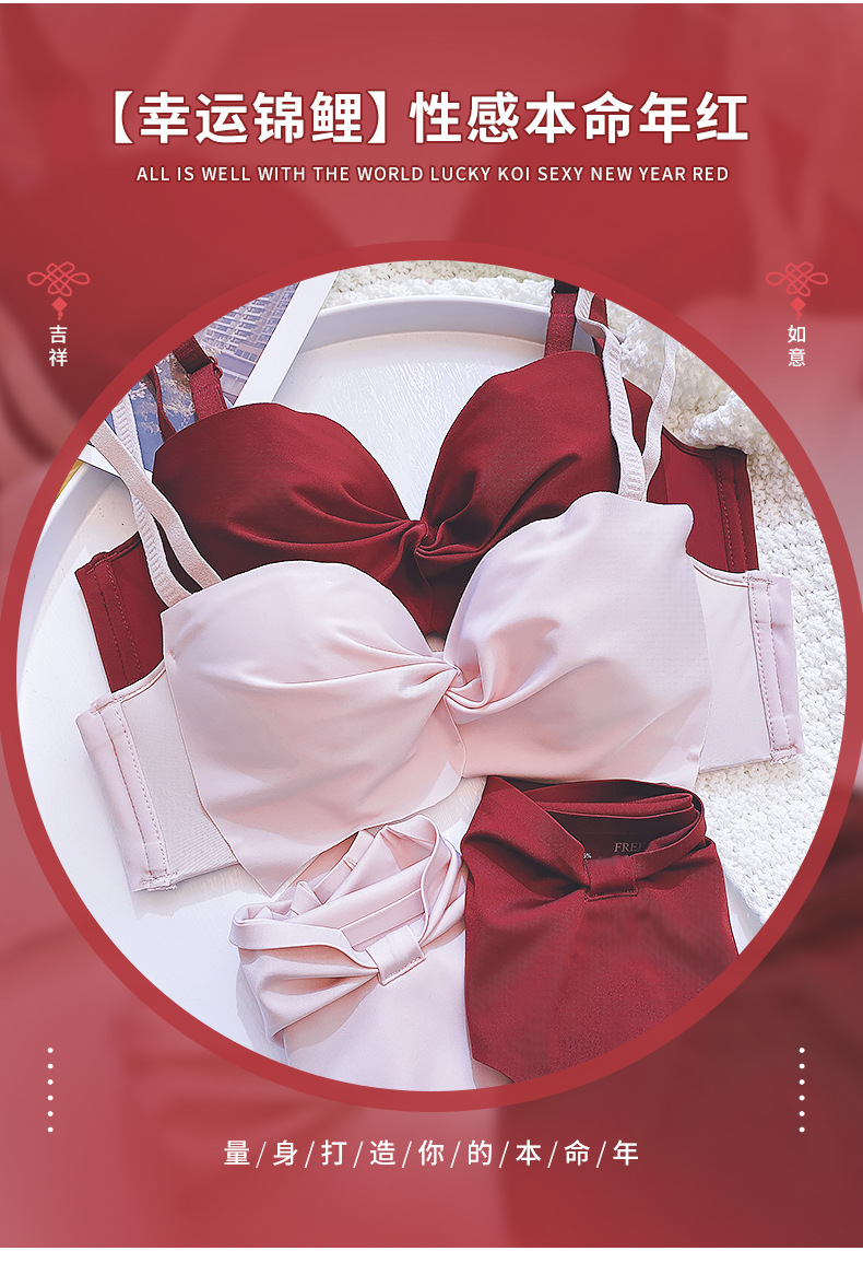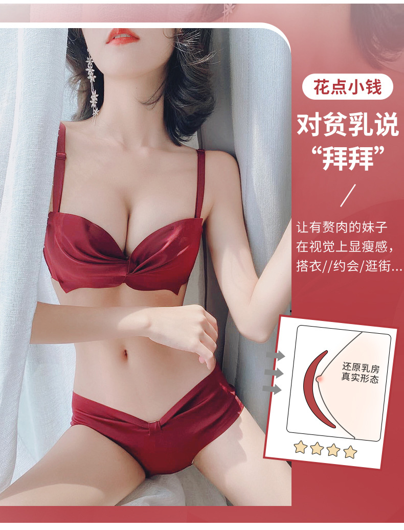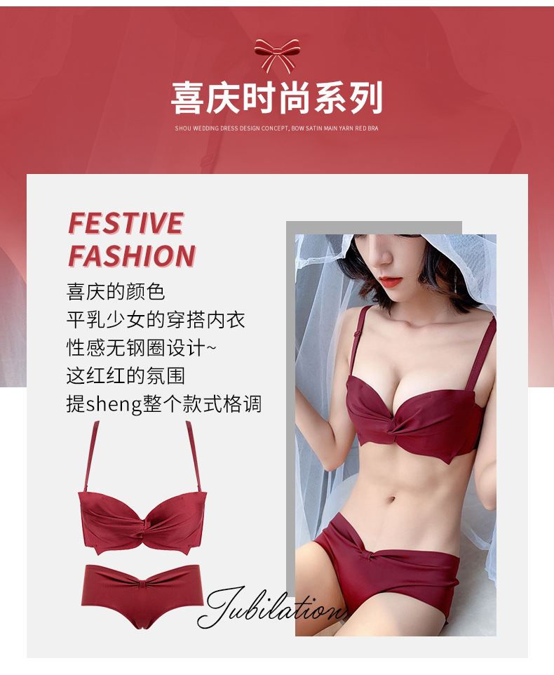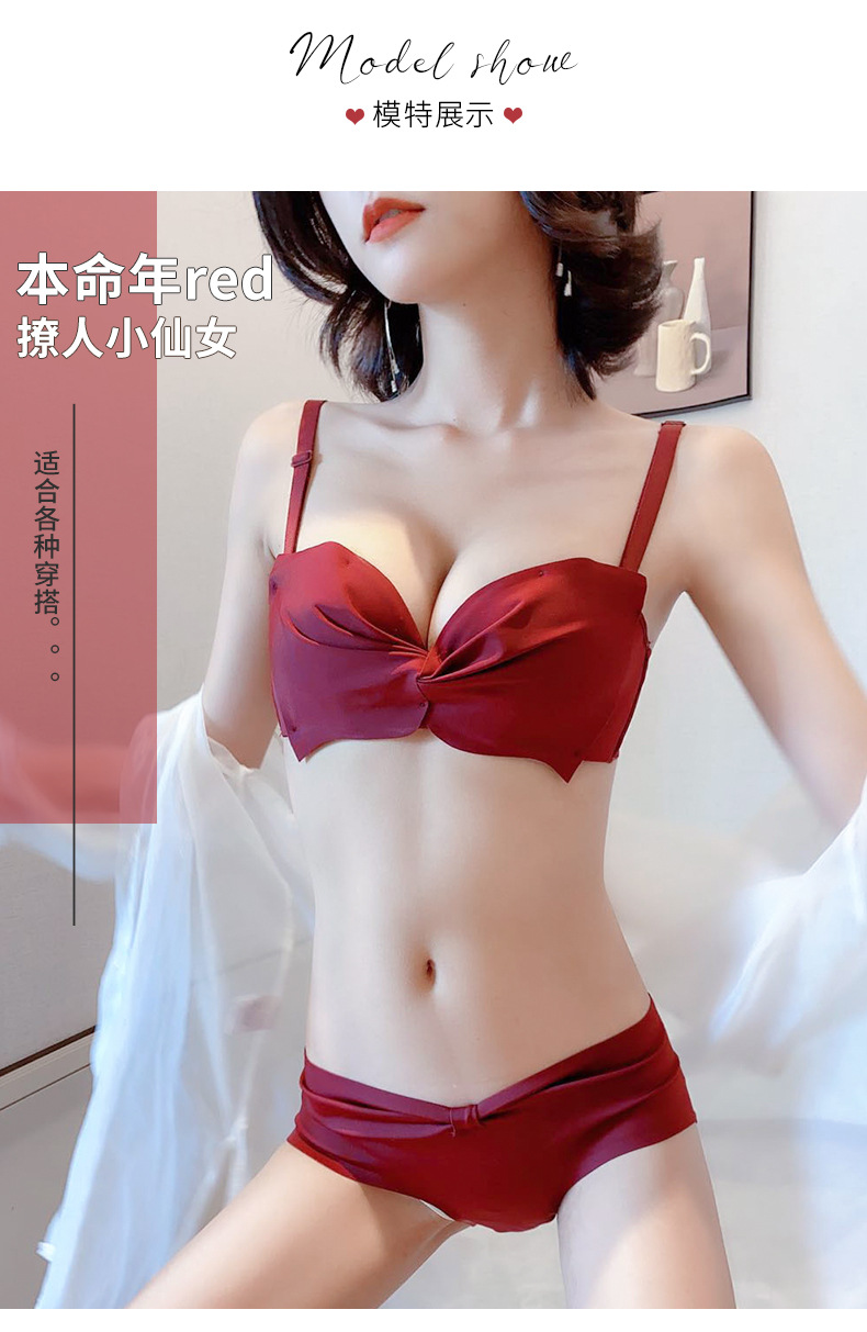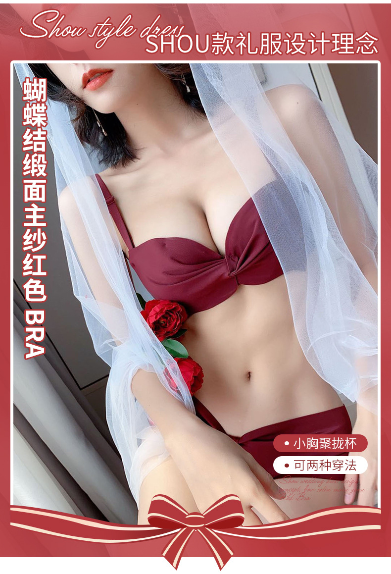 抹胸本命年牛内衣裤女酒红色结婚新娘小胸聚拢无钢圈文胸罩套装厚