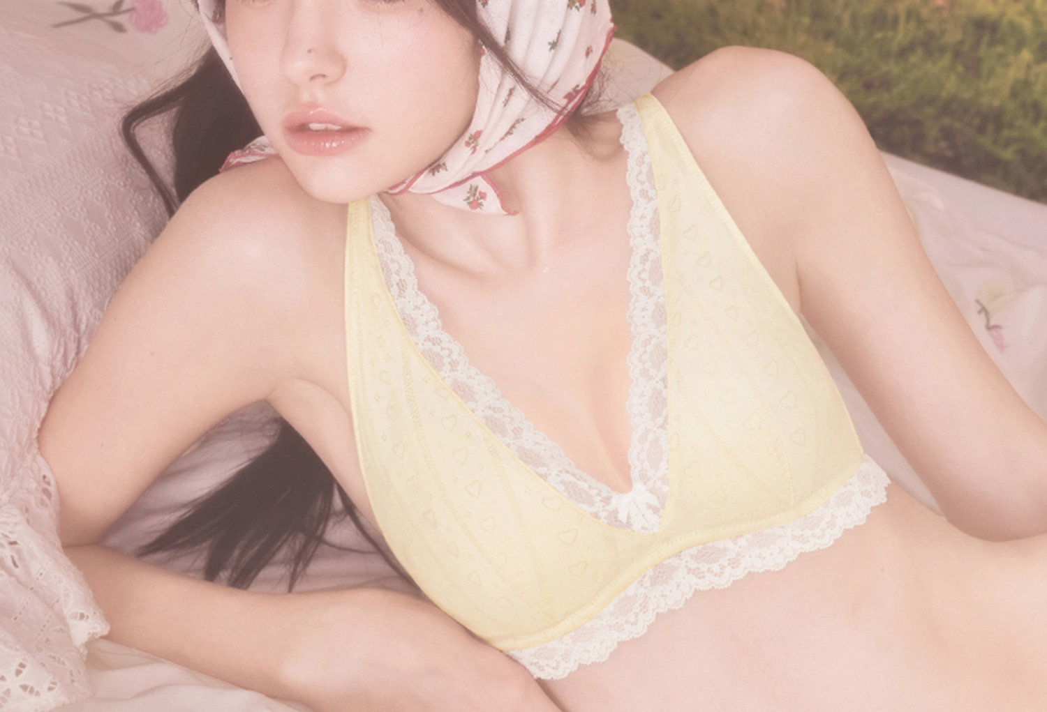 好奇蜜斯法式内衣女纯欲文胸罩套装大胸显小胸无钢圈26夏三角杯黄-玛丽恩