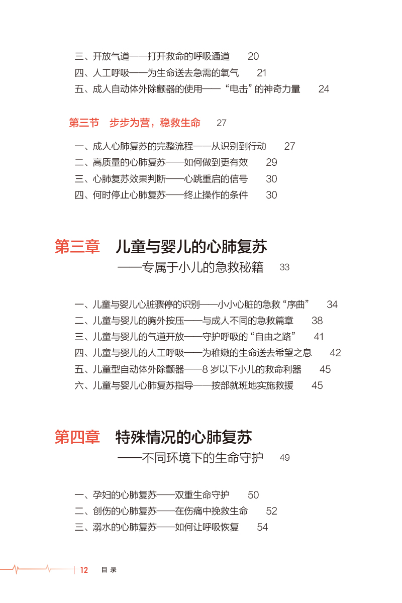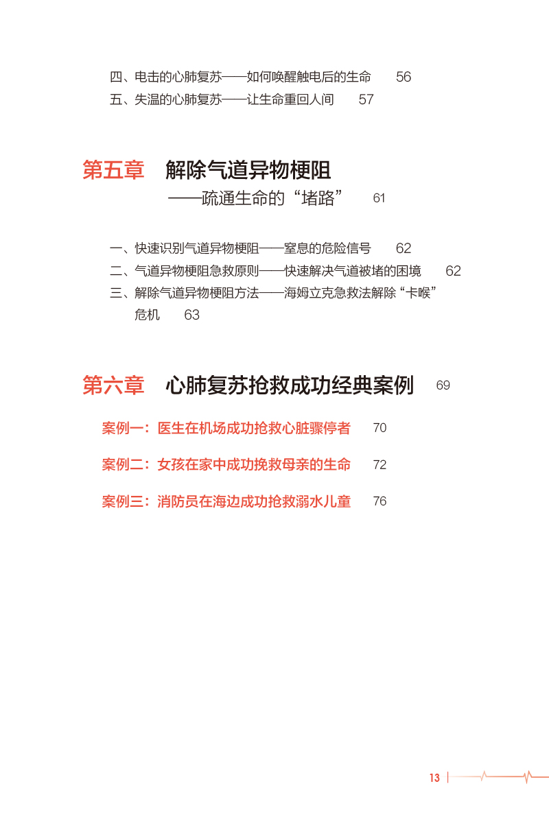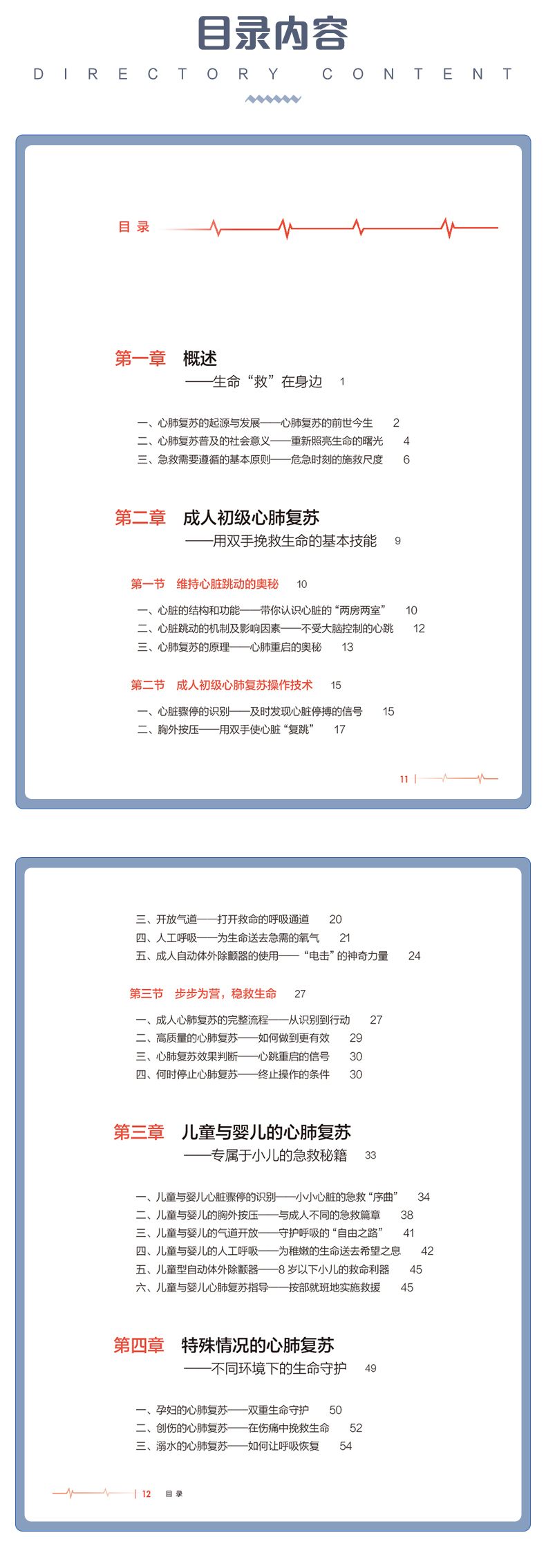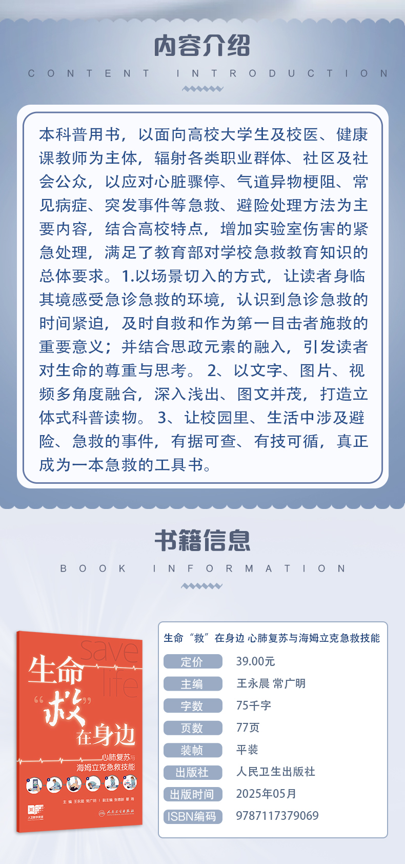 本科普用书,以面向高校大学生及校医、健康课教师为主体,辐射各类职业群体、社区及社会公众,以应对心脏骤停、气道异物梗阻、常见病症、突发事件等急救、避险处理方法为主要内容,结合高校特点,增加实验室伤害的紧急处理,满足了**对学校急救教育知识的总体要求。1.以场景切入的方式,让读者身临其境感受急诊急救的环境,认识到急诊急救的时间紧迫,及时自救和作为**目击者施救的重要意义;并结合思政元素的融入,引发读者对生命的尊重与思考。 2、以文字、图片、视频多角度融合,深入浅出、图文并茂,打造立体式科普读物。 3、让校园里、生活中涉及避险、急救的事件,有据可查、有技可循,真正成为一本急救的工具书。