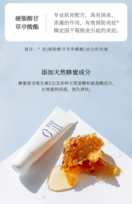 不仅是这两主成分,还有最强辅助 角鲨浣:补充油脂、保湿剂一枚 维生素E:增加唇部营养,提高皮肤弹性 蜂蜜:延缓皮肤细胞衰老,减轻唇纹,滋润修护 都是经过精心配比,效果不用多说❗️