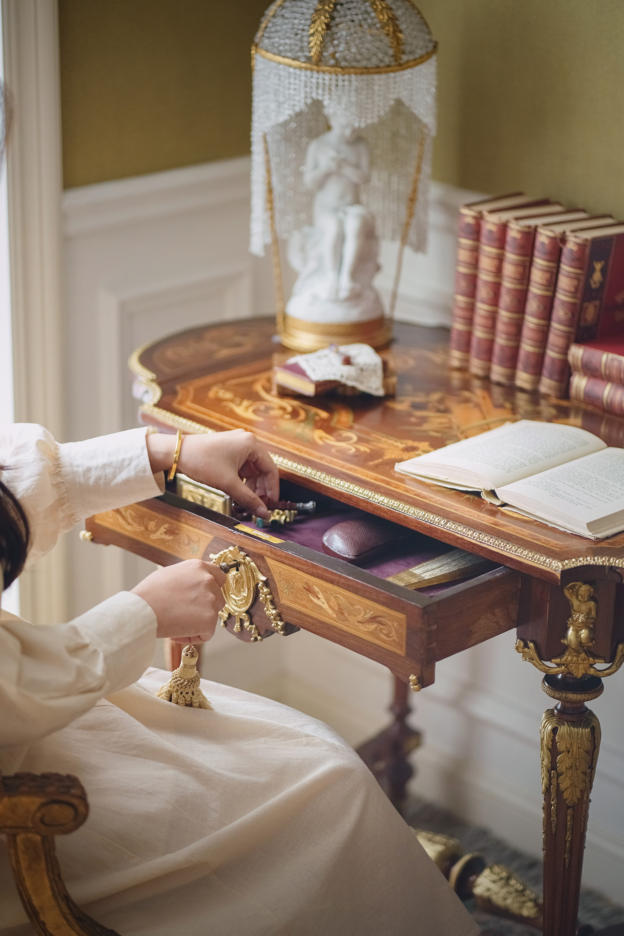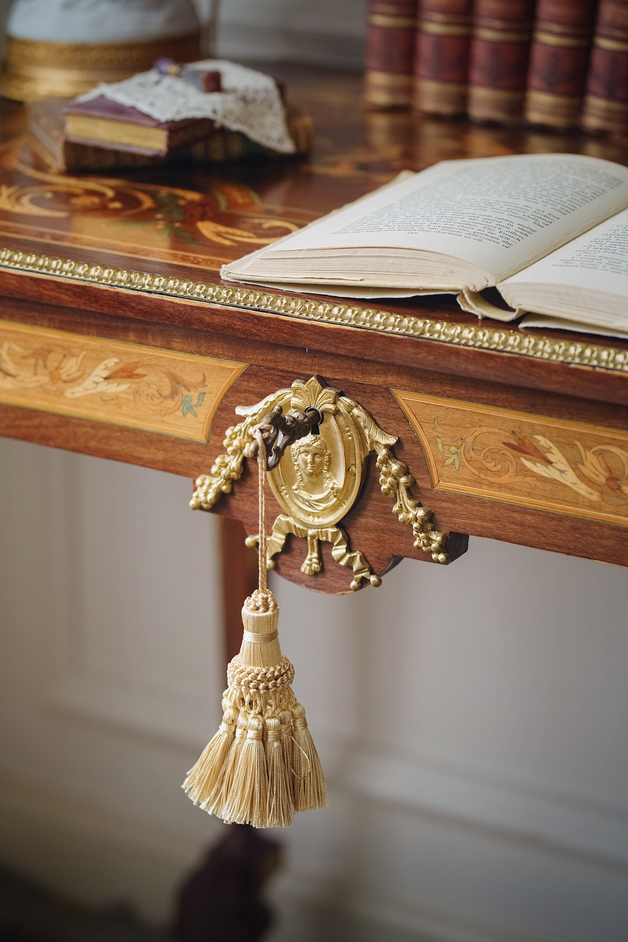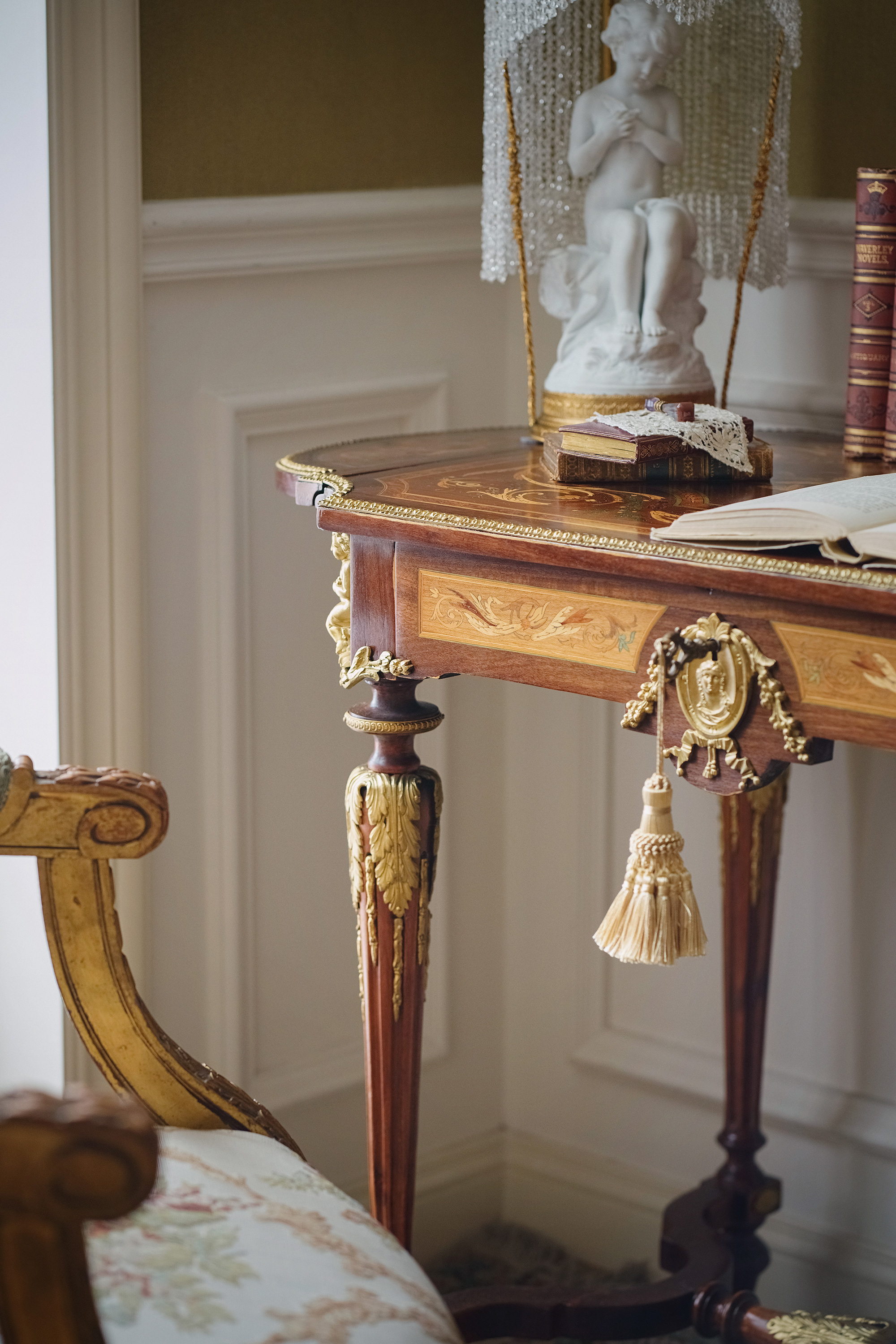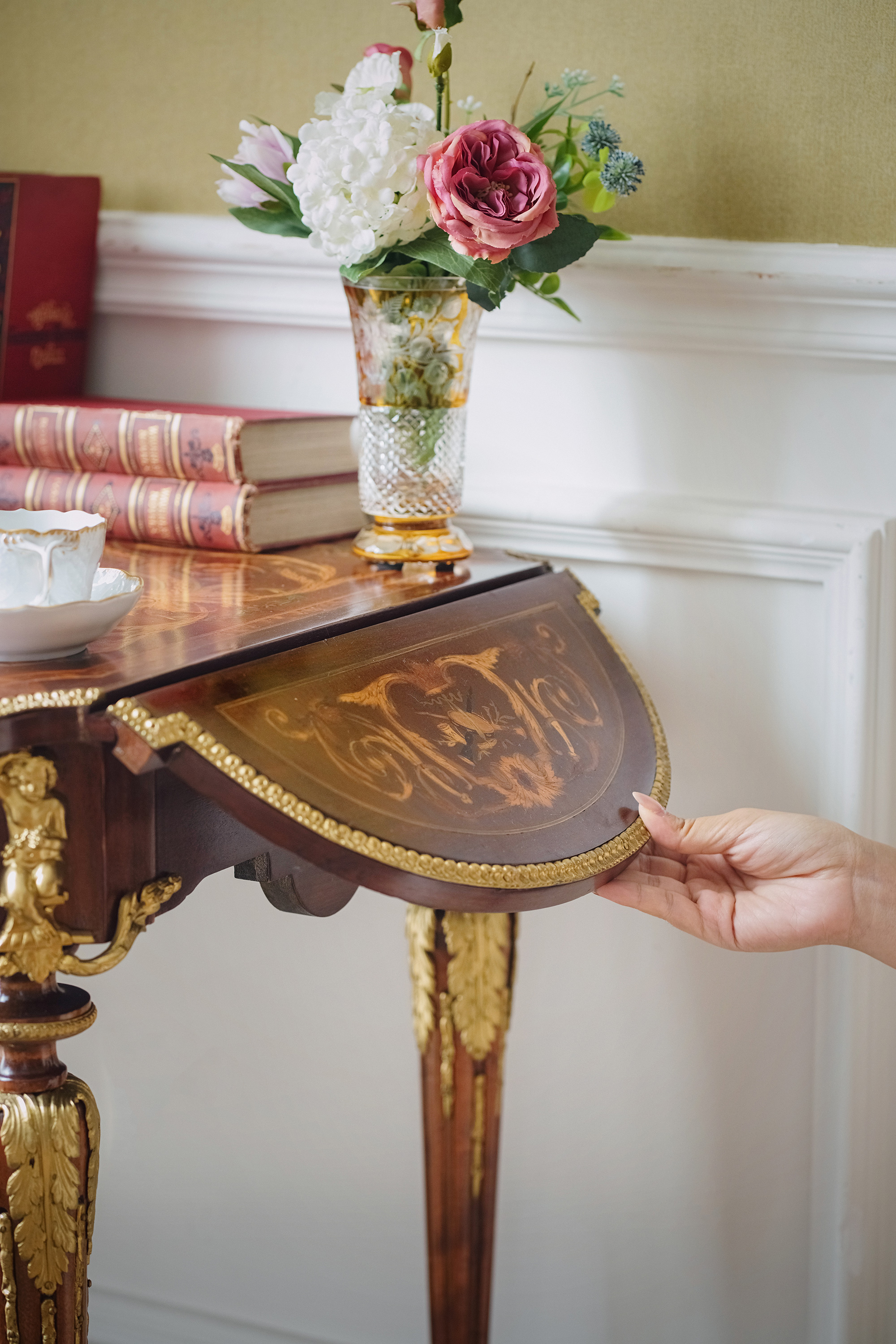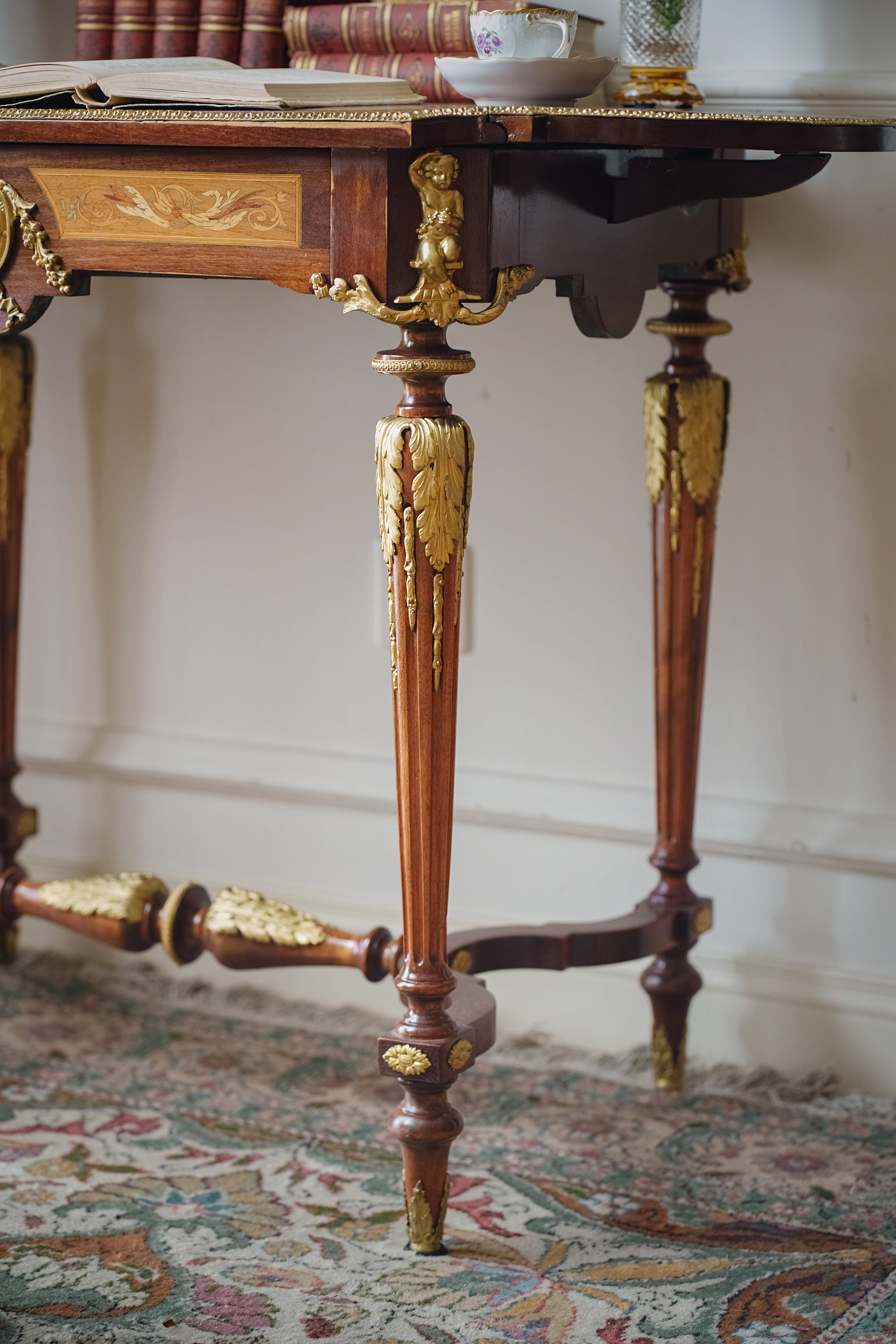 1890年代法国出品古典人物及卷叶纹铜鎏金精雕装饰胜利乐章主题细木镶嵌可延展式书桌