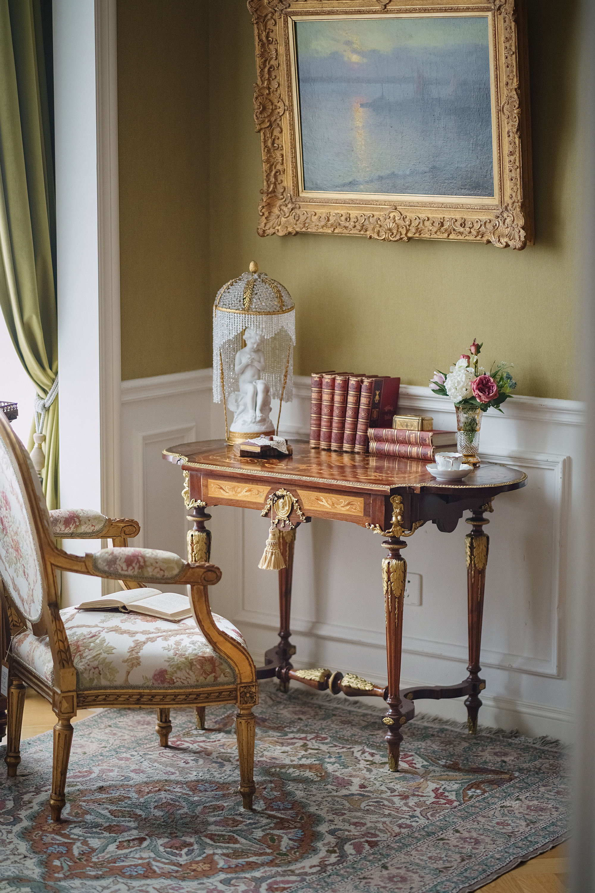 独角鹿西洋古董1890年代法国出品古典人物及卷叶纹铜鎏金精雕装饰胜利乐章主题细木镶嵌可延展式书桌