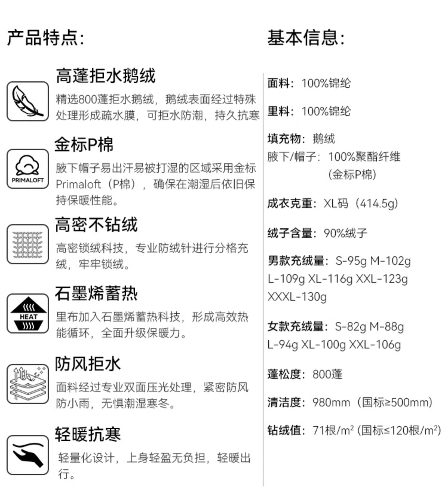 【雪狐100鹅绒服】拓路者800蓬轻薄羽绒服男女冬季p棉保暖羽绒外套