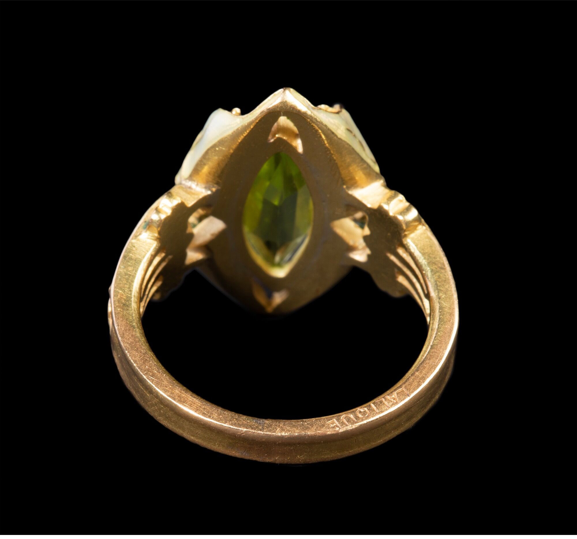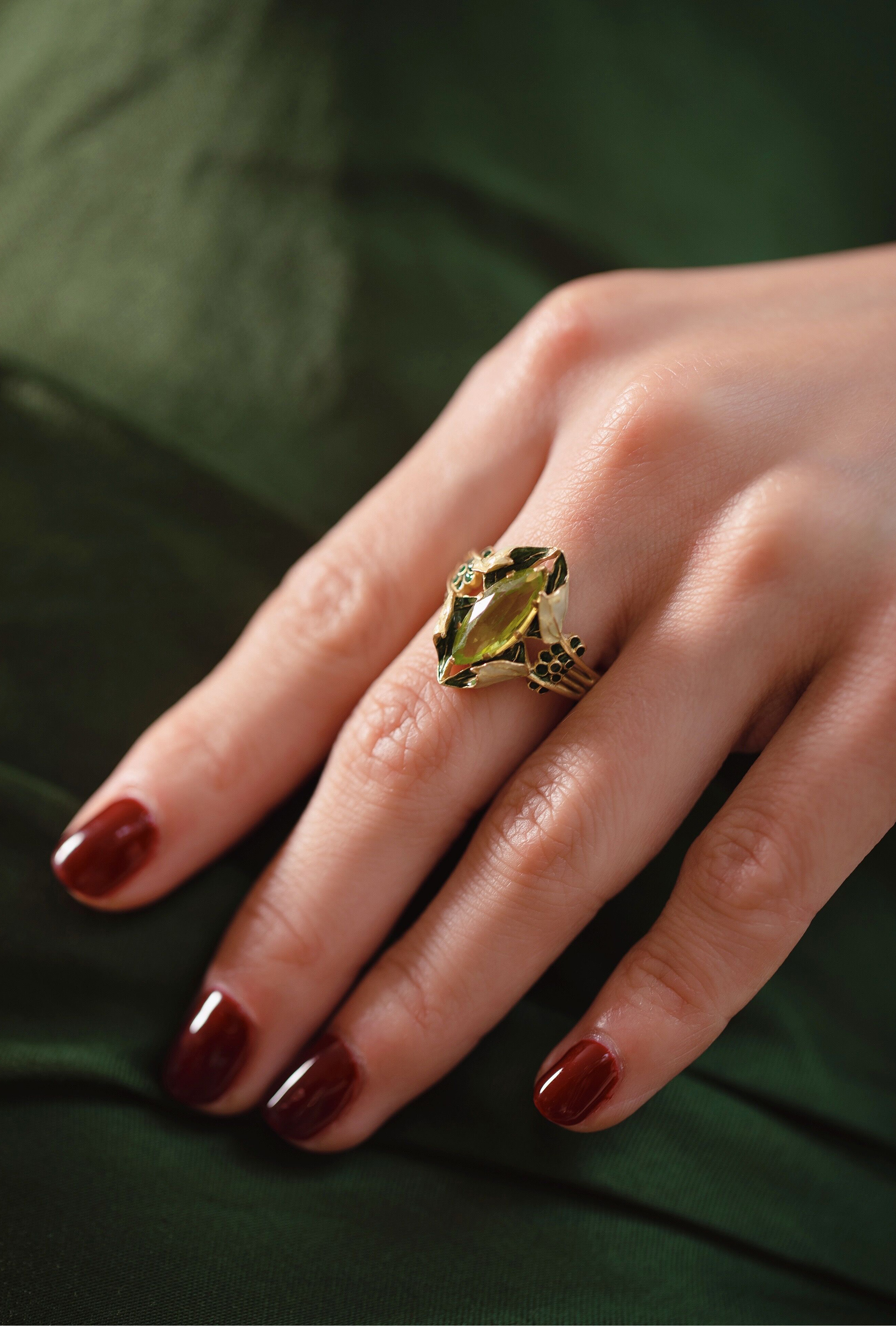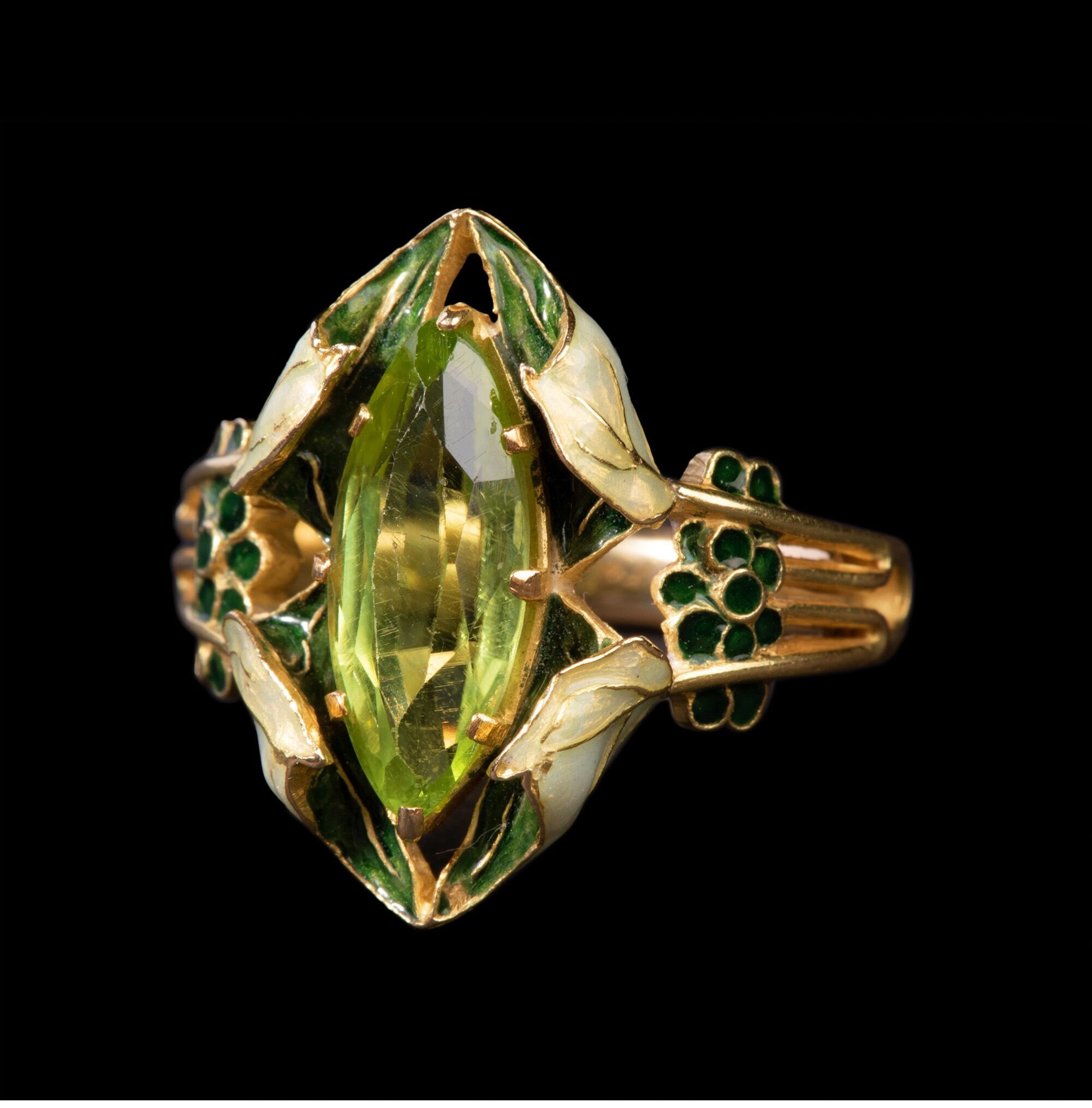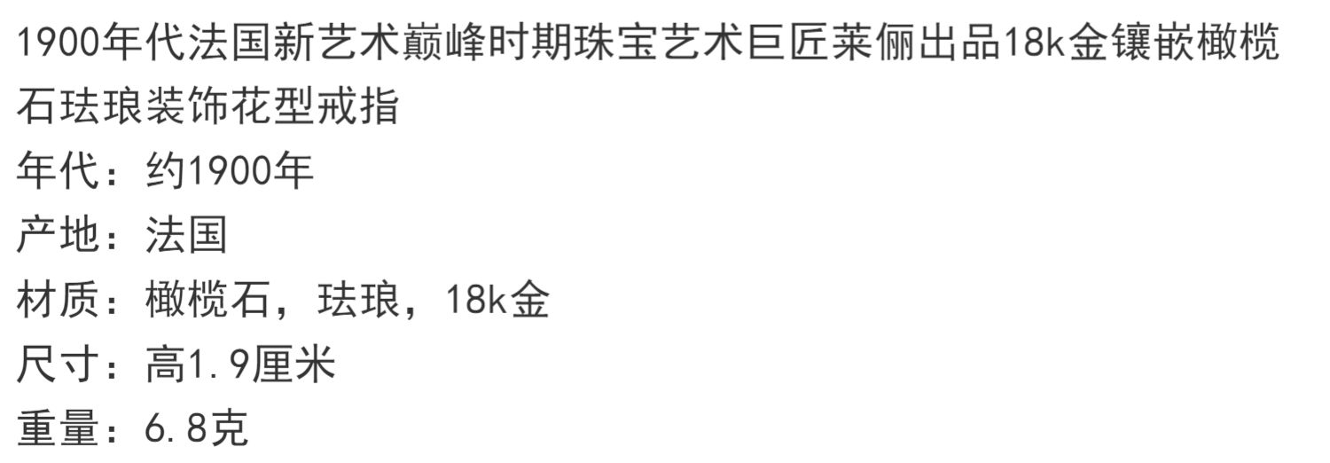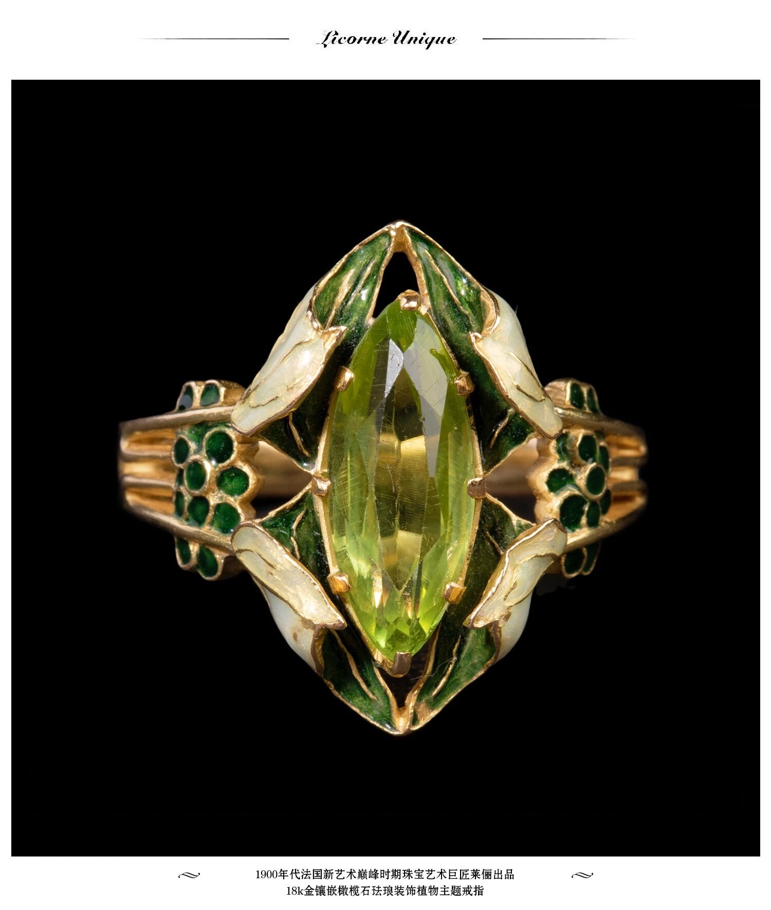 独角鹿西洋古董首饰珠宝法国莱俪18K金镶嵌橄榄石珐琅花型戒指