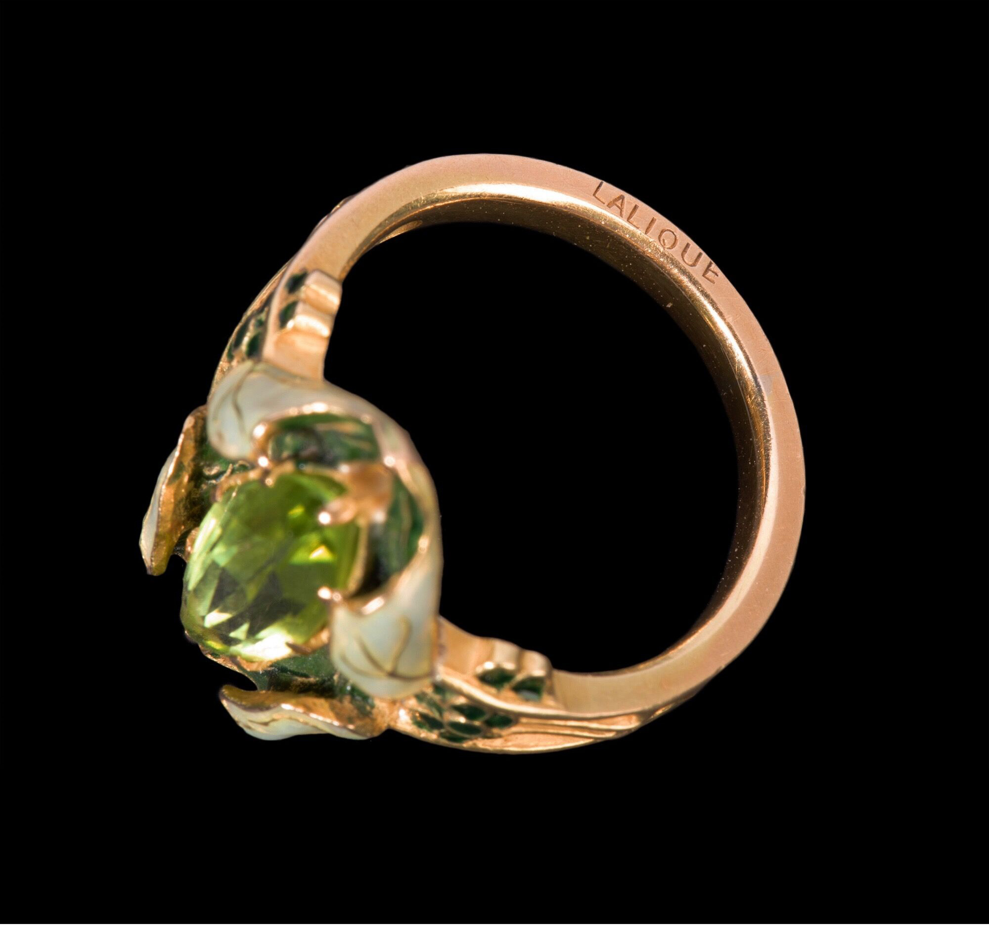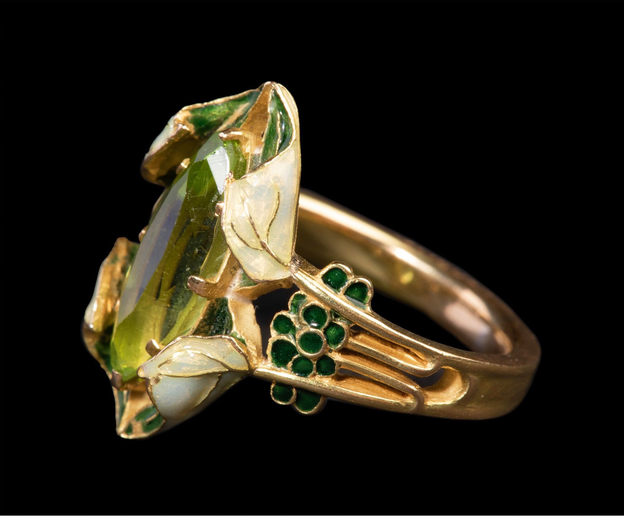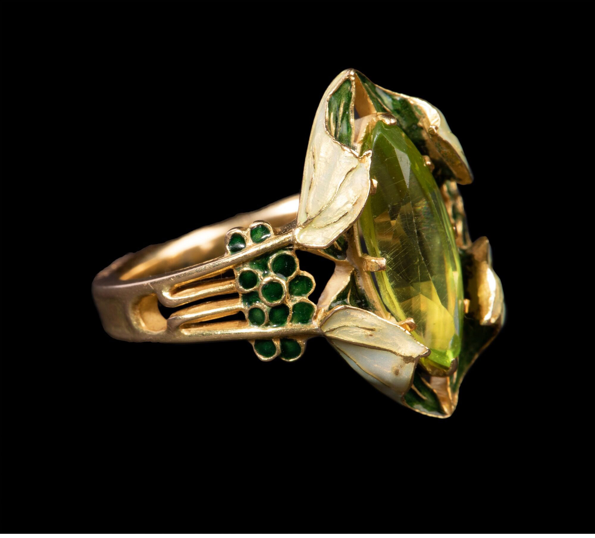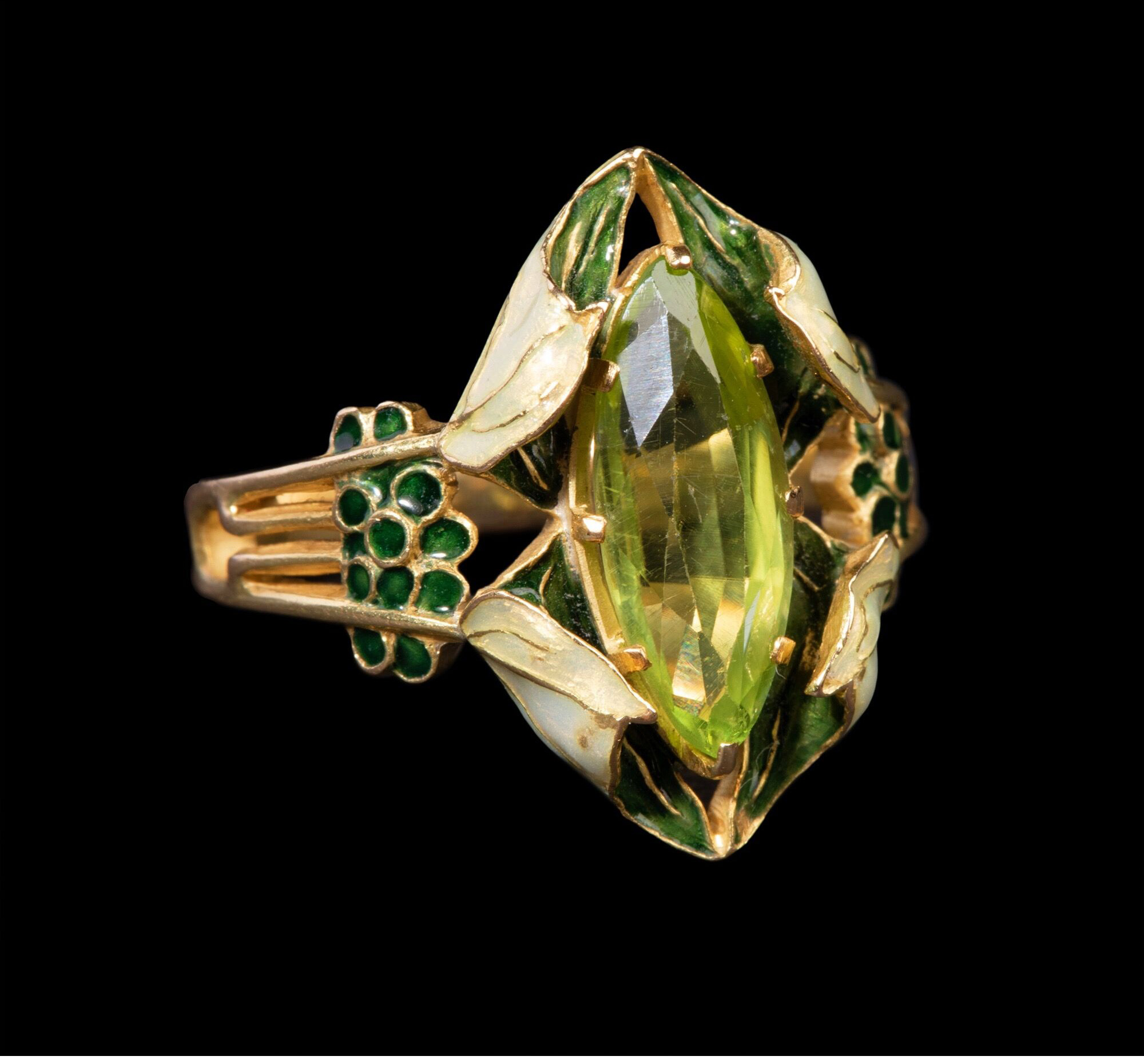 独角鹿西洋古董首饰珠宝法国莱俪18K金镶嵌橄榄石珐琅花型戒指