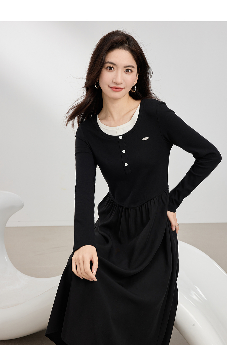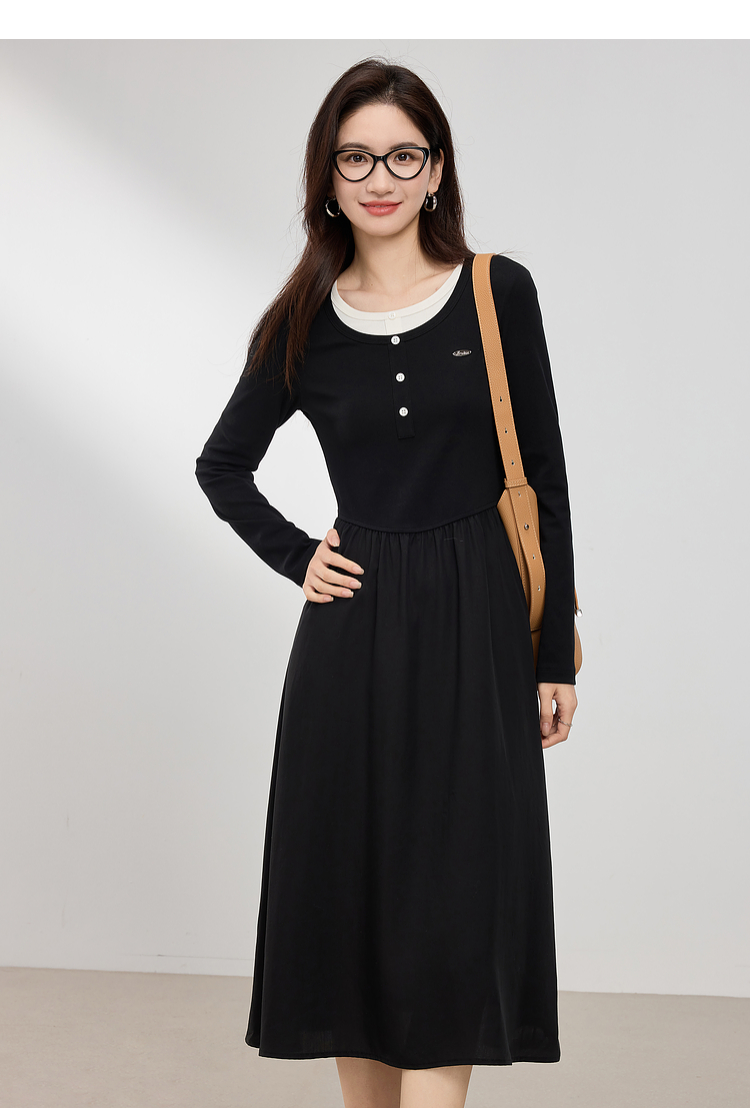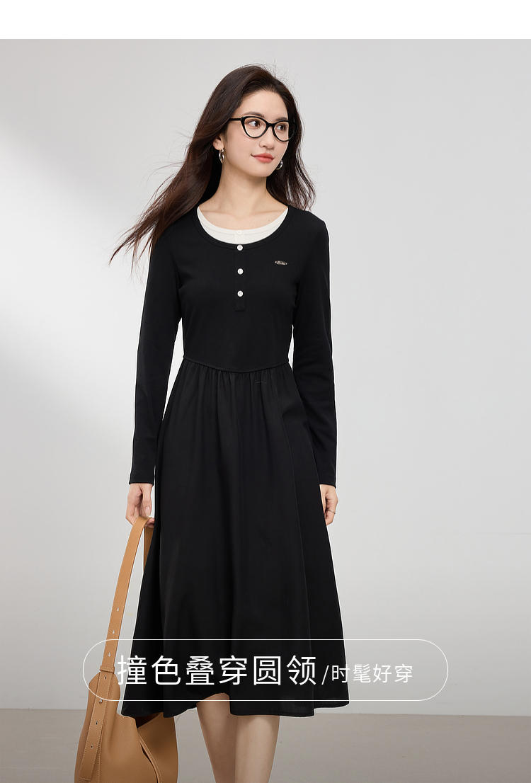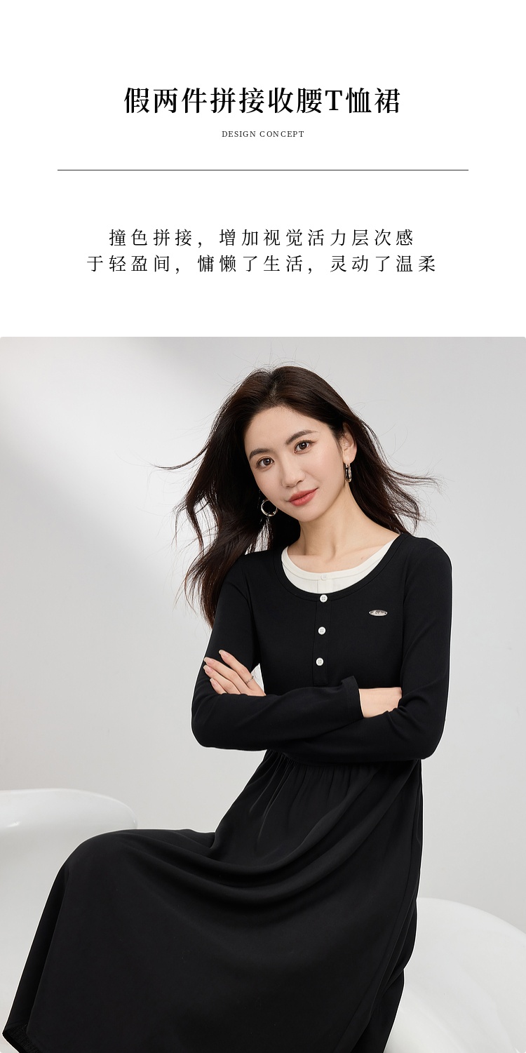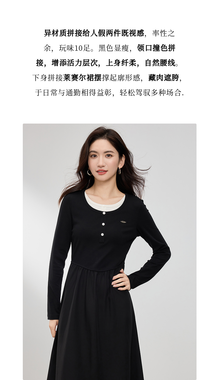 【专属特价】熙世界长绒棉拼接莱赛尔黑色连衣裙女长袖收腰显瘦长裙子2025春秋