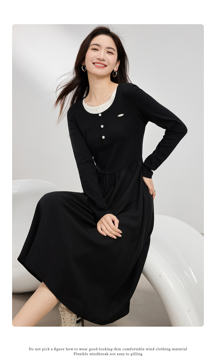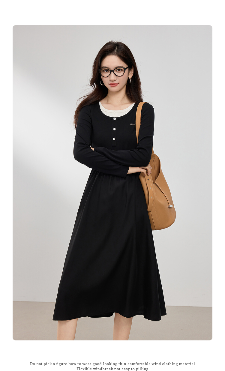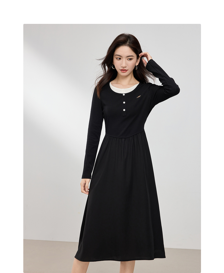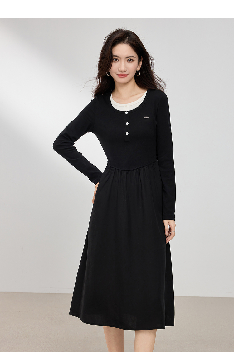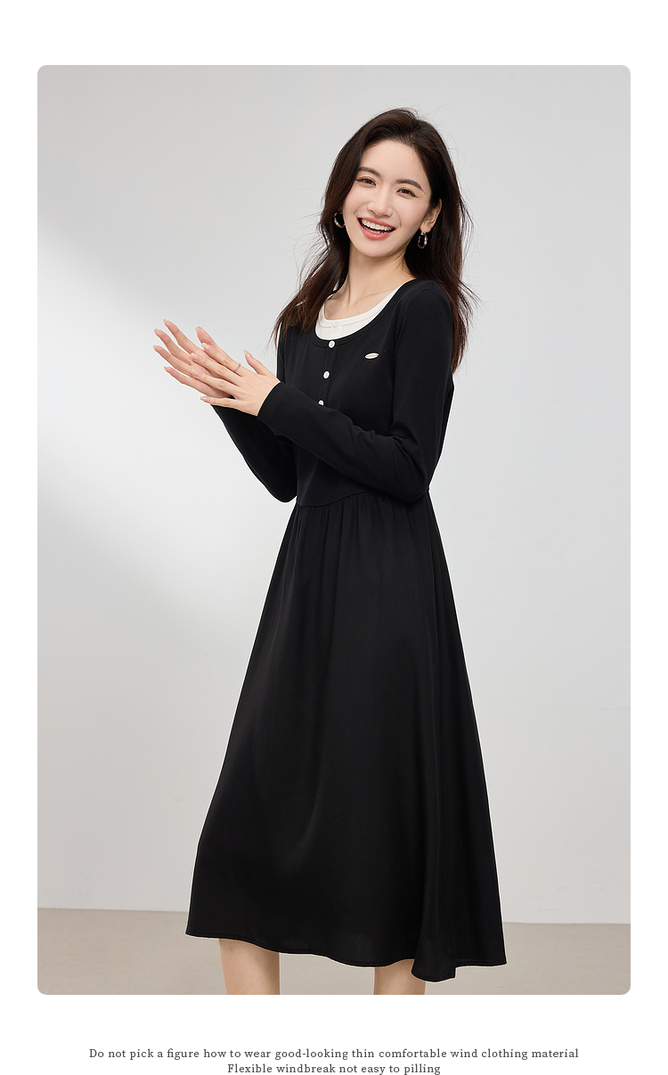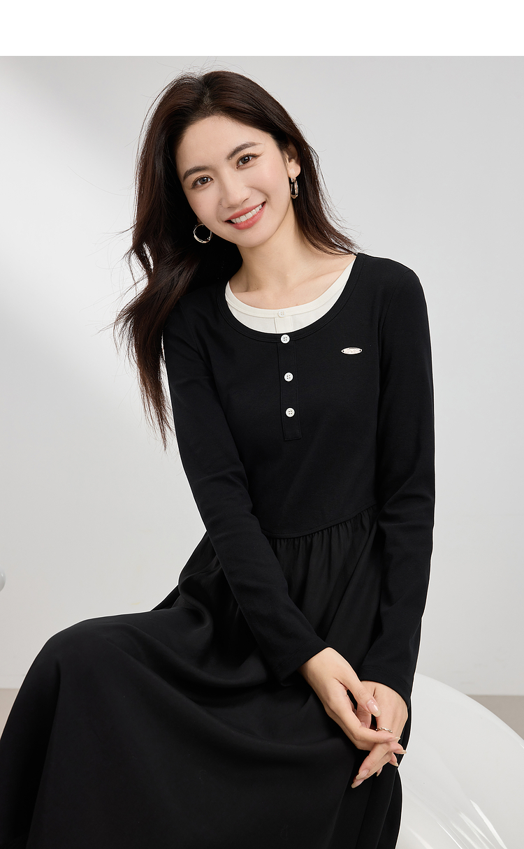 【专属特价】熙世界长绒棉拼接莱赛尔黑色连衣裙女长袖收腰显瘦长裙子2025春秋