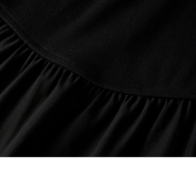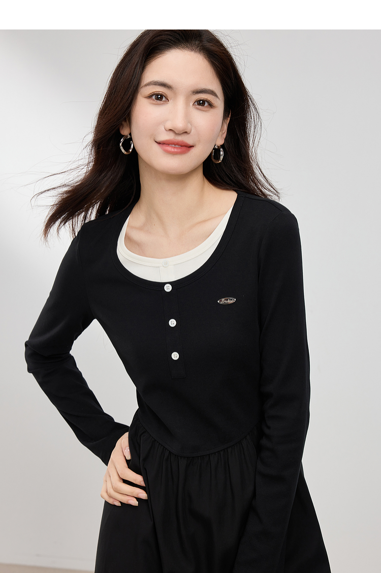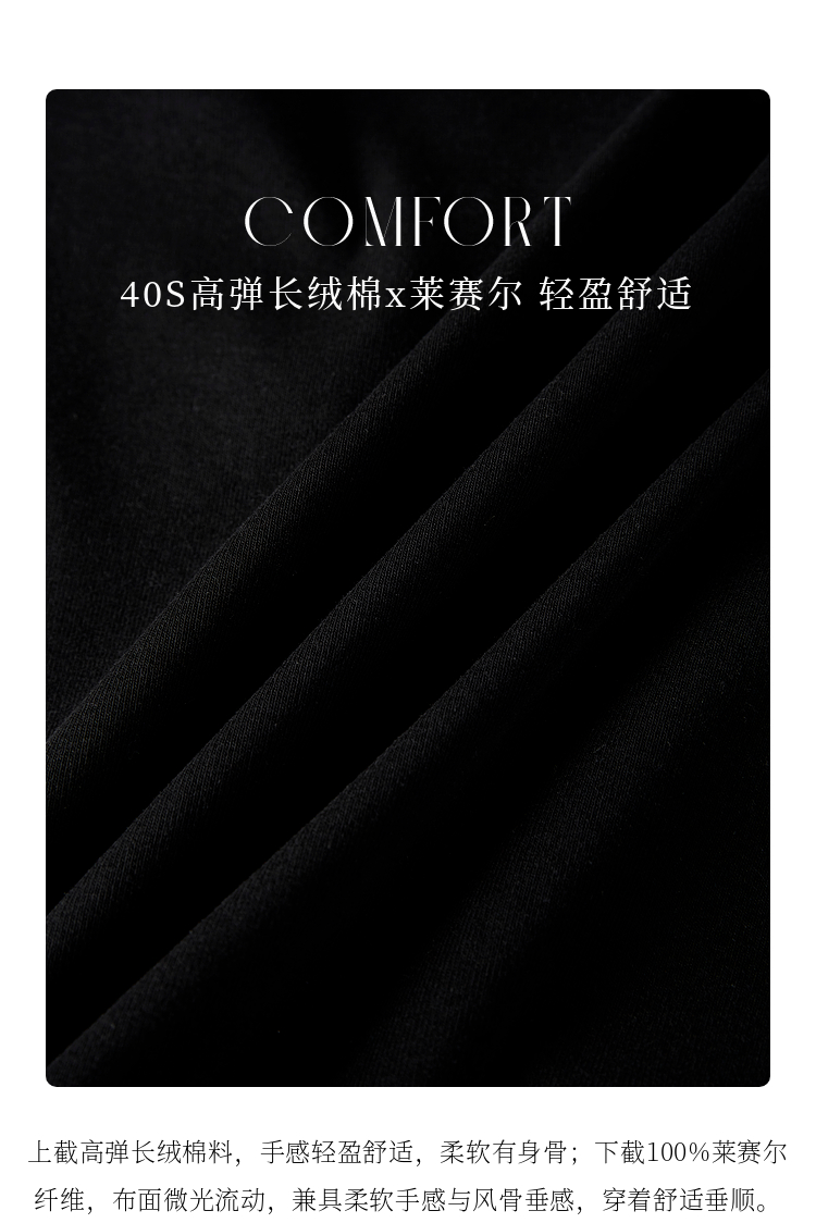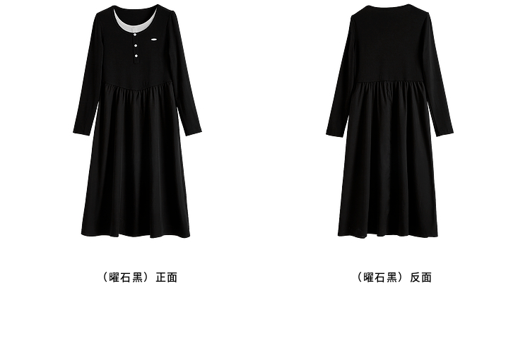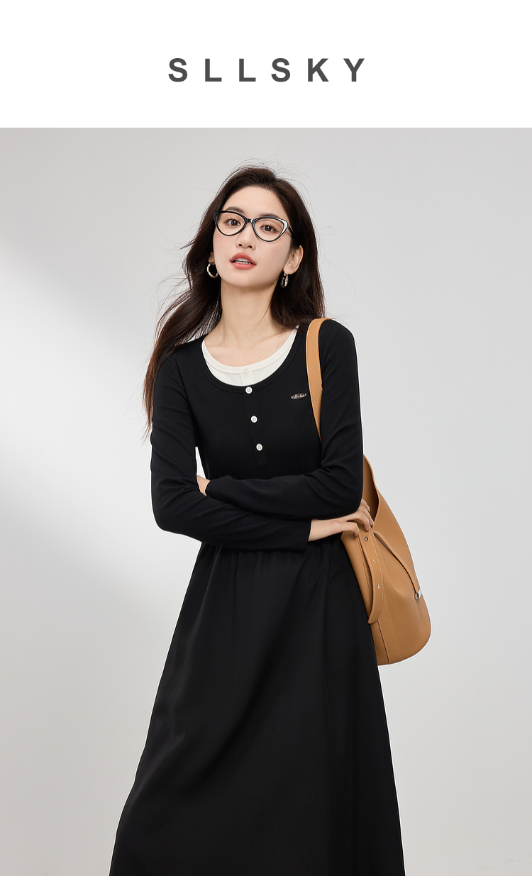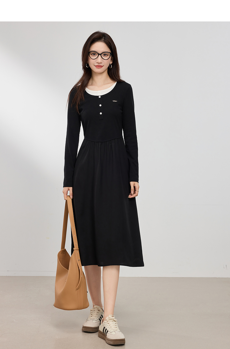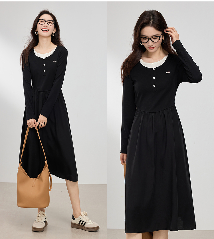 【专属特价】熙世界长绒棉拼接莱赛尔黑色连衣裙女长袖收腰显瘦长裙子2025春秋