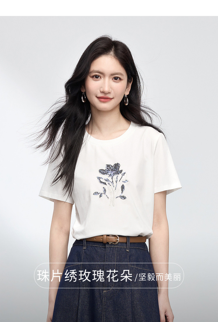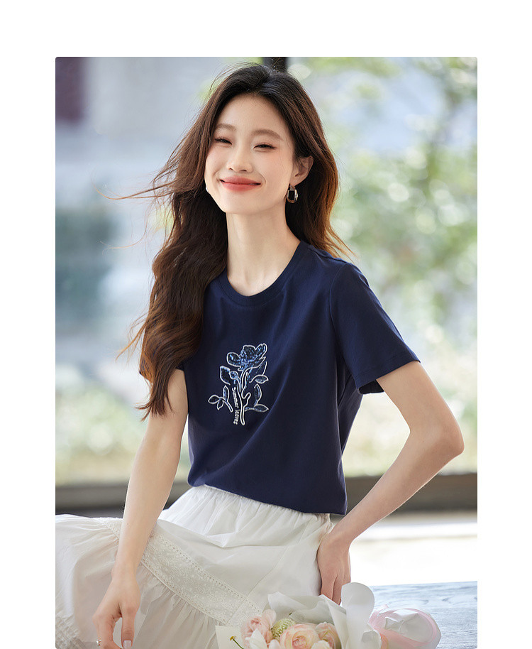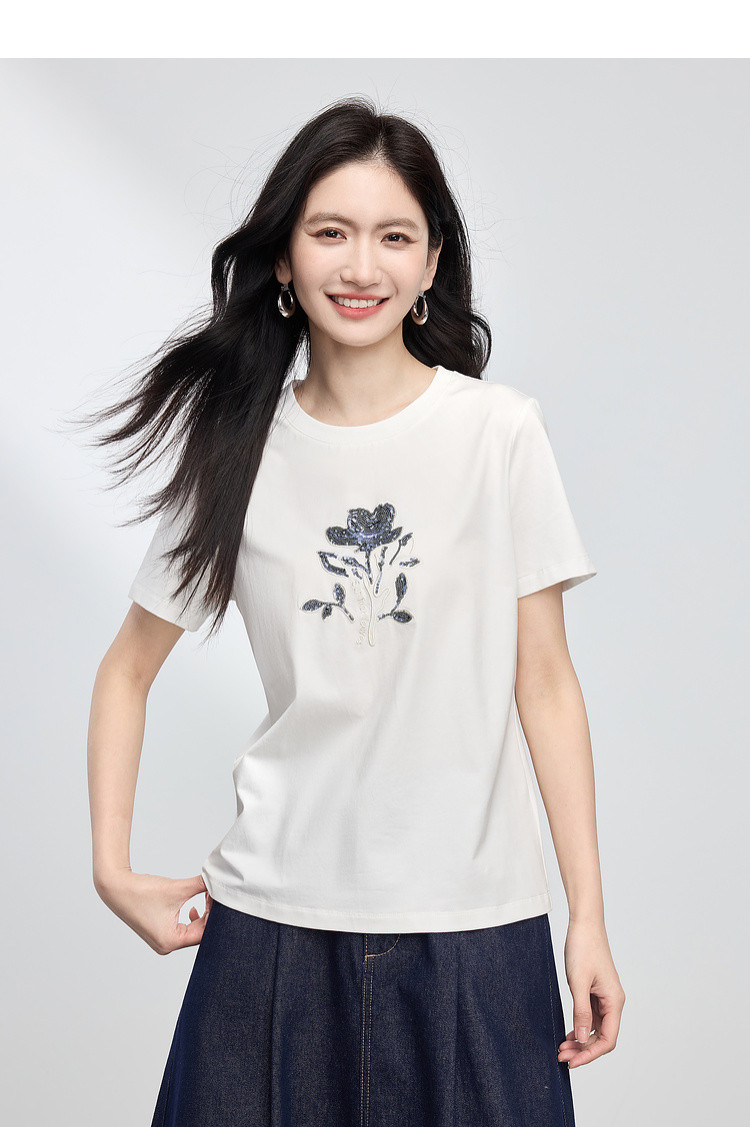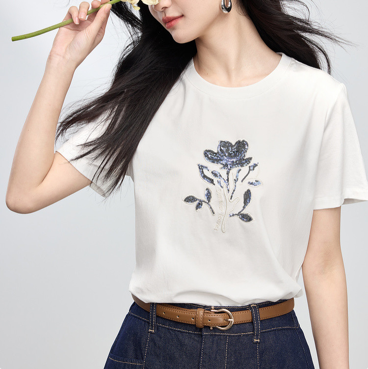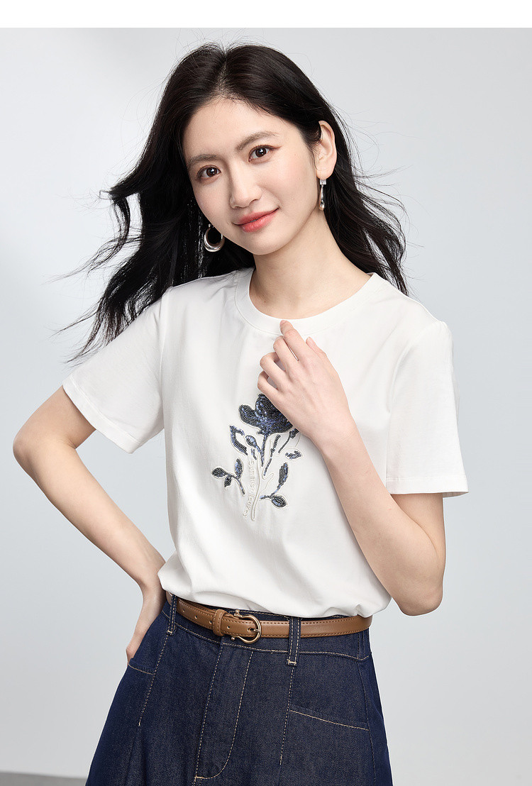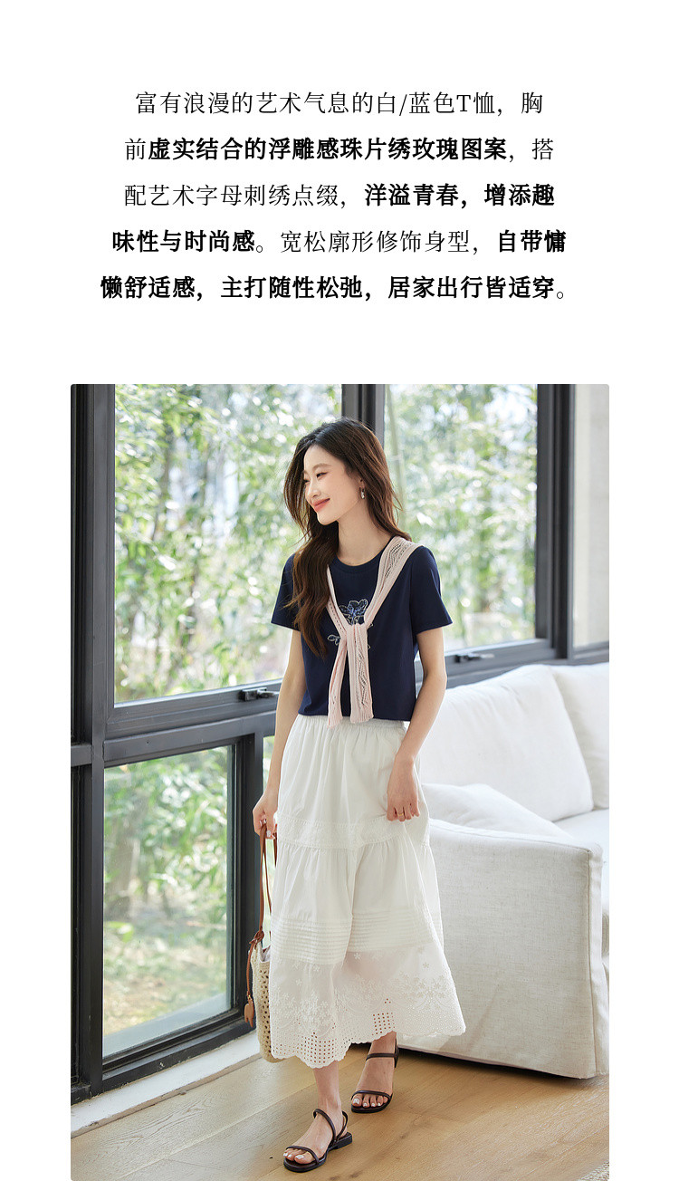 【周四狂欢价】熙世界90%棉玫瑰印花T恤25夏新款透气舒适女刺绣短袖休闲套头上衣