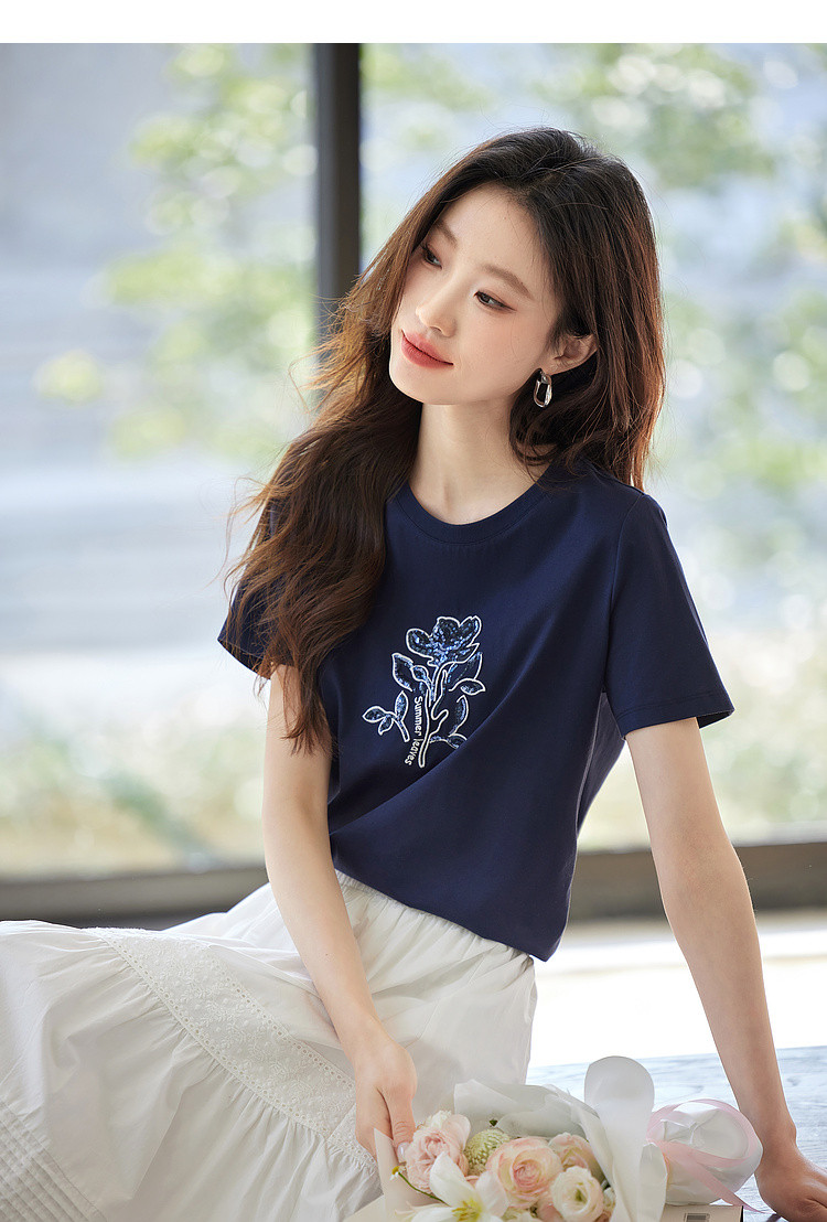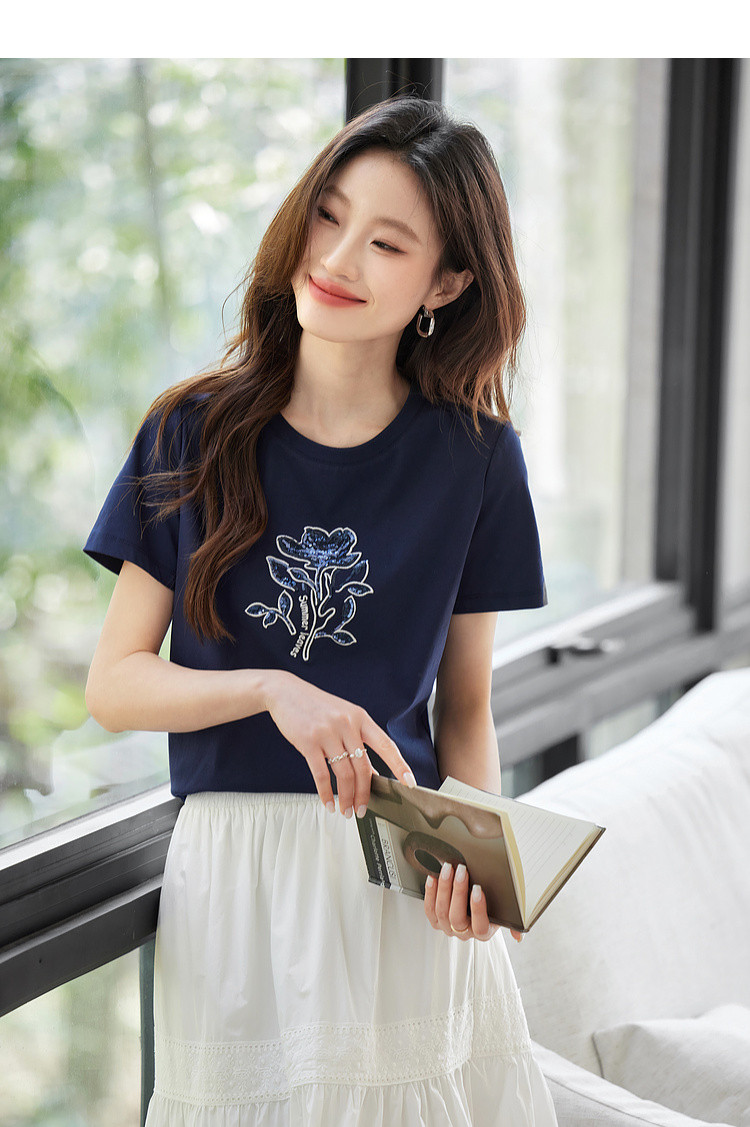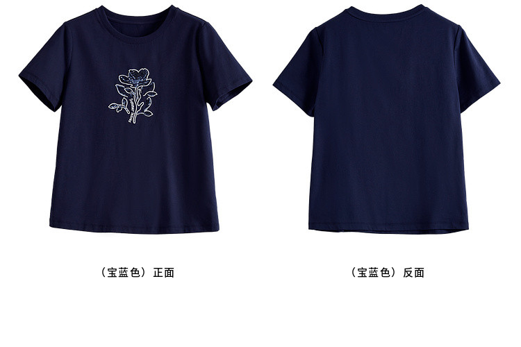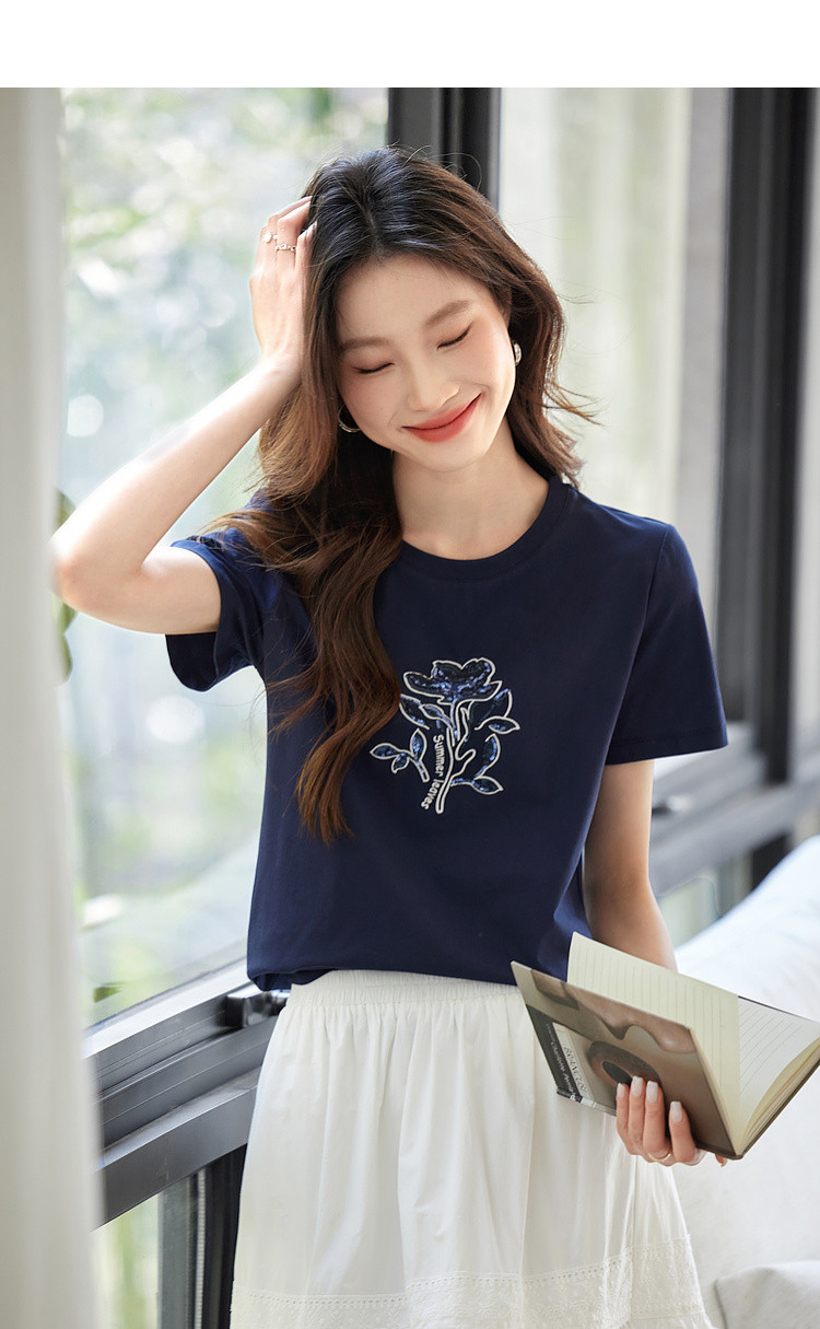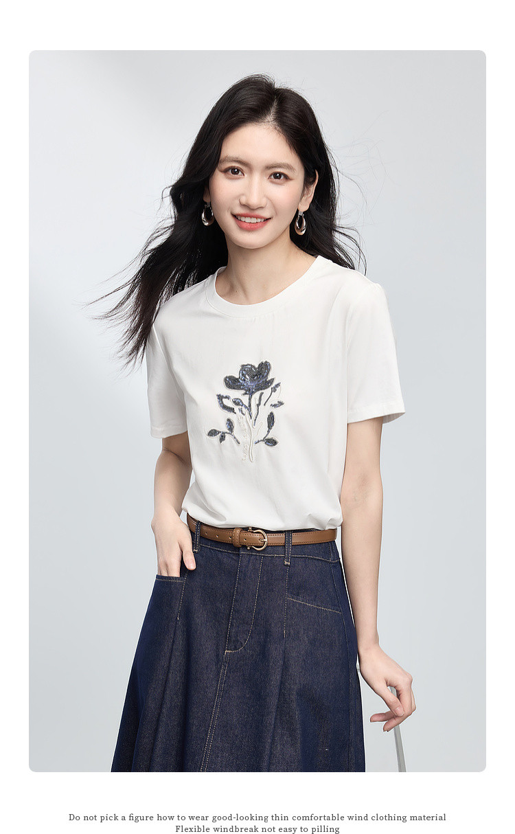 【周四狂欢价】熙世界90%棉玫瑰印花T恤25夏新款透气舒适女刺绣短袖休闲套头上衣