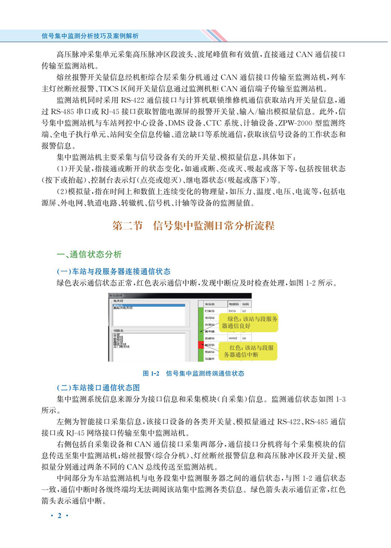 本书为铁路信号设备维护人员的分析和培训指导手册。全书以铁路现场在用信号设备的实际操作案例为切入点,分章节阐述了外电网、电源屏、25Hz轨道电路、直流道岔、交流道岔、信号机、ZPW-2000A无绝缘轨道电路、ZPW-2000A站间联系电路、继电式区间逻辑检查、站内轨道电码化等方面的采集及设备原理、日常分析流程及项目、典型设备异常案例、典型采集设备异常案例,对信号工学习铁路信号设备的维护有较强的指导作用。