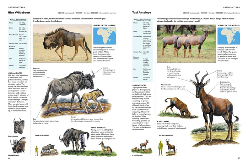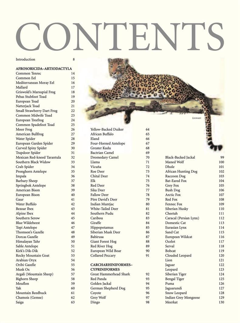 本书描述了地球上引人入胜的生物,从非洲的大型猫科动物到与我们进化史近的猿类,再到漫游于世界海洋中的鲸鱼和海豚,本书涵盖了世界上400多种迷人的物种,全方面概述了各大洲的动物,并展现了动物种类令人难以置信的多样性。书中精选的动物按目分组,每个目内又按科分组;每个科的部分都包含关键物种的样本,并配有精美细致的全彩插图。为了方便参考,每个条目都包含一个表格,其中包含学名、目和科、特征、栖息地、分布、食性和繁殖信息,以及信息丰富的地图和详细的图例。