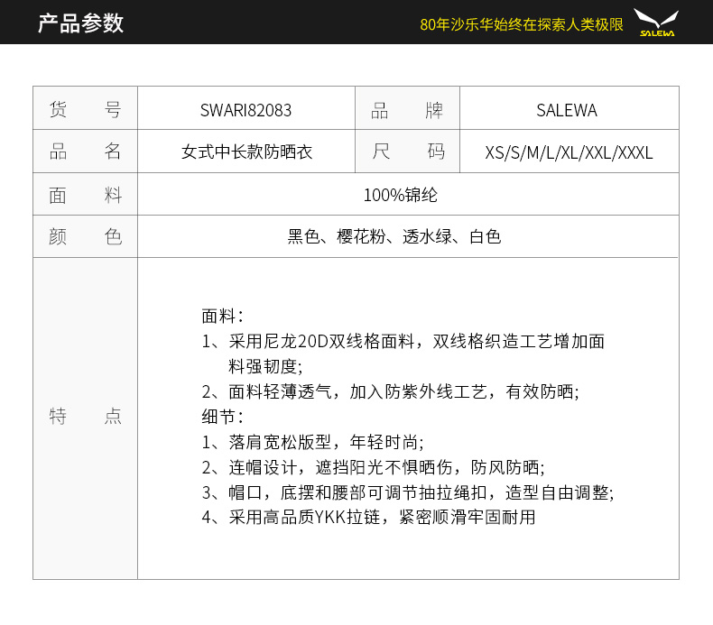 SALEWA|女式中长款防晒衣 SWARI82083