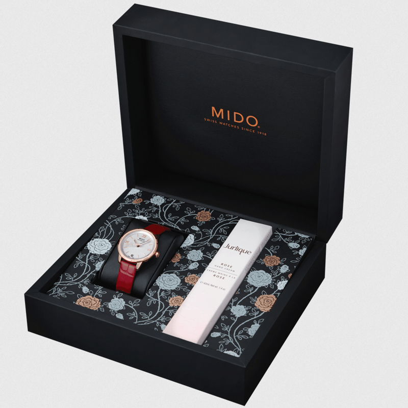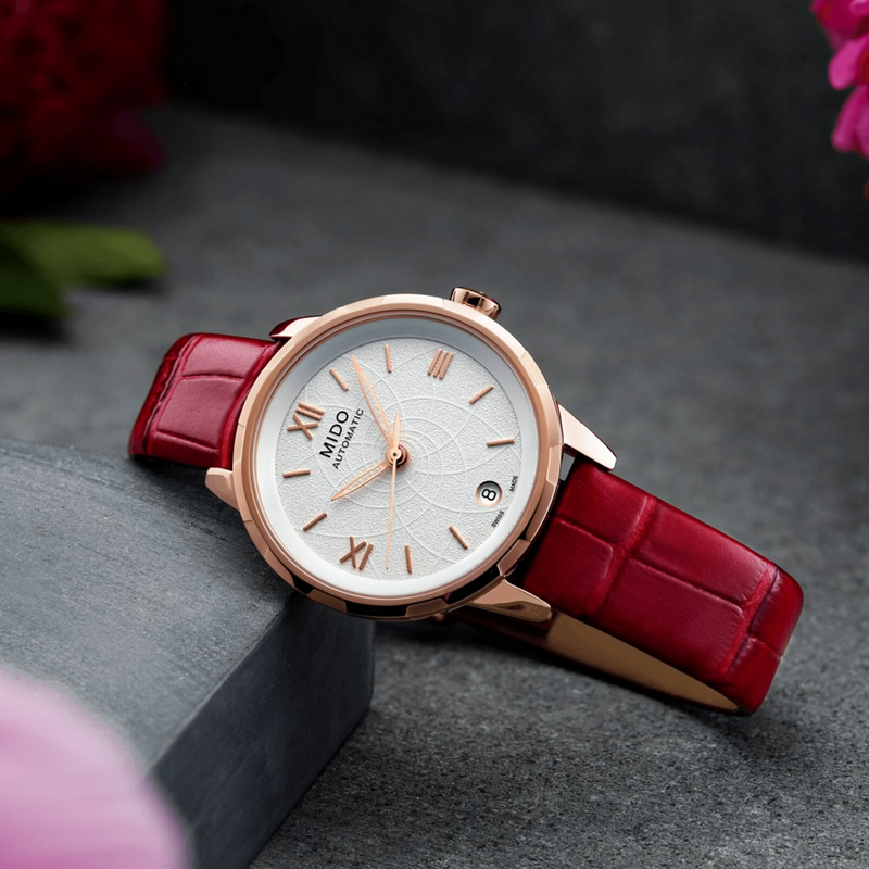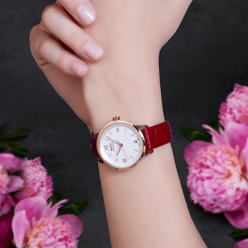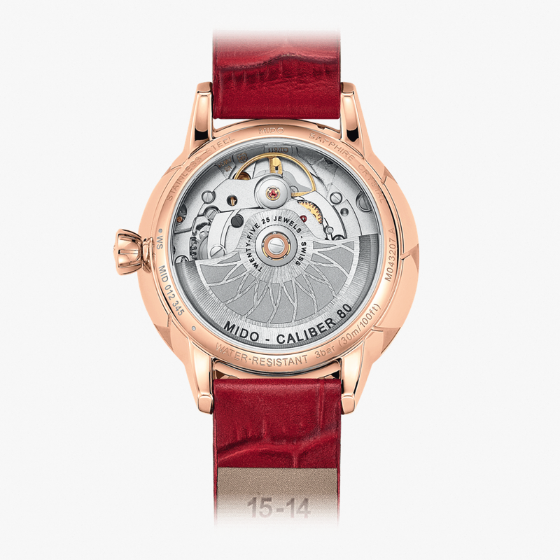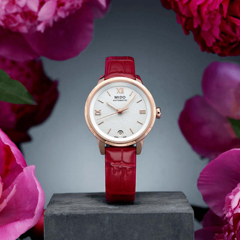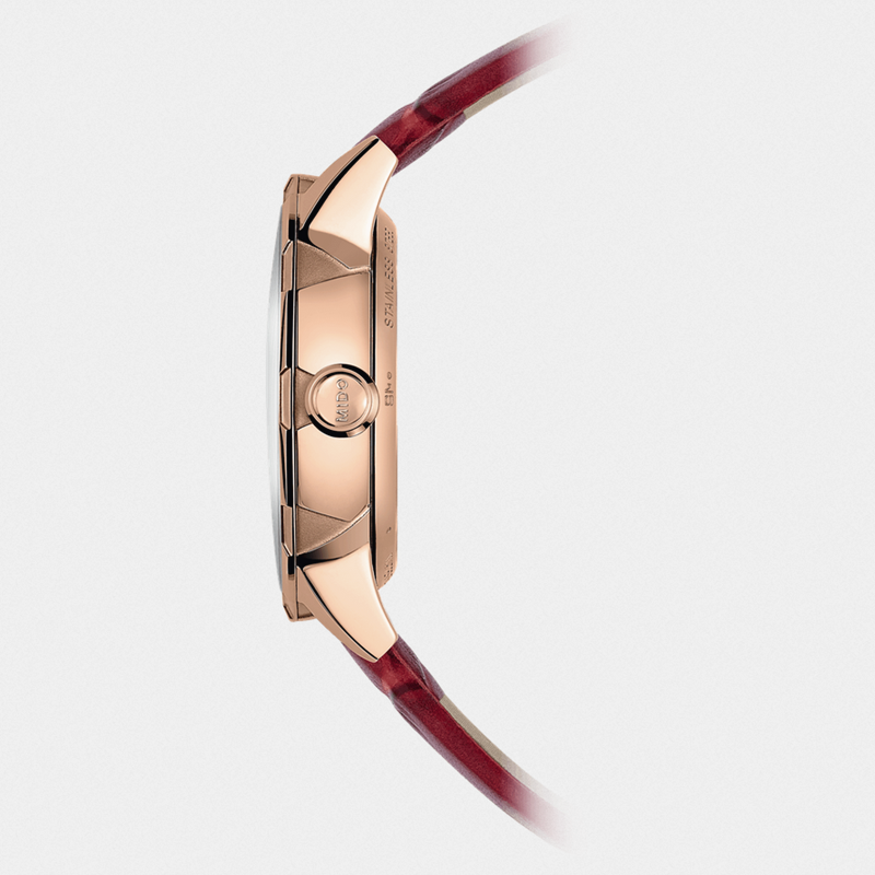 镜面 材质 | 蓝宝石水晶玻璃 | 表盘 | PVD镀玫瑰金不锈钢表壳 丝光打磨白色颗粒表盘,花淅系列专属图案花纹刻饰,同色调珠光盘圈,PVD镀玫瑰金不锈钢刻度与罗马数字刻度,钻石切割弧形秒针,镂空时针和分针 日期显示 透底,可观测其精雕细刻的机芯,镌刻序列号 |