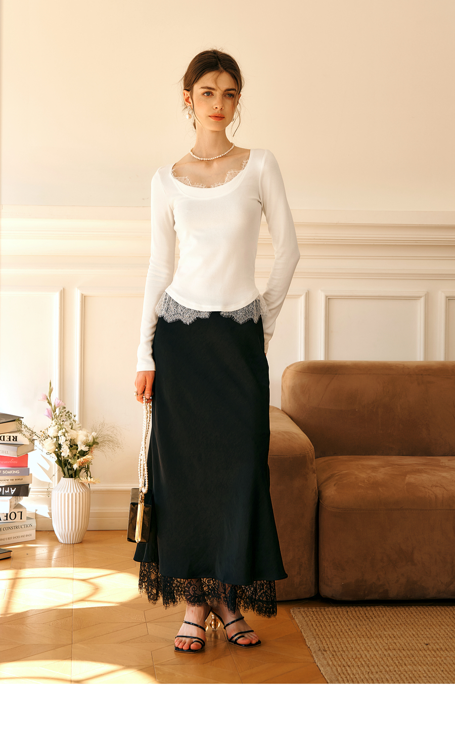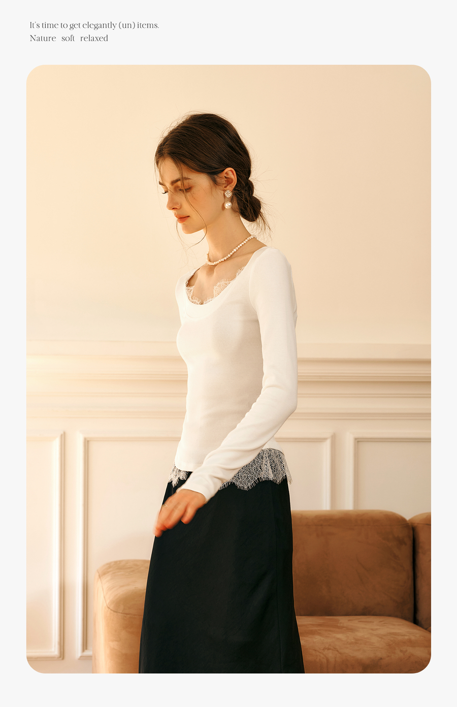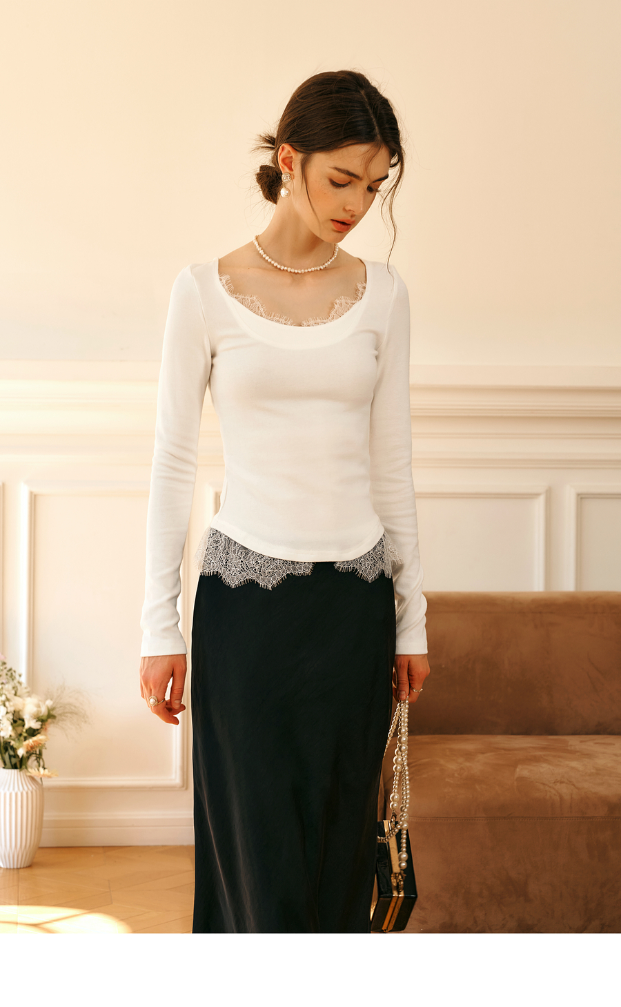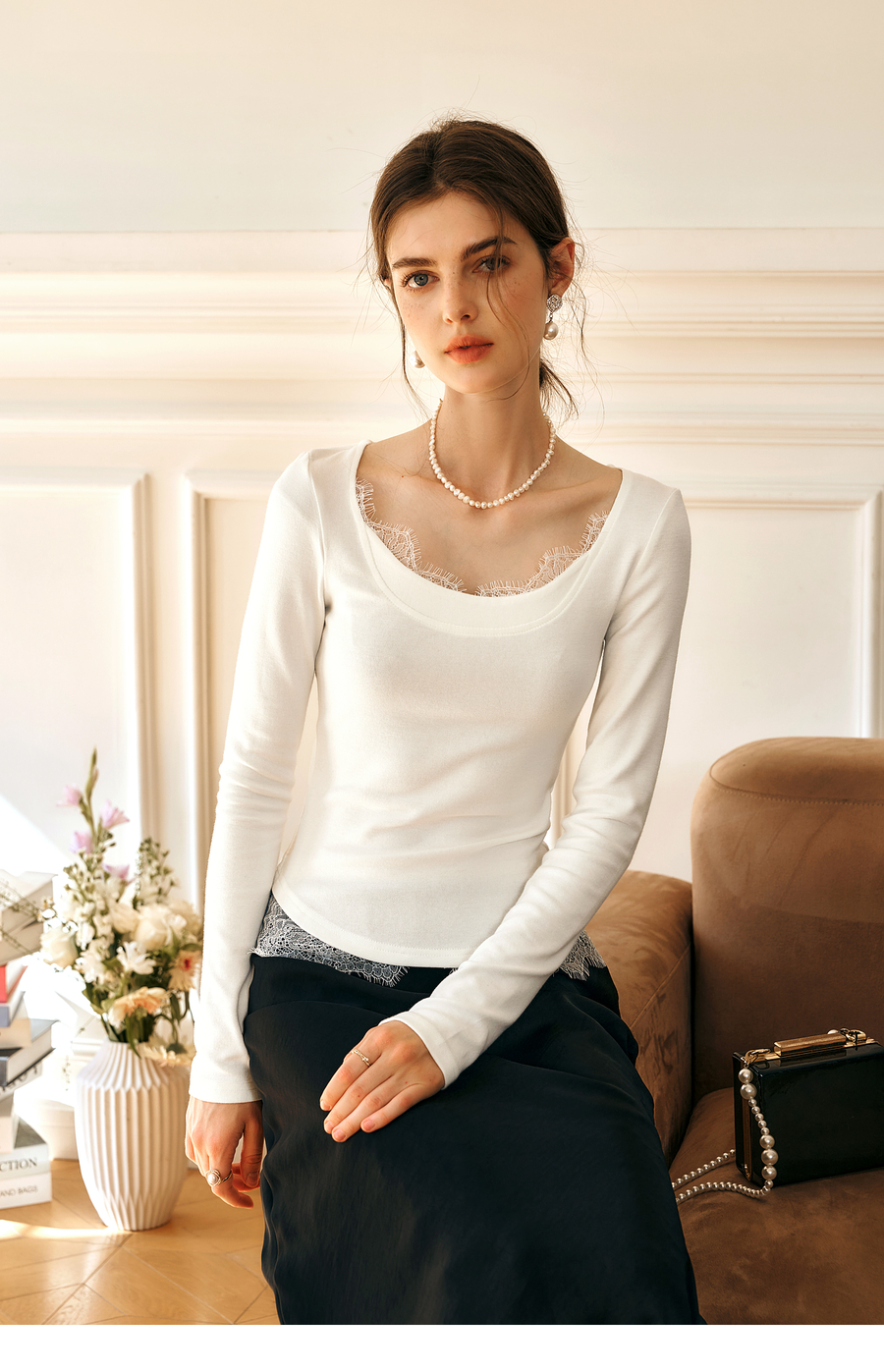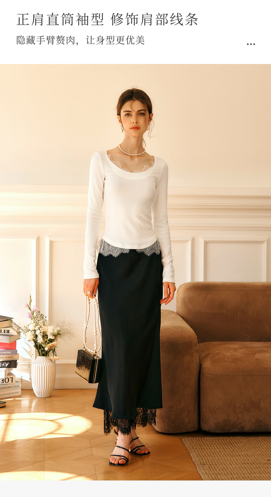 OLrain欧芮儿法式蕾丝T恤女秋季2025年新款优雅气质大U领长袖上衣
