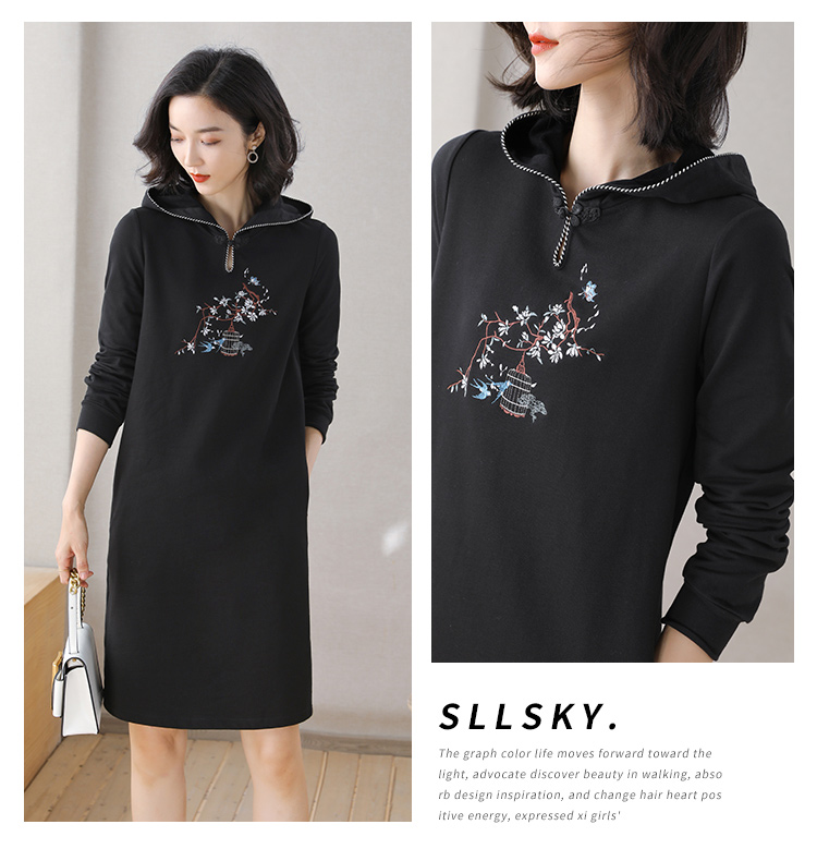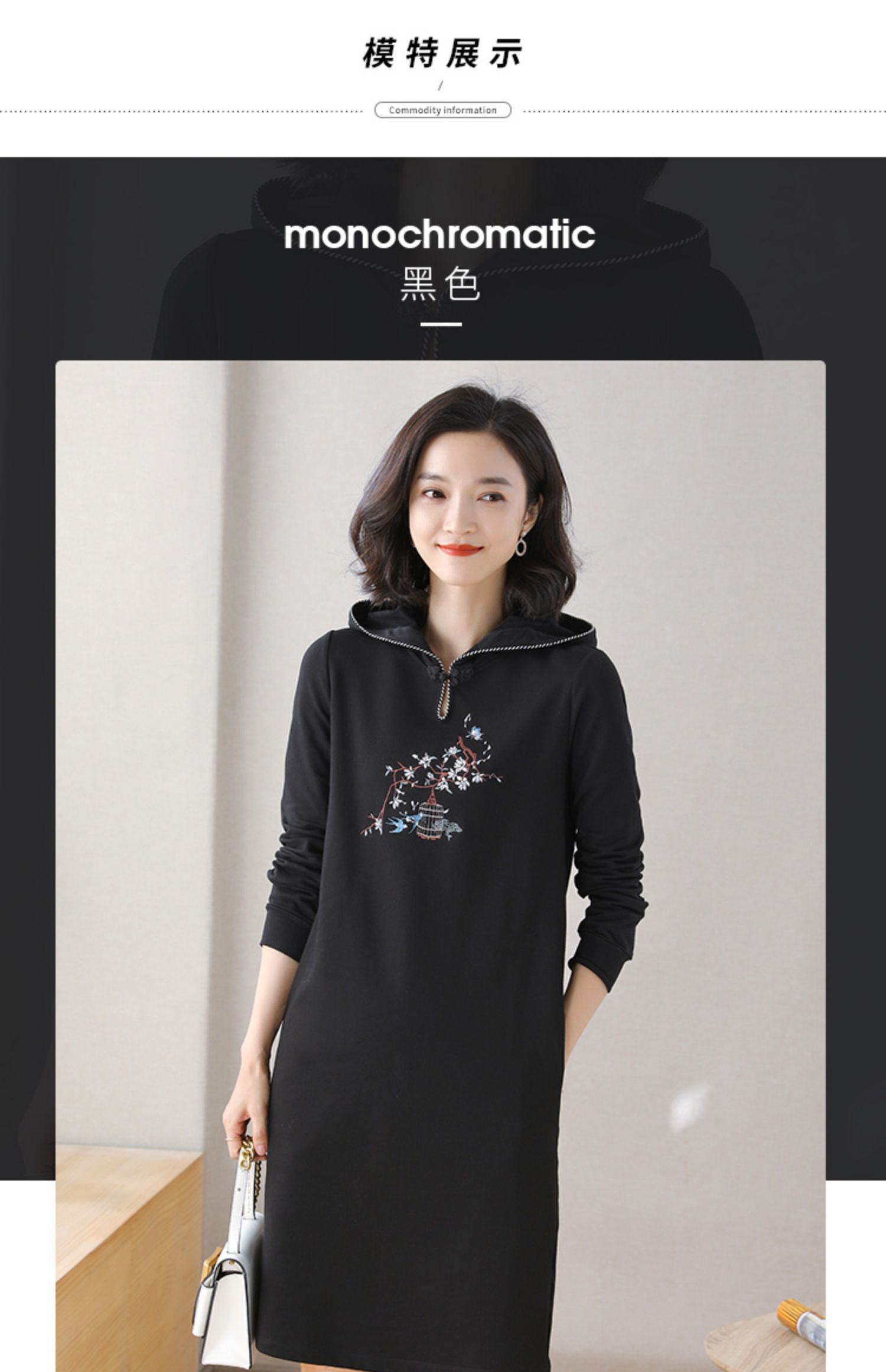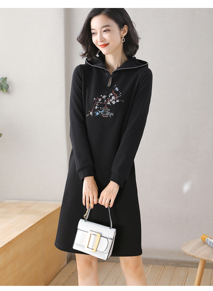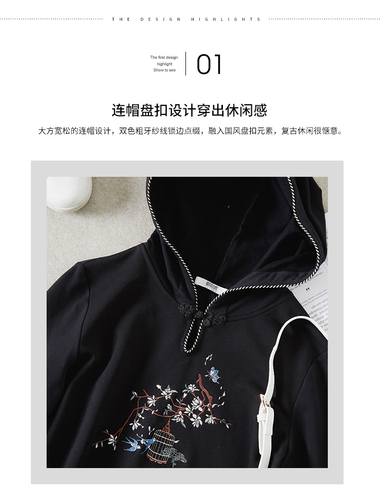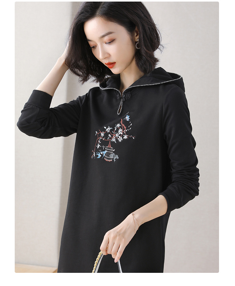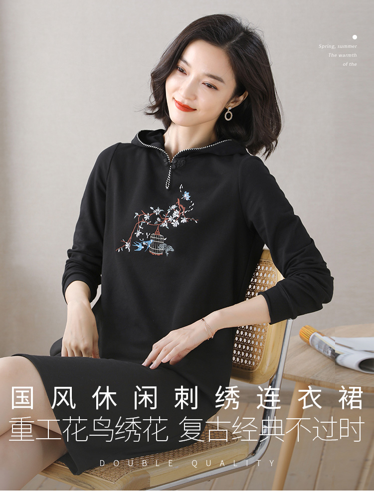 休闲刺绣复古重工花鸟中长连帽H型连衣裙