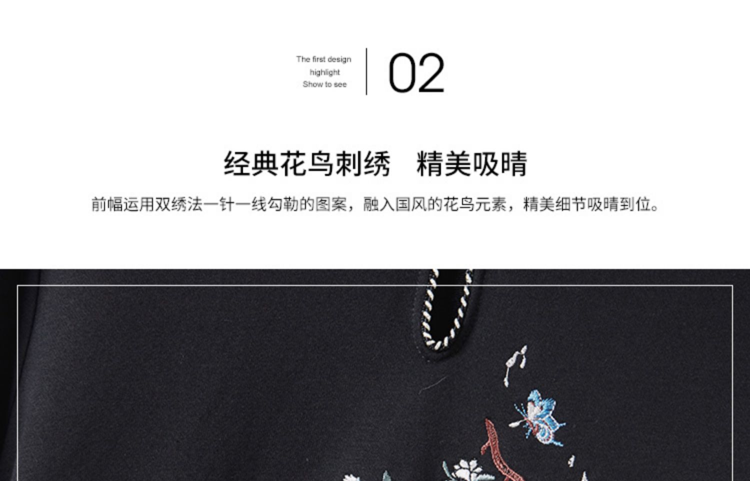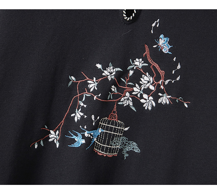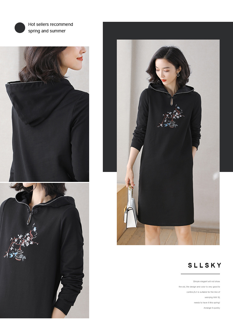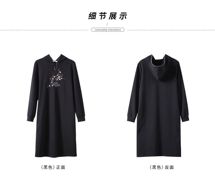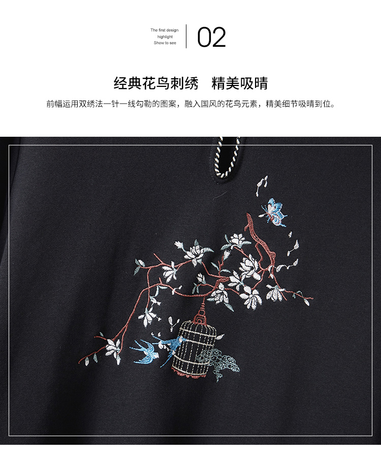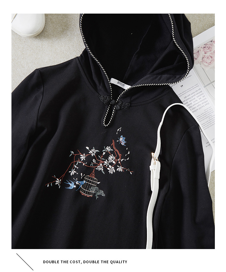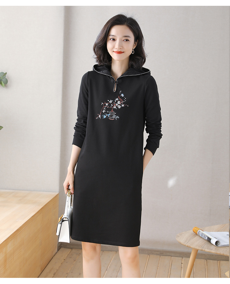 休闲刺绣复古重工花鸟中长连帽H型连衣裙
