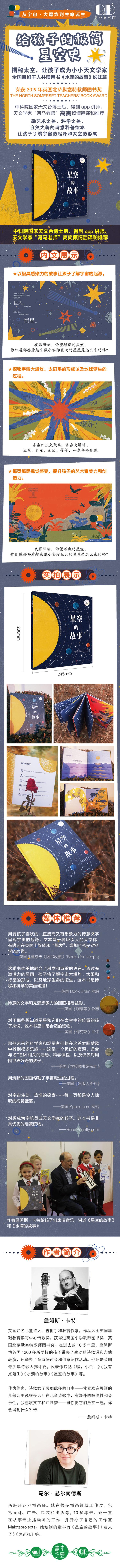 《星空的故事》是英国有名儿童诗人詹姆斯·卡特诗意科普绘本代表作,一本给孩子的极简星空史,融艺术、科学和自然之美于一体,让孩子了解宇宙大爆炸、宇宙的诞生、太阳系的形成和地球生命的起源。让孩子好奇星空,探究天文,并从小懂得爱护我们的家园——地球!