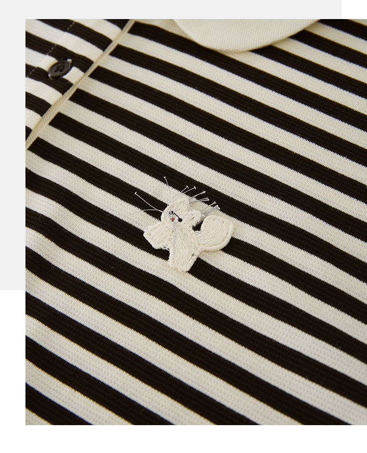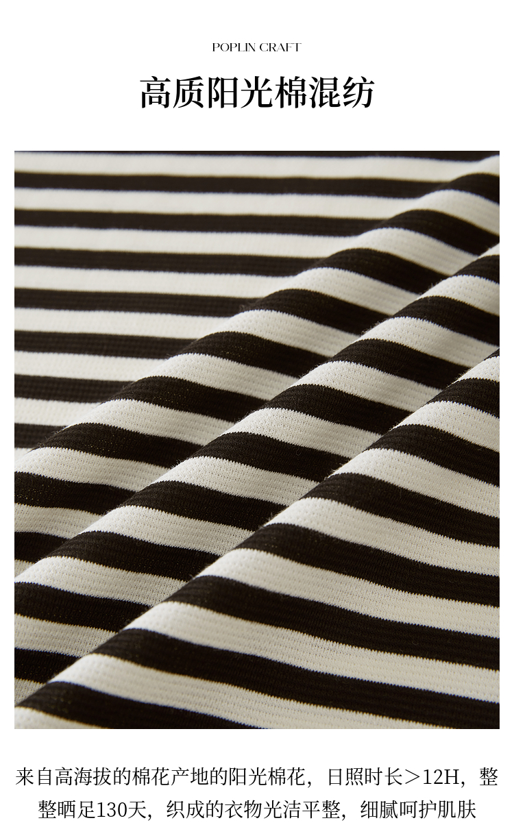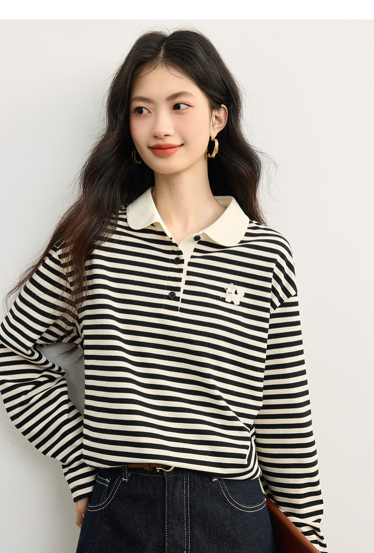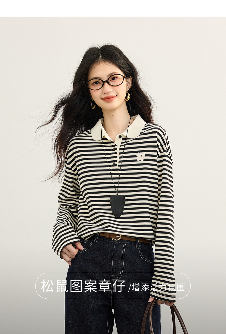 【09/10新品】熙世界航海系复古条纹POLO领T恤女长袖休闲翻领上衣2025秋季新款