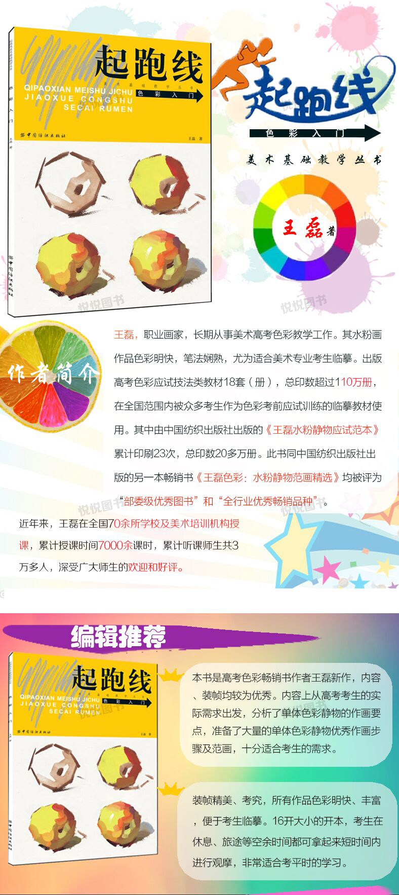 作者简介:王磊,山东龙口人,职业画家,长期从事美术高考色彩教学工作。其水粉画作品色彩明快,笔法娴熟,尤为适合美术专业考生临摹。出版高考色彩应试技法类教材18套(册),总印数超过110万册,在全国范围内被众多考生作为色彩考前应试训练的临摹教材使用。其中由中国纺织出版社出版的《王磊水粉静物应试范本》累计印刷23次,总印数20多万册。此书同中国纺织出版社出版的另一本畅销书《王磊色彩:水粉静物范画精选》均被评为“部委级优秀图书”和“全行业优秀畅销品种”。