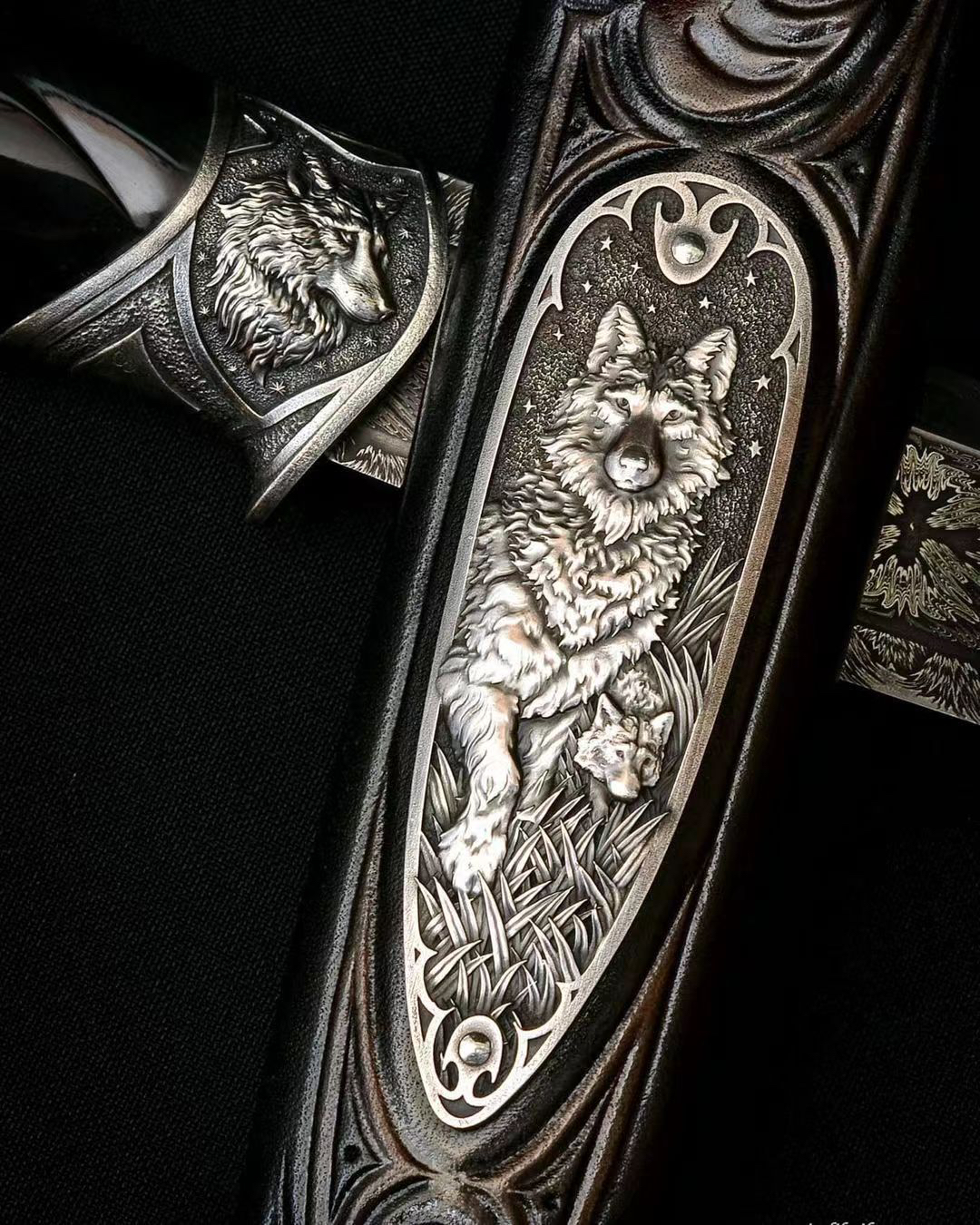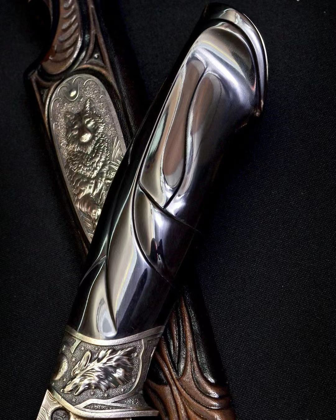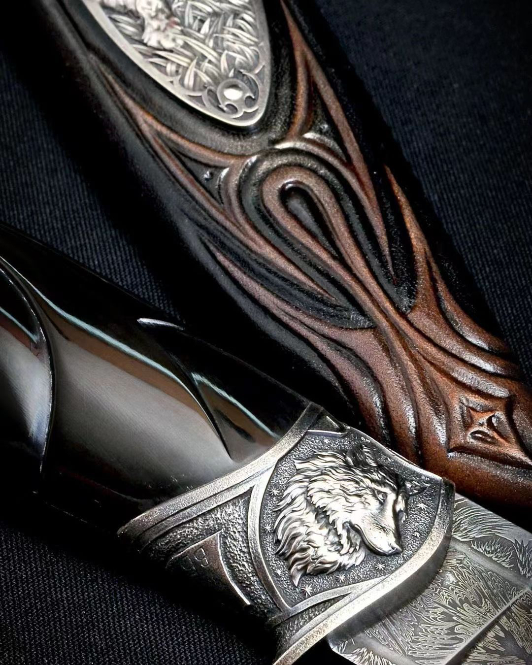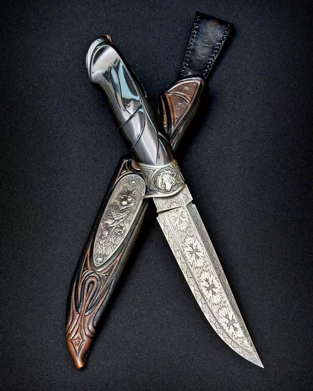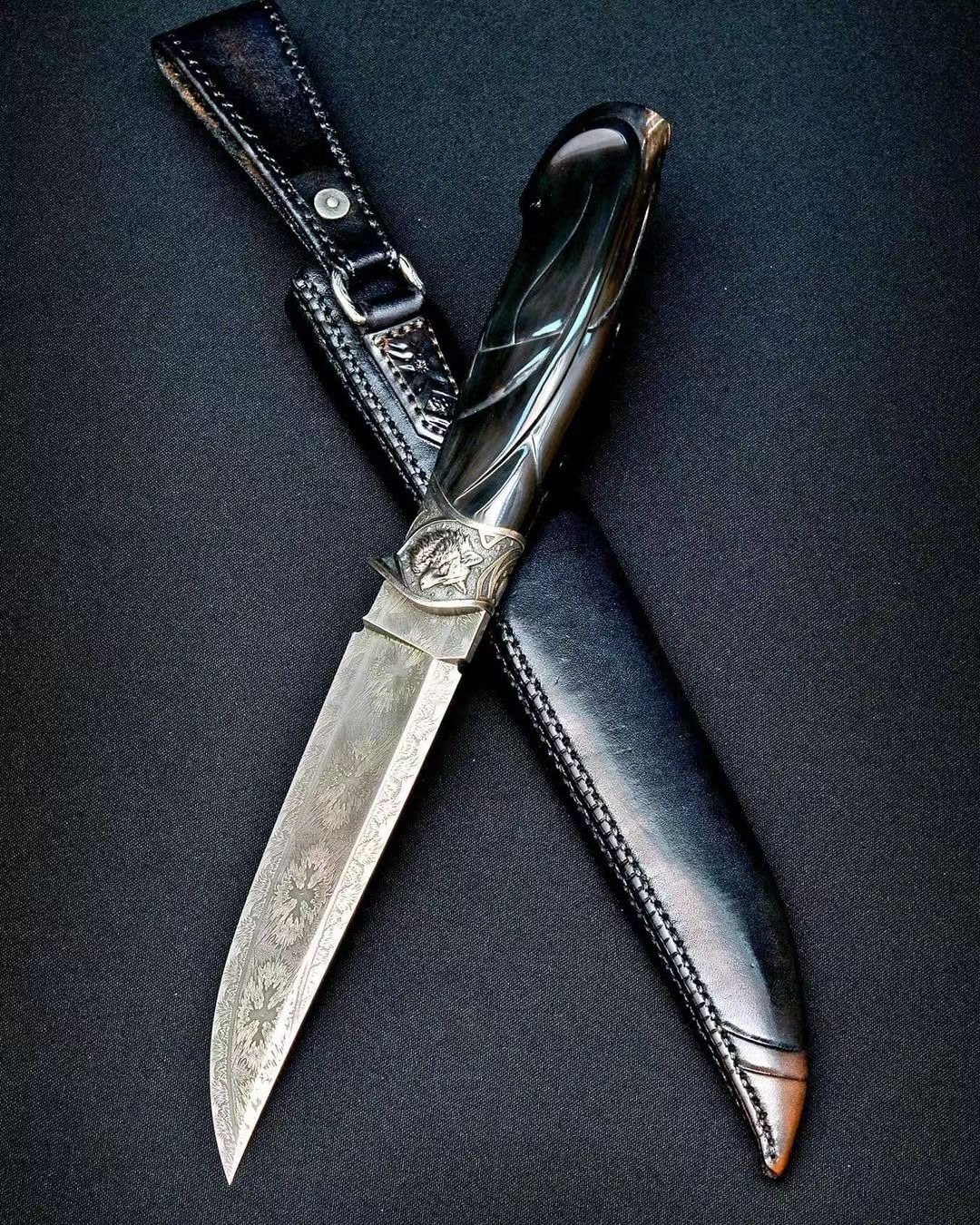 高配作品 全长25左右 专门为这只作品锻打了一块爆炸拼火山的大马士革钢 我们的经典刃型 在保证切割性能的同时增强了穿刺性能也提升了刃部的强度 纹路不用说了 应该是相当有意思的 全套的纯银金属配件 都是手工一点点雕刻出来的 立体自然 栩栩如生 用了很好的一块水牛角作为柄材 手工雕刻造型贴合手柄 特别是尾部的这一点返角相当帅气配个手工皮鞘 还不错的一只高配作品