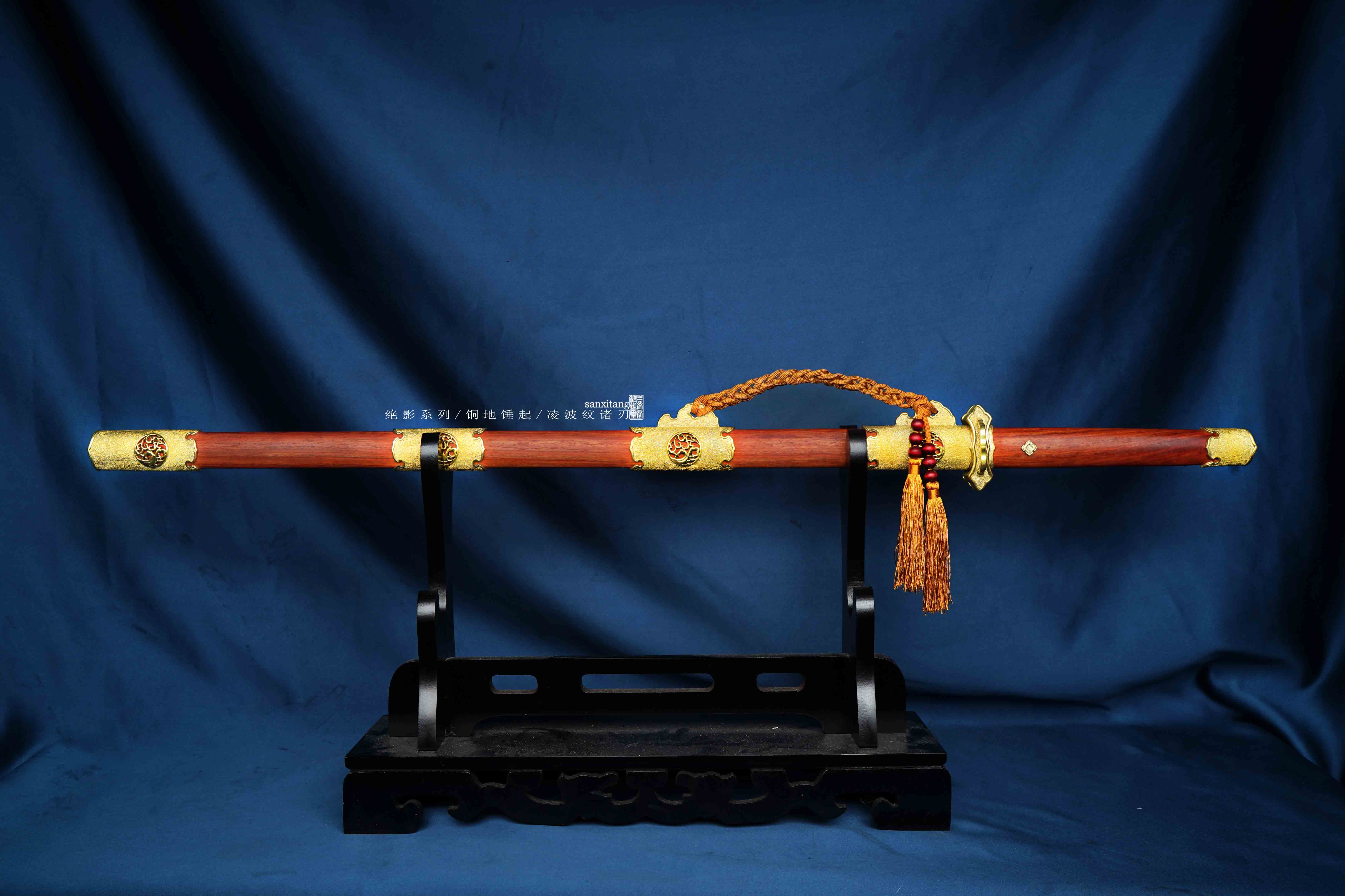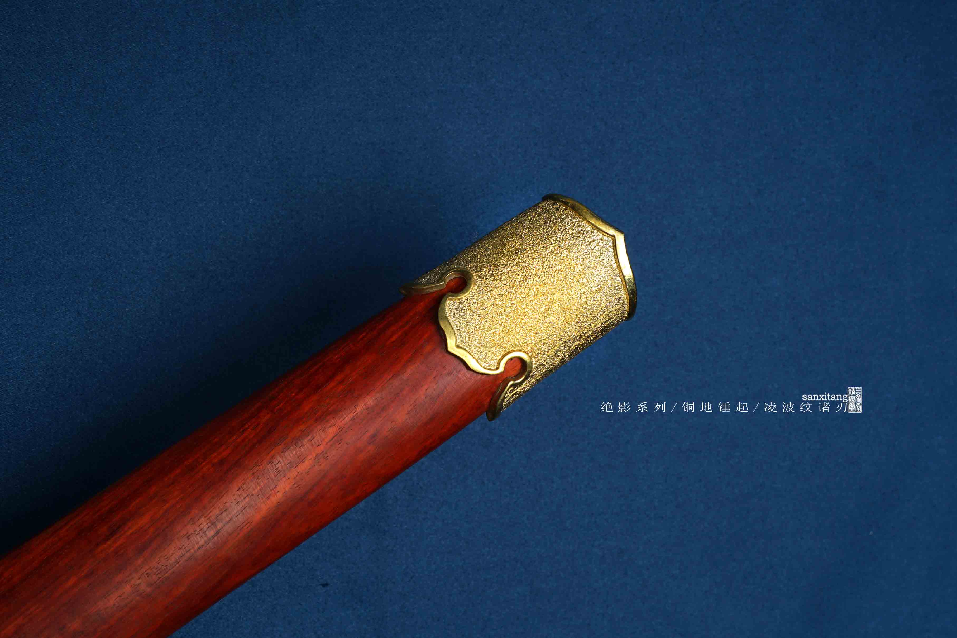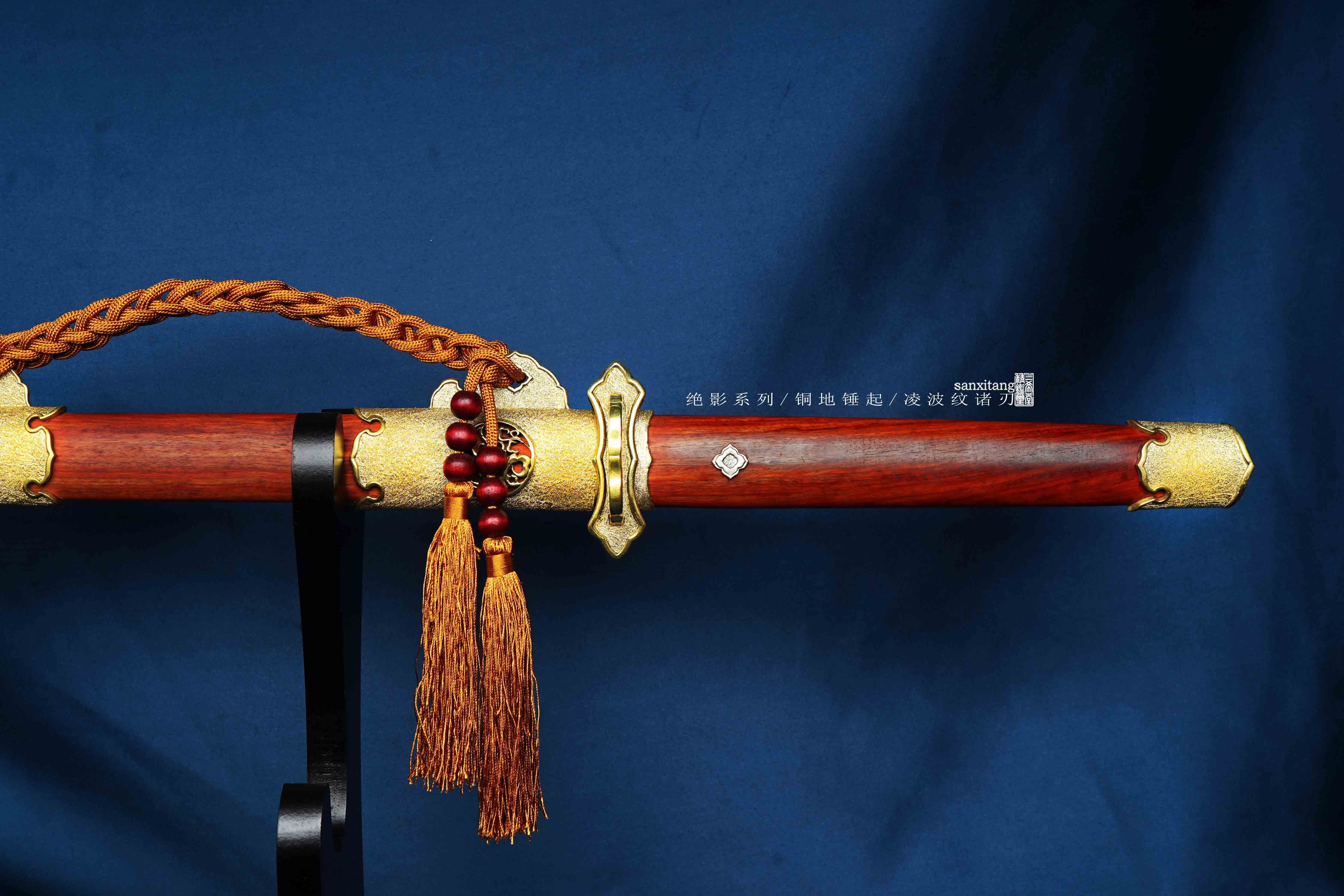 凌波纹诸刃版,加了一点点陨铁,价格很合适,铜地霜金金具,老血檀木鞘,越盘颜色越深