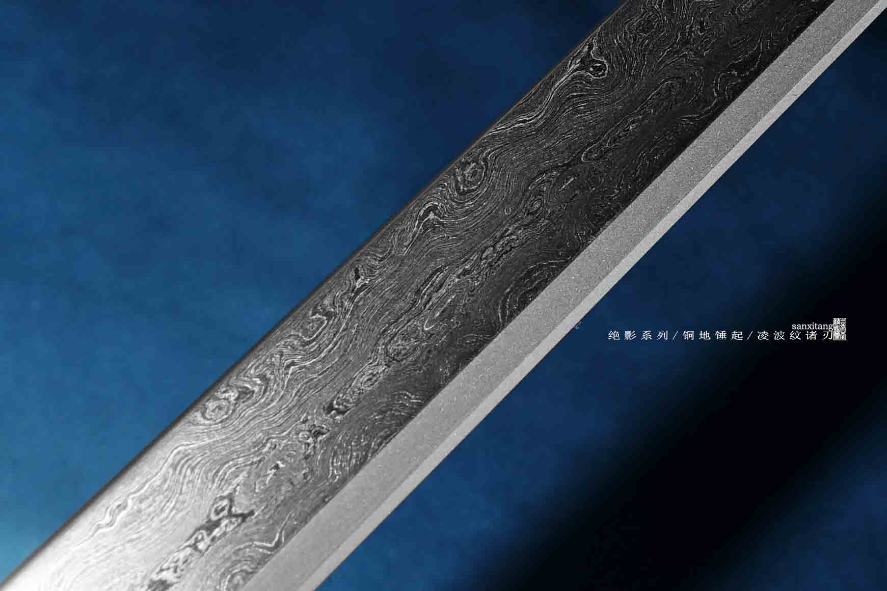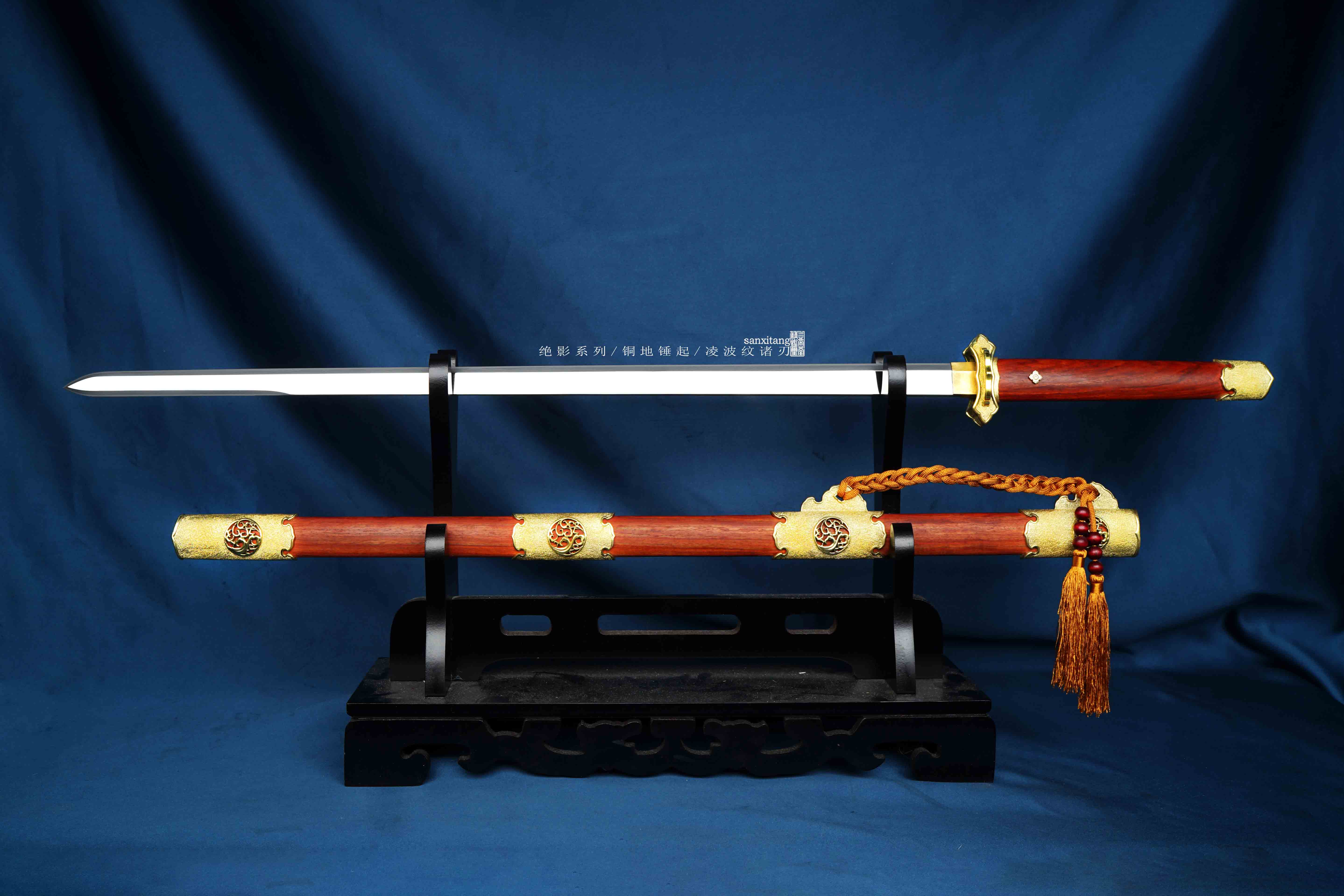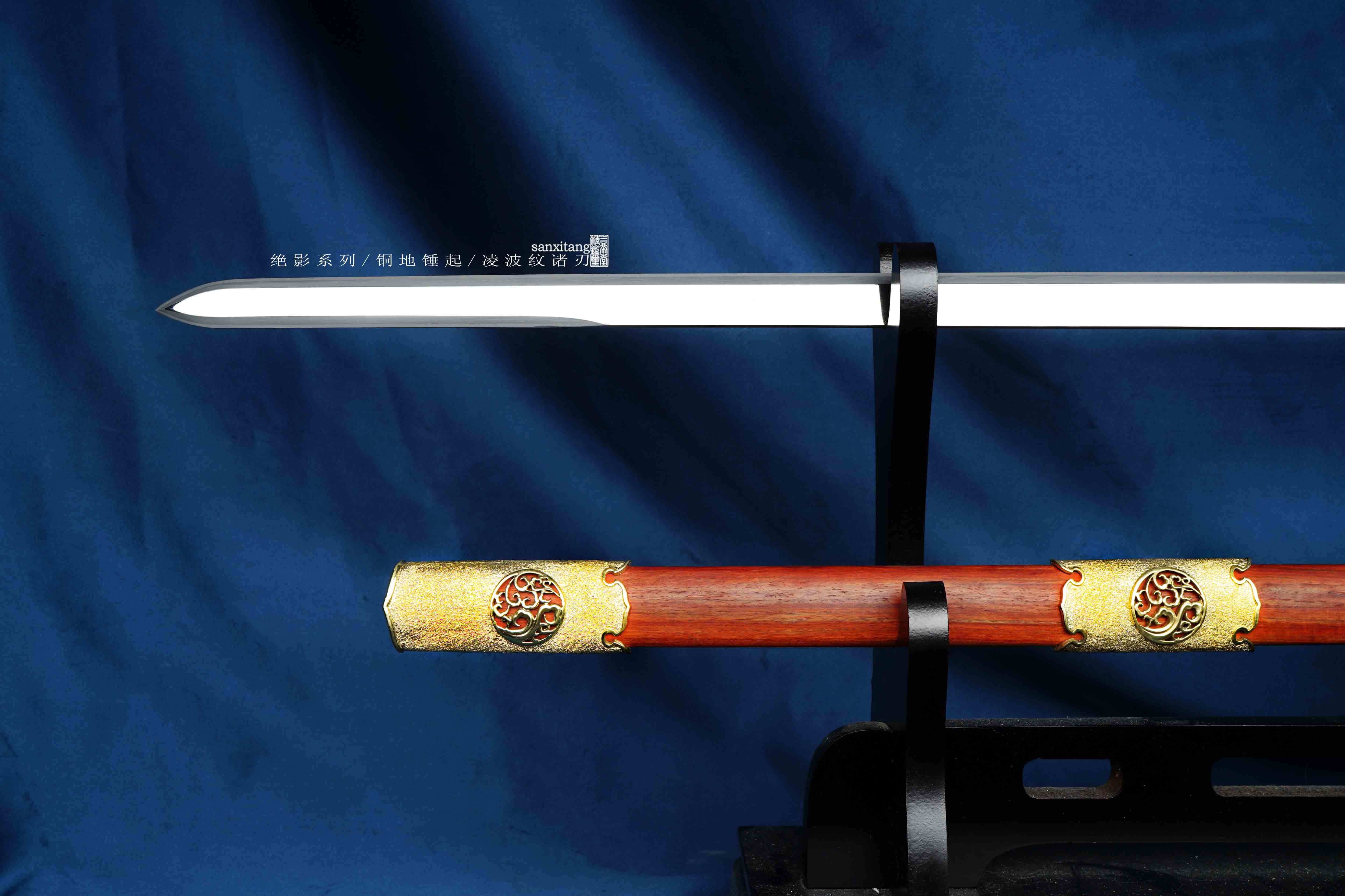 凌波纹诸刃版,加了一点点陨铁,价格很合适,铜地霜金金具,老血檀木鞘,越盘颜色越深