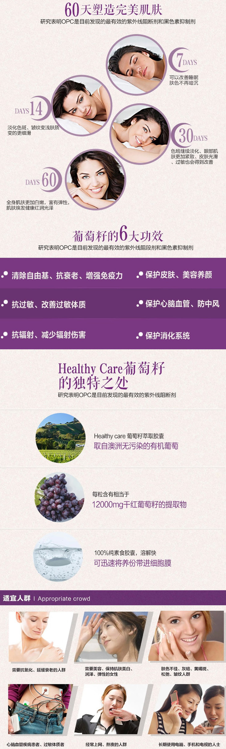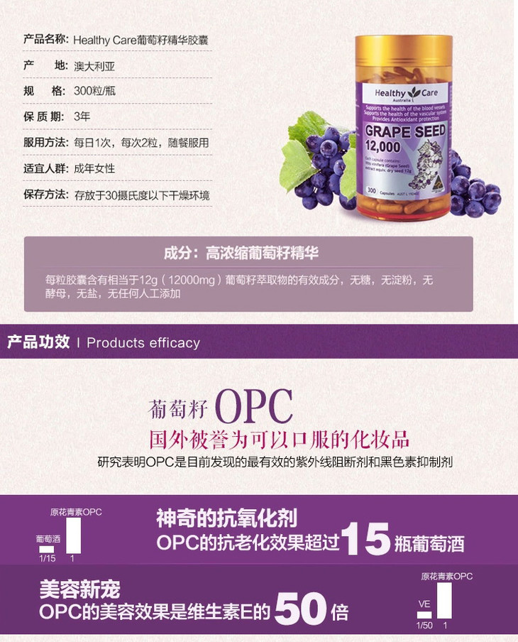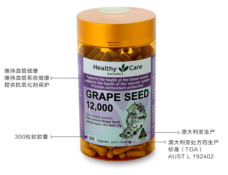 葡萄籽的主要提取物原花青素(OPC)可是世界上公认的最佳女性抗衰老营养补充品。这款葡萄籽萃取胶囊每粒含有相当于12000mg干红葡萄籽的提取物,溶解快可迅速将养分带进细胞膜,长期服用可维持皮肤极佳状态。