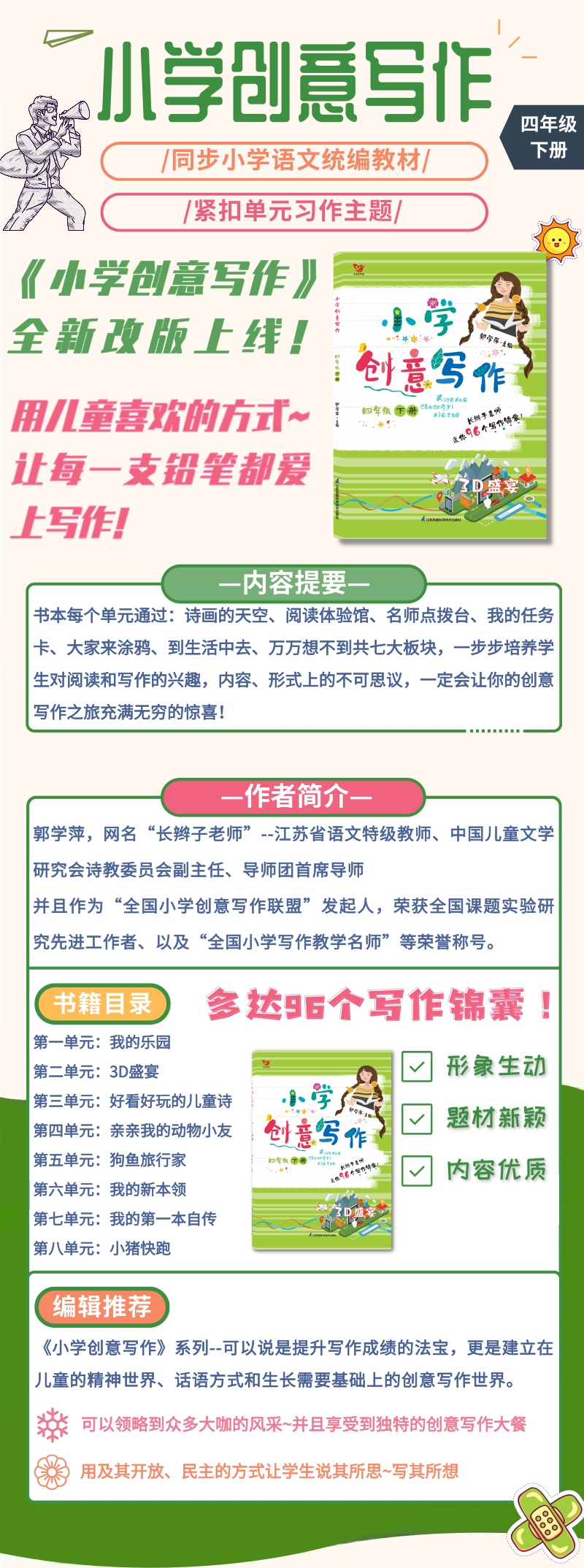 长辫子老师领衔主编,同步小学语文统编教材,紧扣单元习作主题, 6个年级,12册,96个单元,96个写作锦囊!它们是提升写作成绩的法宝,更是建立在儿童的精神世界、话语方式和生长需要基础上的创意写作世界。