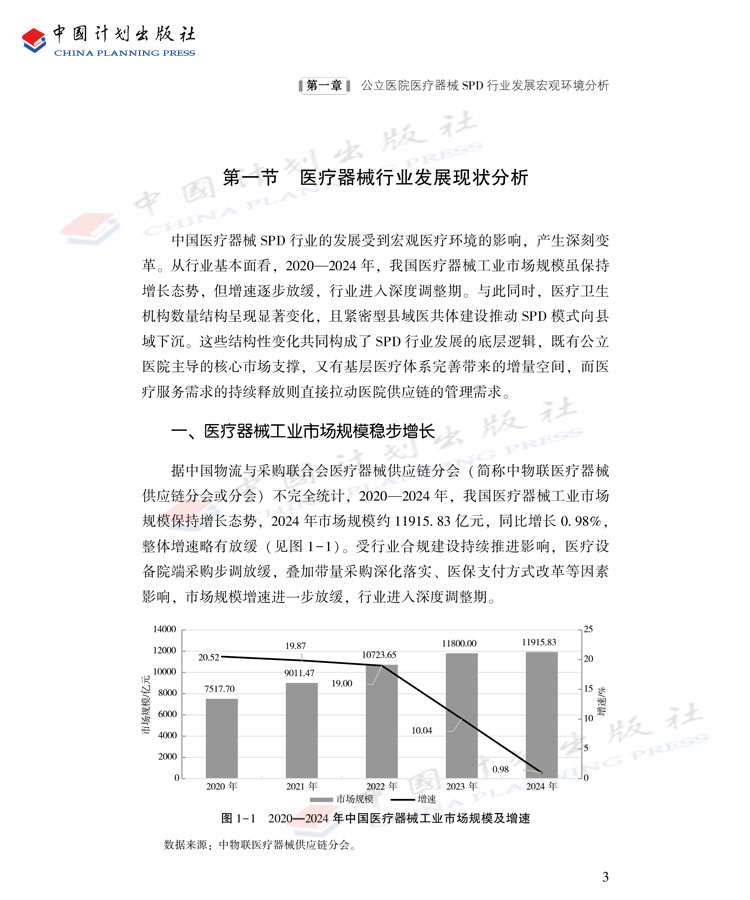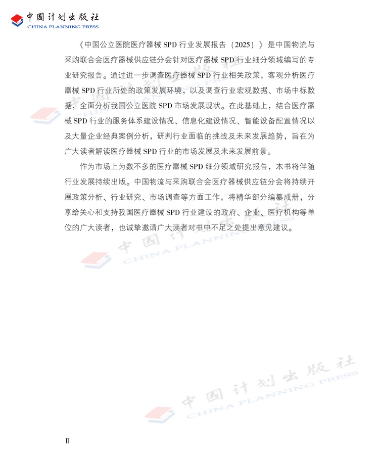 《中国公立医院医疗器械SPD行业发展报告(2025)》是中国物流与采购联合会医疗器械供应链分会编写出版的医疗器械SPD行业领域细分研究报告。本年度报告通过对医疗器械SPD行业相关医改政策调查,分析利好SPD行业发展宏观政策环境;通过对行业宏观数据、市场中标数据、人才发展数据调查,分析医疗器械SPD市场发展现状。在此基础上,结合医疗器械软硬件发展现状、业务发展模式、具体企业案例等,研判行业面临的挑战及未来发展趋势。具有理论研究价值。