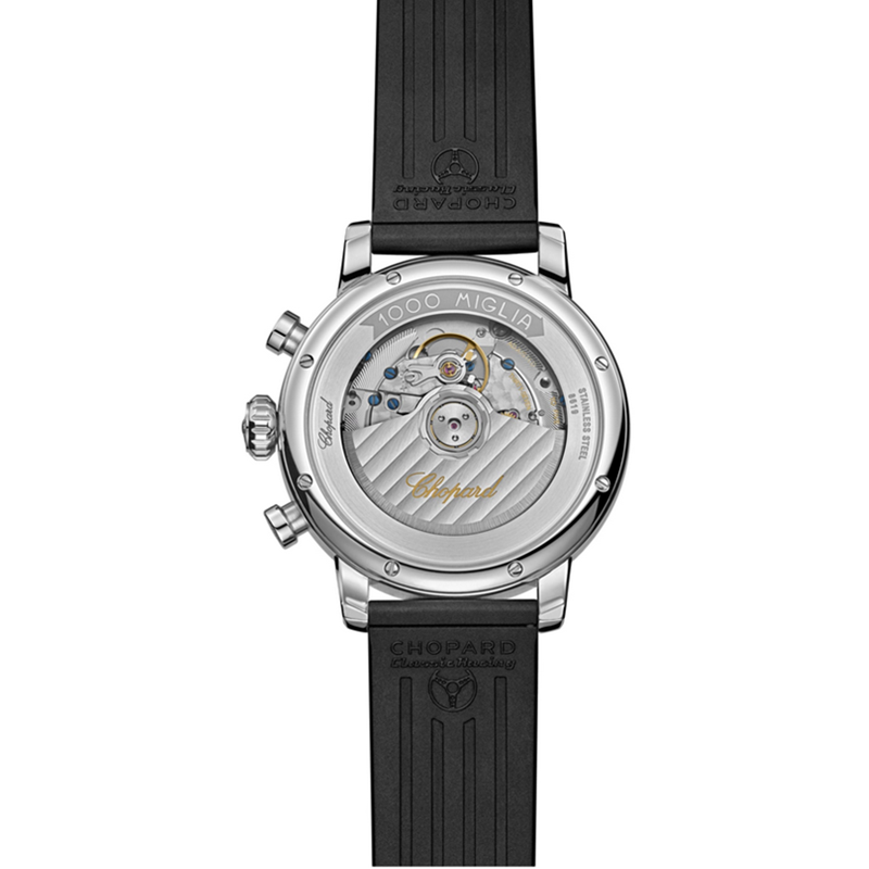 镜面材质 | 蓝宝石水晶玻璃 | 表盘 | 精钢表壳 黑色表盘, 电镀处理竞速黑(Nero Corsa)木塞纹表盘,铁轨分钟圈及测速计刻度圈,配有白色移印数字及刻度,红色1000 Miglia标志,时标覆有SuperLuminova® Grade X1荧光涂层,黑色蜗纹小秒盘和计时盘,镀铑棒形时针和分针,覆有SuperLuminova® Grade X1荧光涂层,镀铑棒形计时盘指针,镀铑中央红色针尖秒针 日期显示 动力储备显示 背透,外缘饰有1000 Miglia标志 |