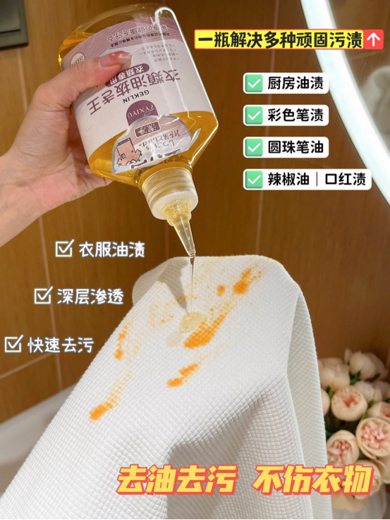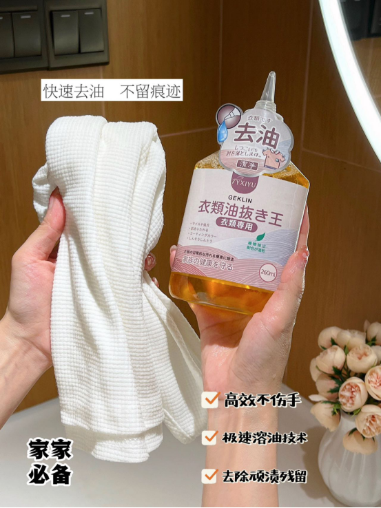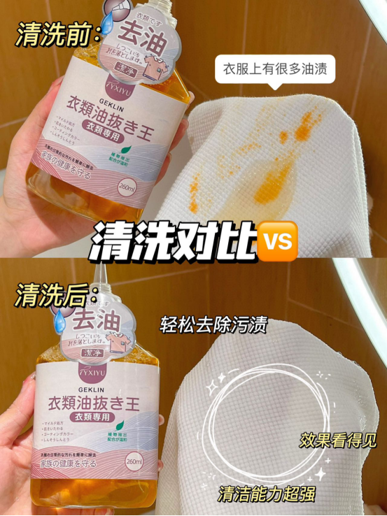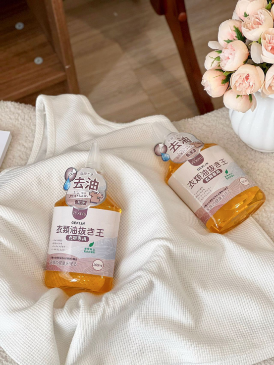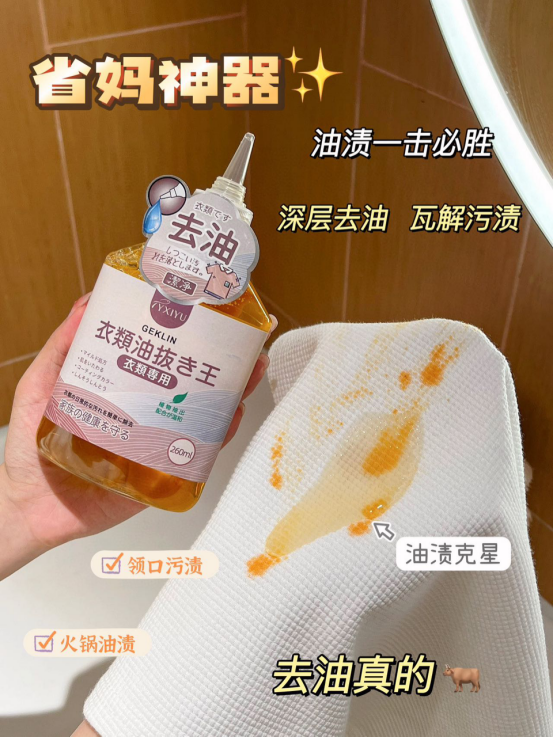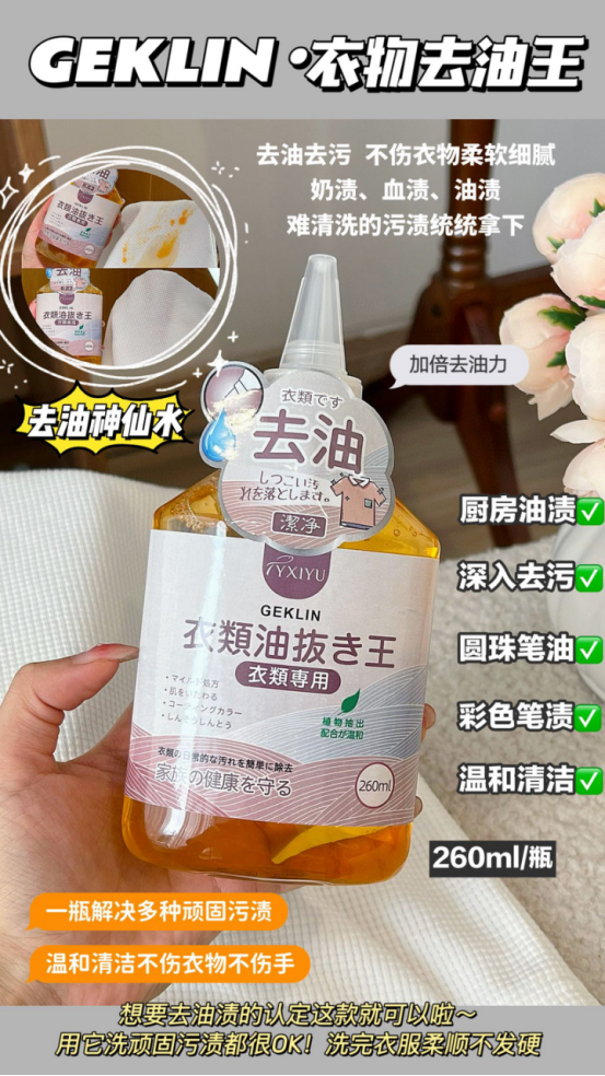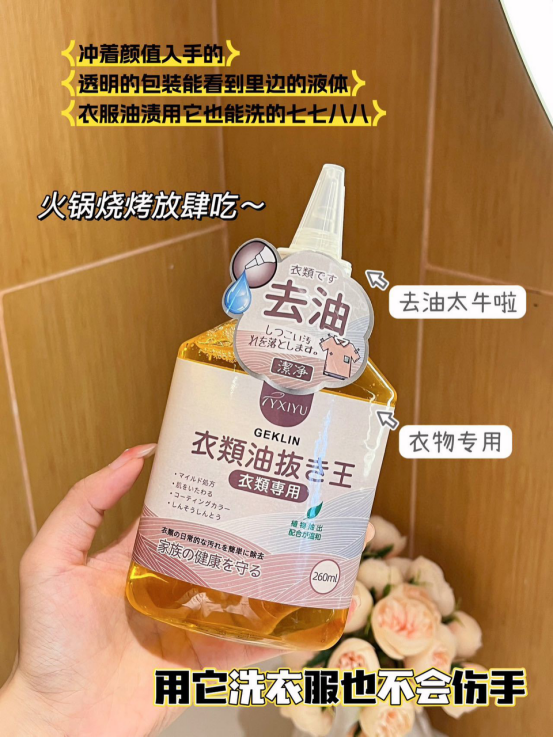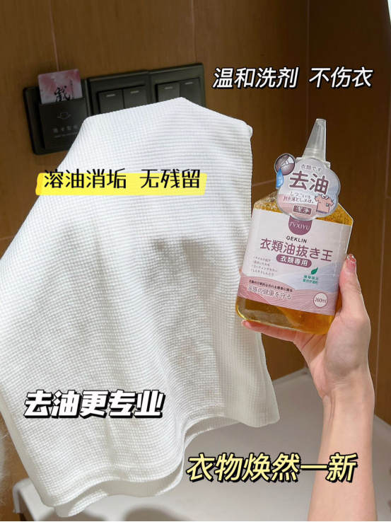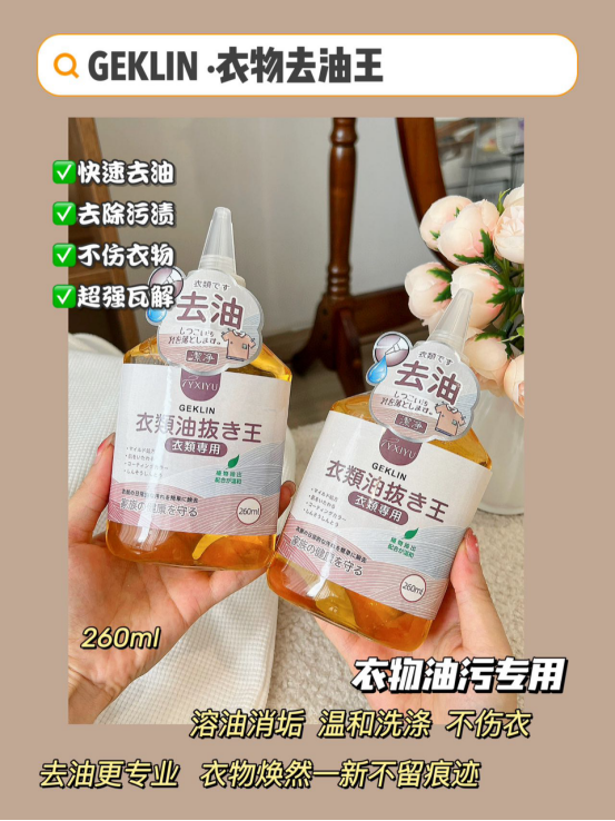 GEKLIN ·衣物去油王,净含量:260/瓶 就是这玩意儿拯救了我的油渍卫衣 很喜欢的一件卫衣 但是沾上了油,怎么也洗不掉 然后某音上刷到了这个去油王 回来试试看看能不能挽留一下~ 结果真的惊讶住了,和新买来的时候一样 让我体验到了清洁的力量也让我感受到了生活的诗意