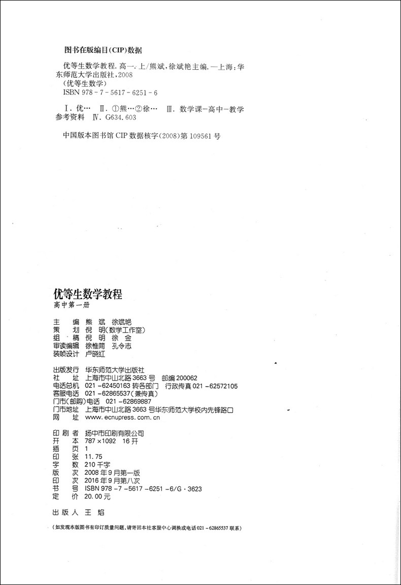优等生数学教程 高中第一册(共4册)上海十大名牌高中联编直击名牌大学 华东师范大学出版社