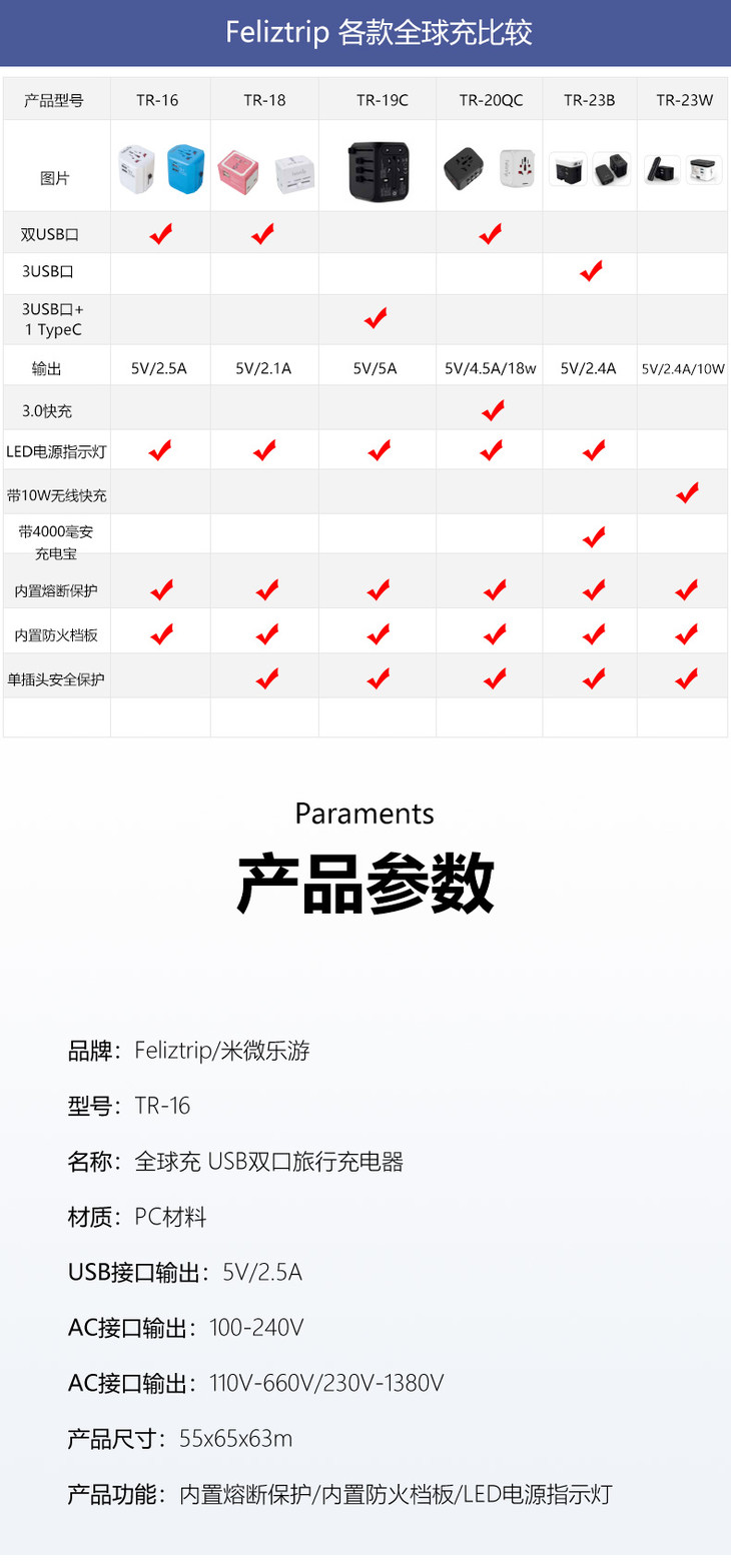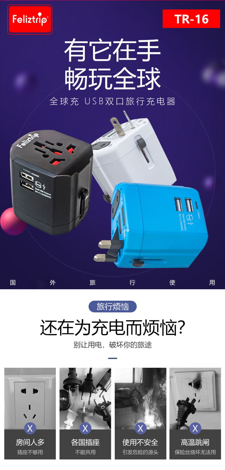 Feliztrip斐利斯 出国旅行多国通用带usb输出无需变压电源转换插座 TR-16