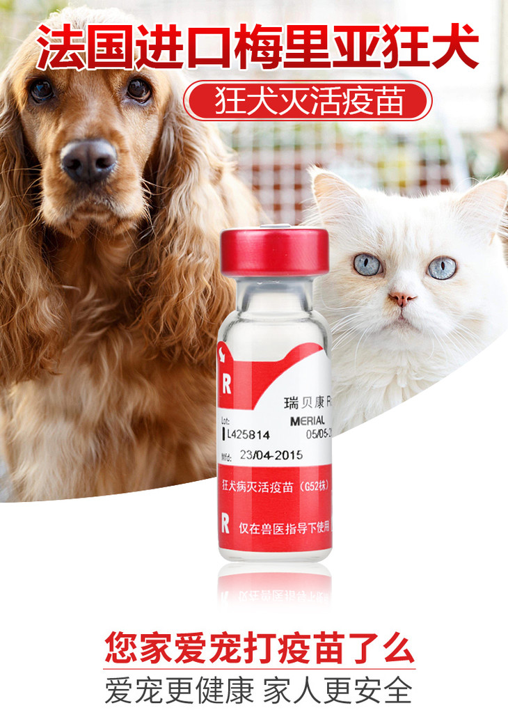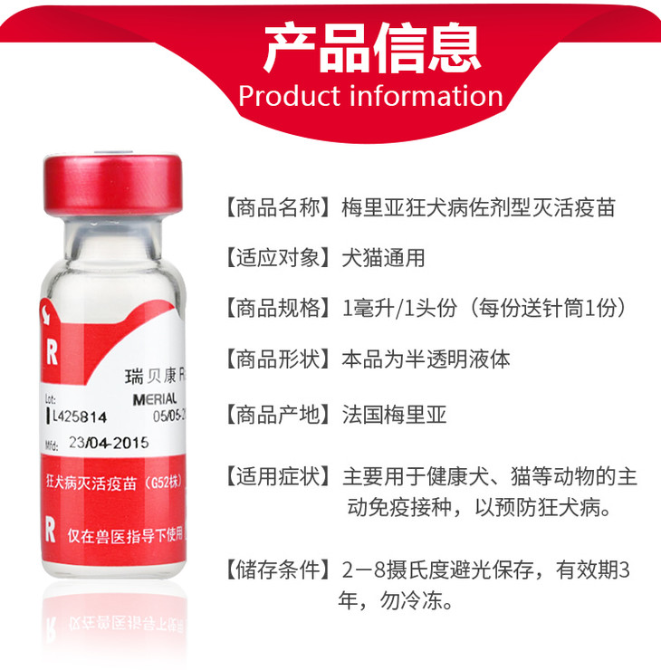 梅里亚 瑞贝康 (狂犬苗)有效期2027.2.5到期主要用于健康犬、猫等动物的主动免疫接种,以预防狂犬病