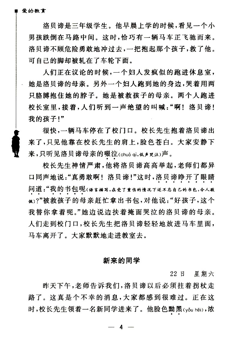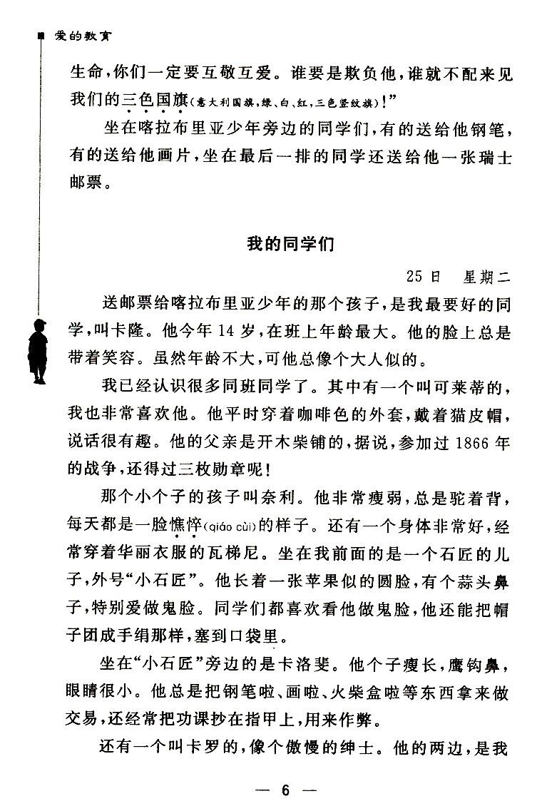 我的弟弟被分在女老师德尔卡蒂的班里,我被分在二楼佩尔博尼老师的班里。十点钟,我们大家都进入教室,一共五十四个人,其中只有十五六个是我二年级的同学,这中间有德罗西,就是总得头等奖的那位。想到夏天时我所玩耍的树林和山脉,就会觉得学校是如此狭小和令人忧伤!我还想到二年级的老师,他是如此善良,总是对我们微笑。他身材瘦小,就像我们的一个同学,我很遗憾再也见不到他和他蓬乱的红色头发了。我们现在的老师个子高高的,没有胡子,头发是灰色的、长长的,额头上有一道笔直的皱纹,声音粗大。他目不转睛、一个一个地打量着我们所有人,好像要看透我们的内心。