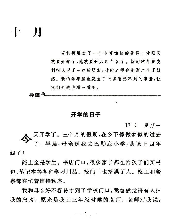 今天是开学的第一天。乡下那三个月的假期如同一场梦似的过去了!今天早晨,我母亲领我到巴雷蒂分校去注册三年级,而我却想着乡下,去得很不情愿。所有的街道上都是来来往往的孩子,两个文具店里挤满了买背包、书包和笔记本的父亲和母亲们。而在学校的门前,人们更是挤得水泄不通,以至于工友和公民卫队要花很大的力气才能保持校门口的畅通。在学校大门口,我感到肩膀被人碰了一下,那是我的二年级老师,他长着一头蓬乱的红色头发,总是很快活的神情。老师对我说: