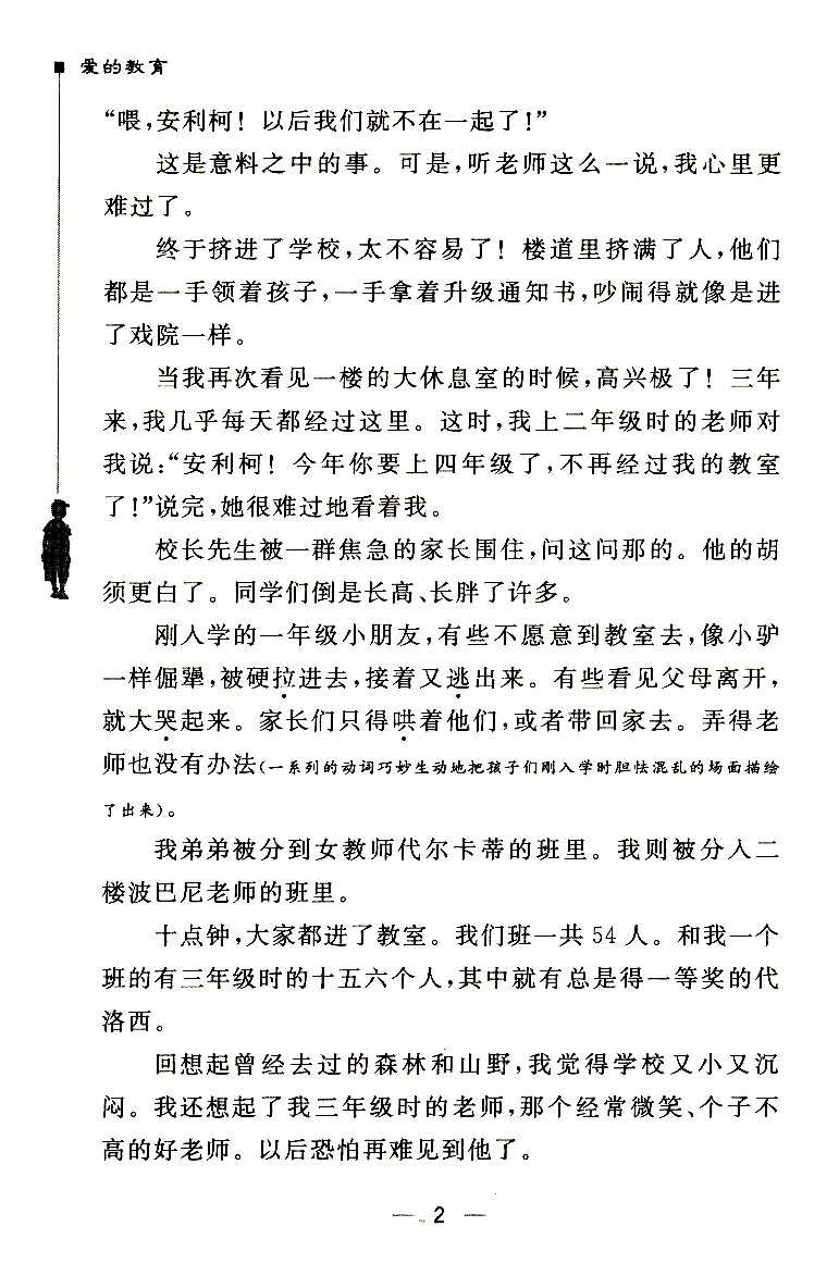 “恩里科,好好用功啊!我们将会一起学习。”我高高兴兴地回到家里。然而,我却再也没有二年级老师了,他那么快活,笑容可掬。我觉得学校再也不像从前那样美好了......