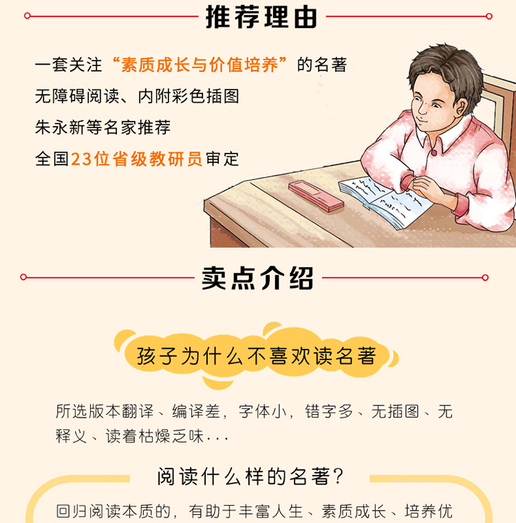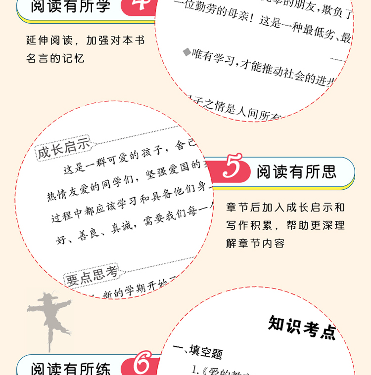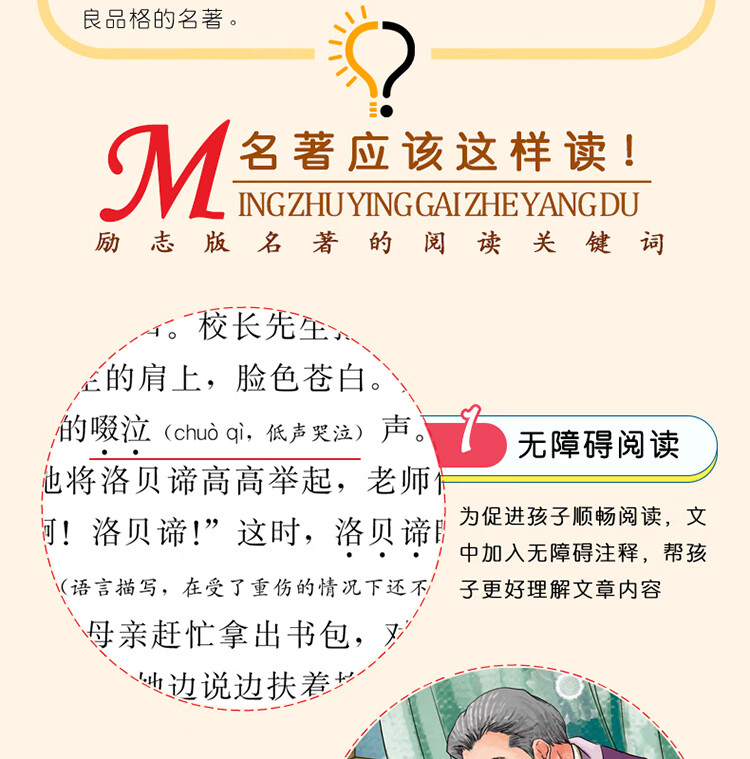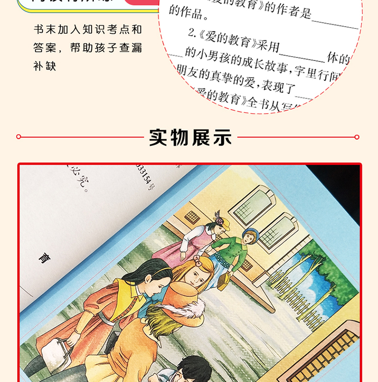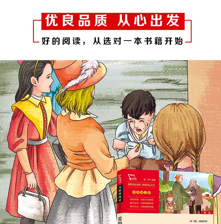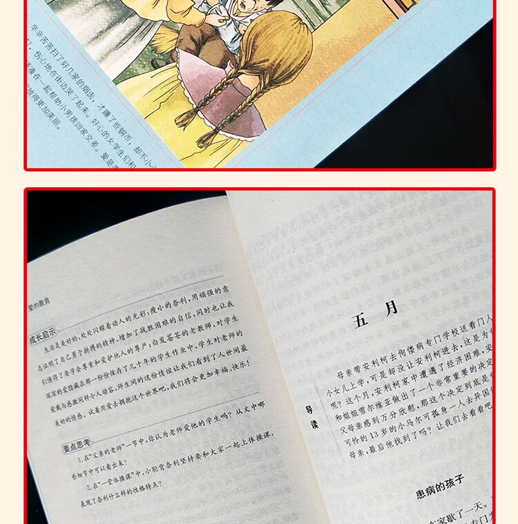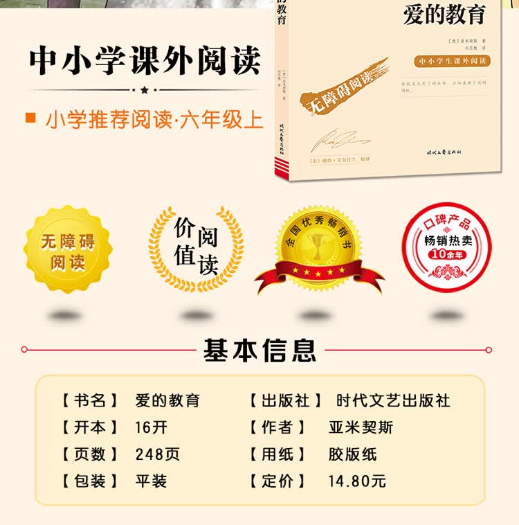 《爱的教育》是意大利作家亚米契斯耗时10年创作完成的。全书采用日记体的形式,讲述了一个叫安利柯的四年级小男孩的成长故事,因此书名又叫《一个意大利四年级小学生的日记》。内容主要包括发生在安利柯身边各式各样感人的小故事、父母在他日记本上写的劝诫启发性的文章,以及老师在课堂上宣读的精彩的“每月故事”。每章每节,都把“爱”表现得精细深入、淋漓尽致,大至国家、社会、民族的大我之爱,小至父母、师长、朋友间的小我之爱,处处扣人心弦。而那众多丰满的人物也给我们留下了深刻的印象,比如怀有侠义之举且让安利柯深以为傲的好友卡隆;品学兼优、助人为乐的班长代洛西;虚荣狭隘的瓦梯尼;傲慢无礼的诺卑斯;还有朴实可爱的“小石匠”;坚强不息的克洛西……
