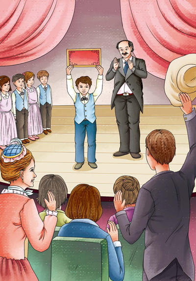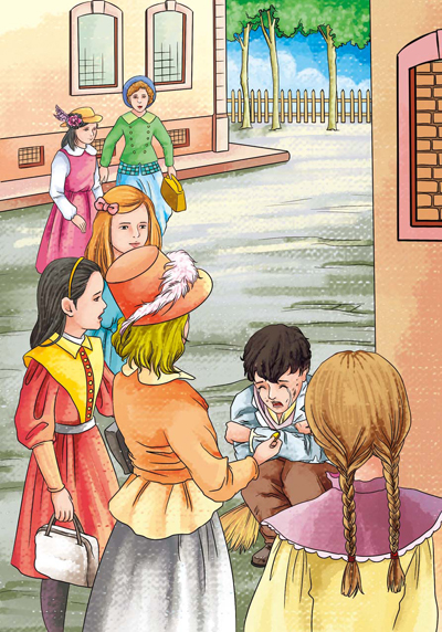 我早知如此,然而那些话还是让我难过。我们勉强挤进学校。贵夫人、先生们、普通女人、工人、军官、祖母、女用人,所有的人都一手领着孩子,一手拿着升级通知书,挤满了传达室和楼道,发出一片嗡嗡声,就像进入戏院一样。我很高兴又看到了那间一楼的大厅,它连接着七个班级的房门,三年以来,我几乎每天都经过这里。人们排成了队,女教师们来来往往。我的高小一年级女老师在教室门口跟我打招呼并对我说:“恩里科,今年你去楼上上课了,我就再也看不到你从这儿经过了!”她很难过地望着我。