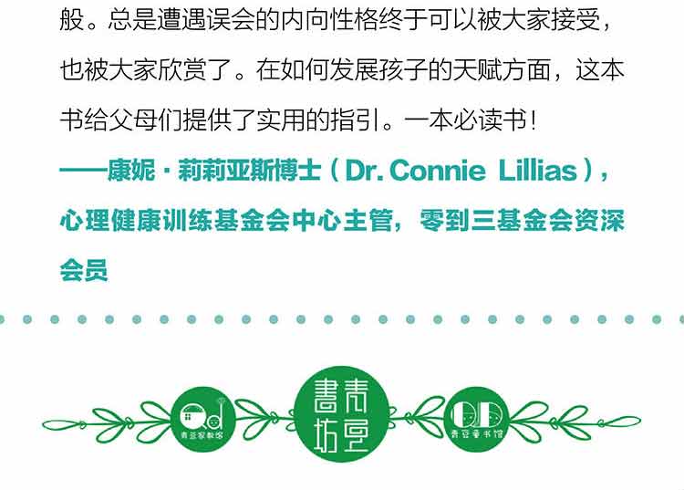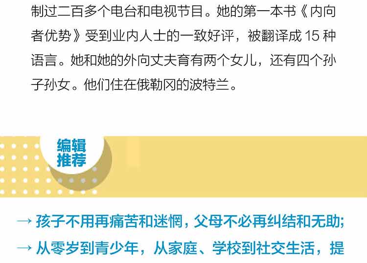 作者说:“性格内向的孩子通常是‘大器晚成’者……如果成年人能帮助内向的孩子认识到自己的长处并鼓励他们珍视自己的能力,他们的童年就不会在痛苦和迷惘中度过。当内向的孩子得到他们所需的帮助后,他们的潜能就会得到发挥,而所有的人也将从中获益,因为,这个世界会因为他们的存在而更加美好。”