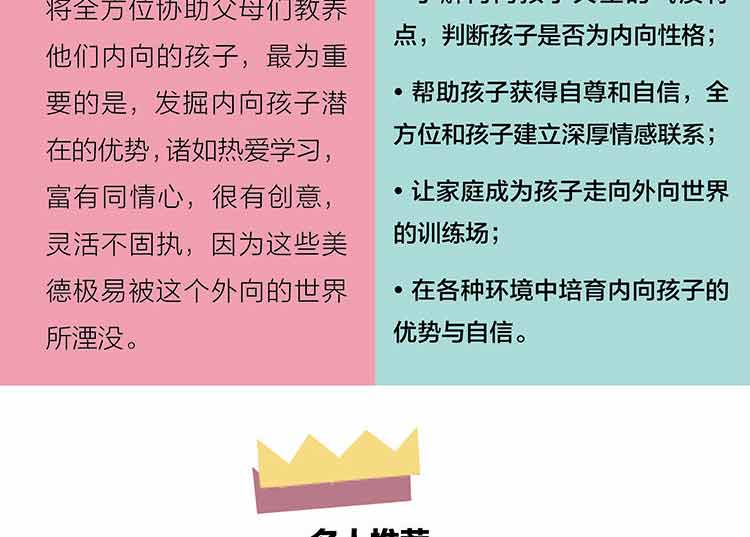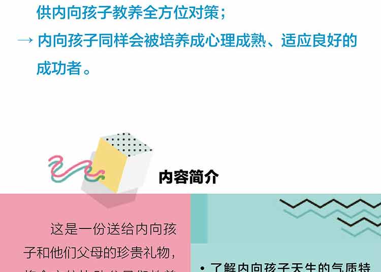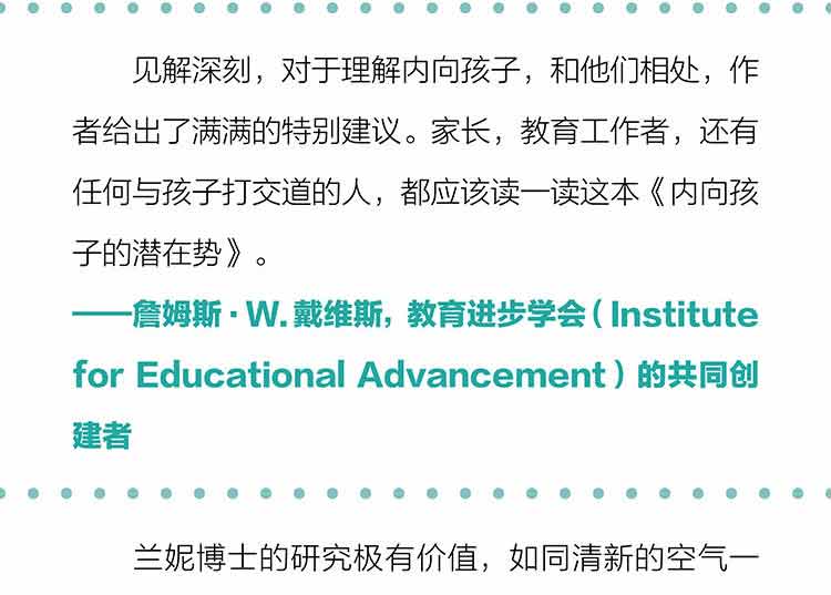 全书内容极为丰富,可以说养育一个内向孩子所需要的一切都在书中可以找到。所以著名心理学家、美国心理学会主席菲利普·津巴多博士推荐说:“这本书为内向孩子的家长指明了如何在了解孩子个性的基础上养育他们,引导他们参与社交活动,作者提出了实用的应对策略,并提供了几百条有价值的技巧。这本书不仅可以帮助你使孩子在外向的世界里很好的成长,而且有助于他们获得真正的成功。”