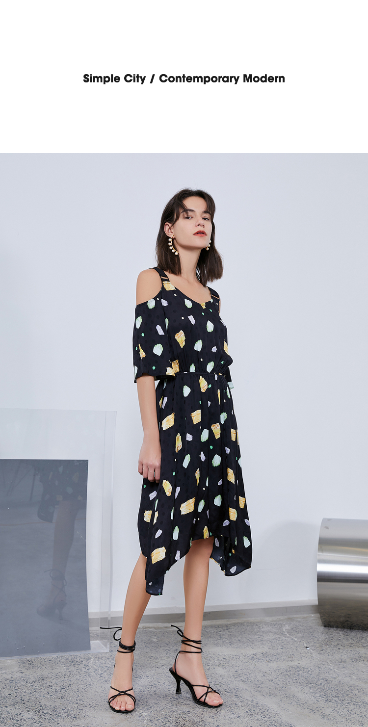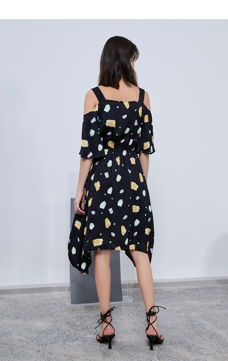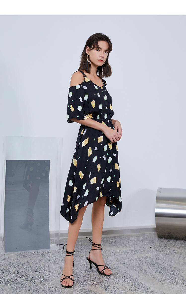 NEELLY纳俪商场同款撞色印花连衣裙女中长款露肩吊带收腰不规则裙N112005BY148
