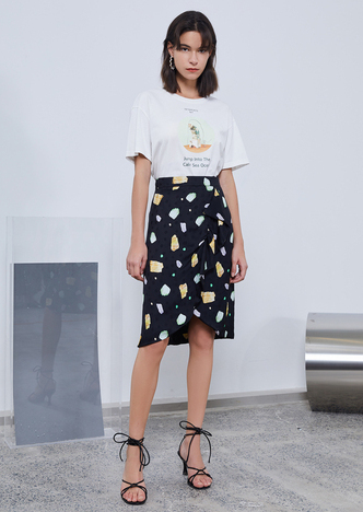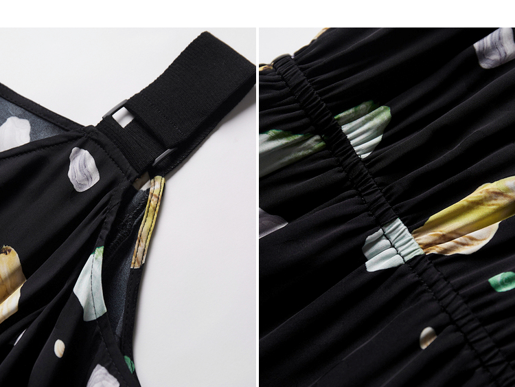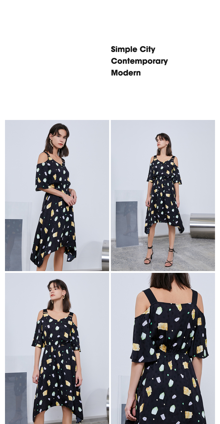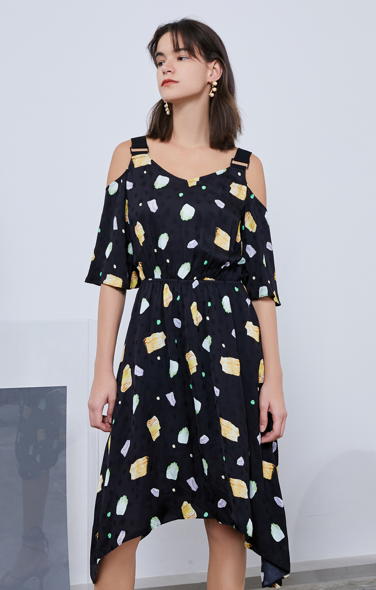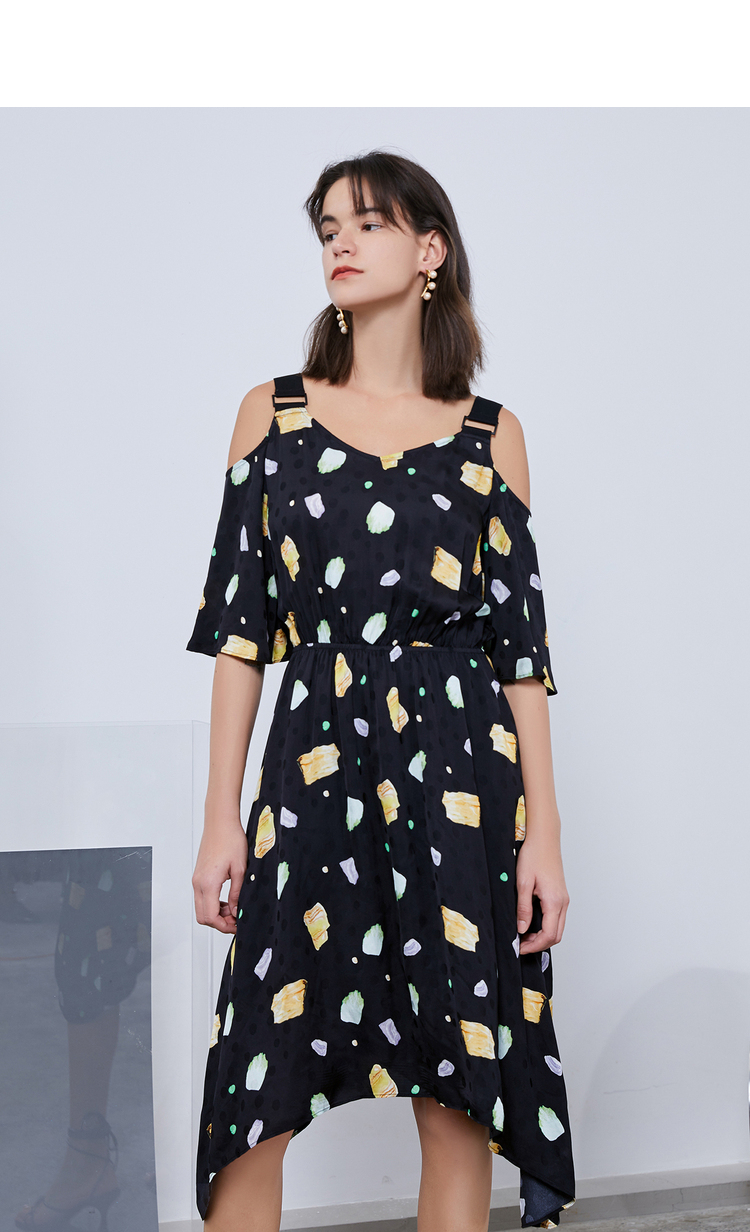 NEELLY纳俪商场同款撞色印花连衣裙女中长款露肩吊带收腰不规则裙N112005BY148