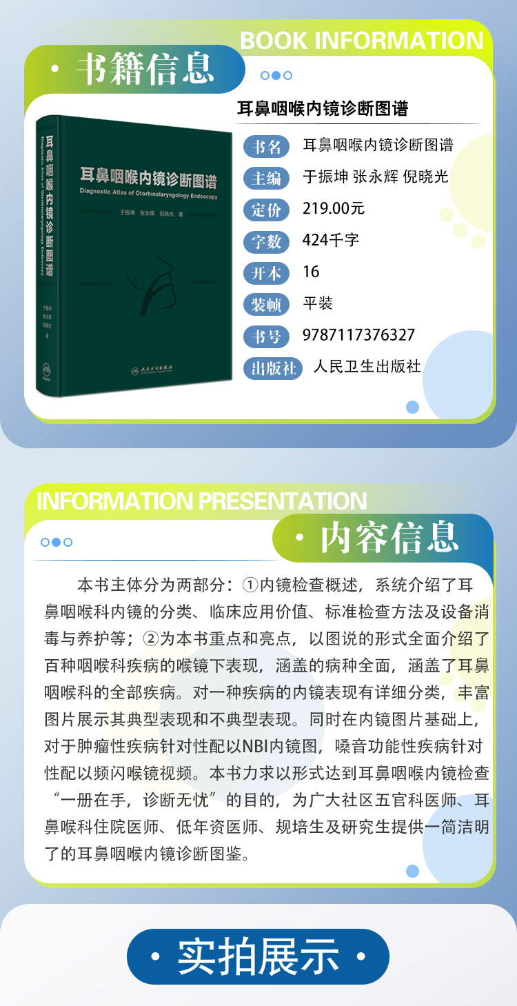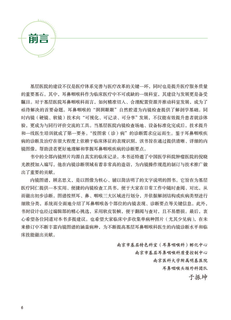 本书主体分为两部分:①内镜检查概述,系统介绍了耳鼻咽喉科内镜的分类、临床应用价值、标准检查方法及设备消毒与养护等;②为本书重点和亮点,以图说的形式全面介绍了百种咽喉科疾病的喉镜下表现,涵盖的病种全面,涵盖了耳鼻咽喉科的全部疾病。对一种疾病的内镜表现有详细分类,丰富图片展示其典型表现和不典型表现。同时在内镜图片基础上,对于肿瘤性疾病针对性配以NBI内镜图,嗓音功能性疾病针对性配以频闪喉镜视频。本书力求以形式达到耳鼻咽喉内镜检查“一册在手,诊断无忧”的目的,为广大社区五官科医师、耳鼻喉科住院医师、低年资医师、规培生及研究生提供一简洁明了的耳鼻咽喉内镜诊断图鉴。