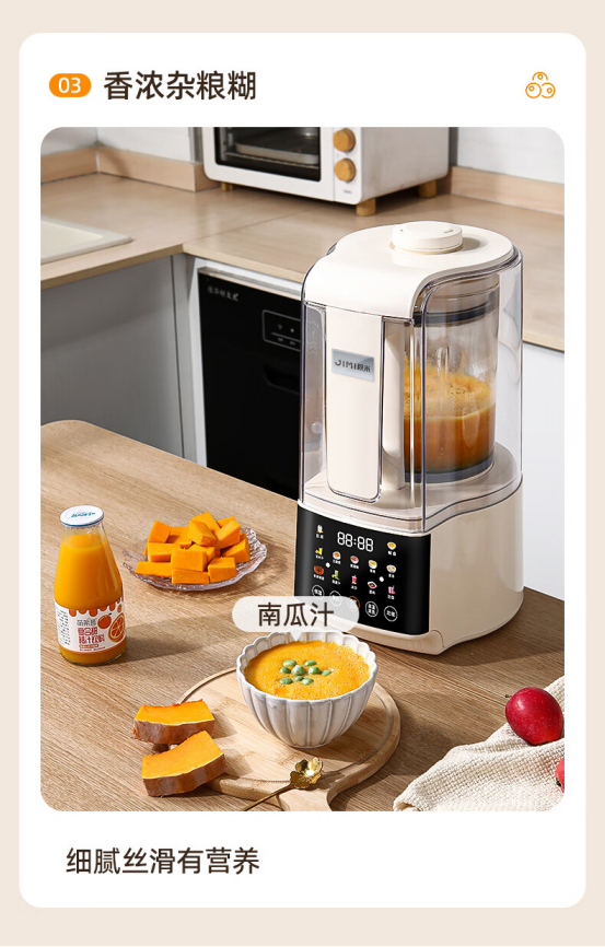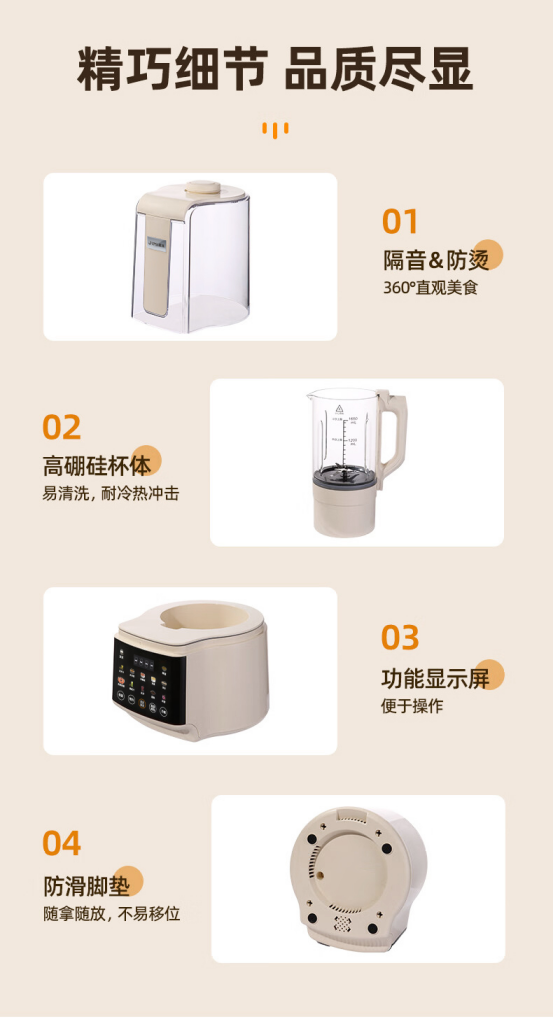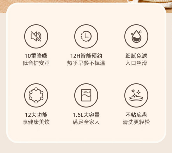 ❶、千元级别配置,强力破壁,营养更易吸收 ❷、免泡免滤,醇享丝滑好滋味 ❸、1650ml大肚杯,全家畅饮温情无“限” ❹、12大功能,享健康美饮,满足一家老少所爱 ❺、触控式大彩屏,美味触手可得 ❻、防粘食品涂层加厚高硼硅杯体 ❼、立体8叶精钢刀旋风切割,豆浆丝滑入喉 ❽、12H智能预约,热乎早餐不掉温 ❾、10重降噪,安睡不扰眠,让润养更静一步 ❿、微电脑全智能控温分段变频煮不溢出 ⑪、一键高温清洗,省心省力,告别污垢 ⑫、整机分体式设计,摆脱笨重,更易清洗